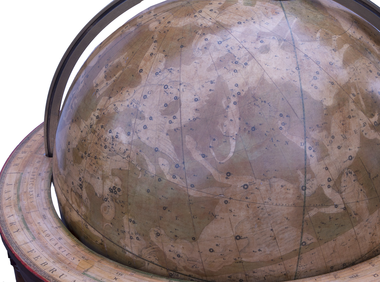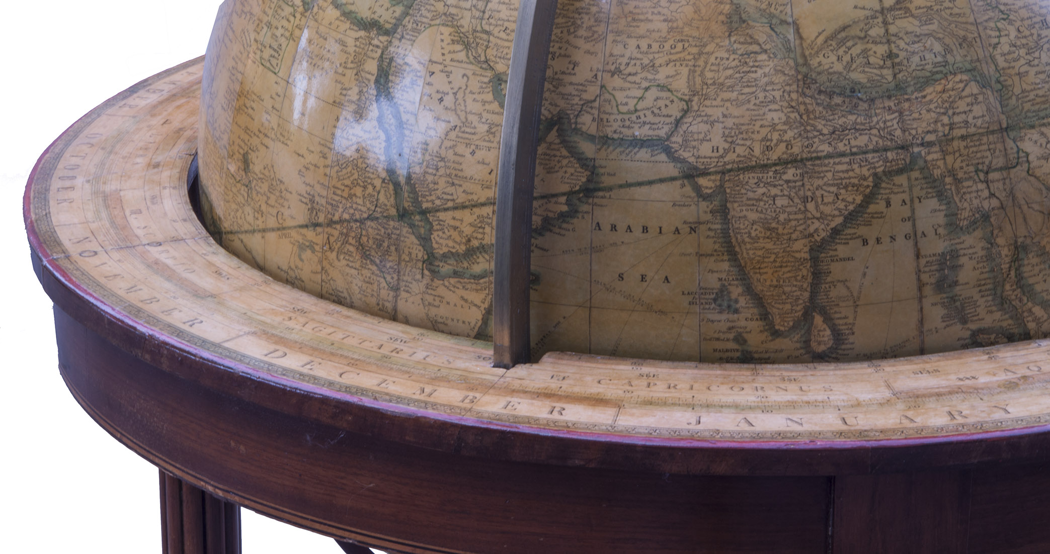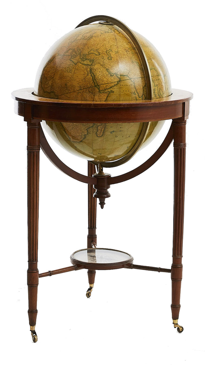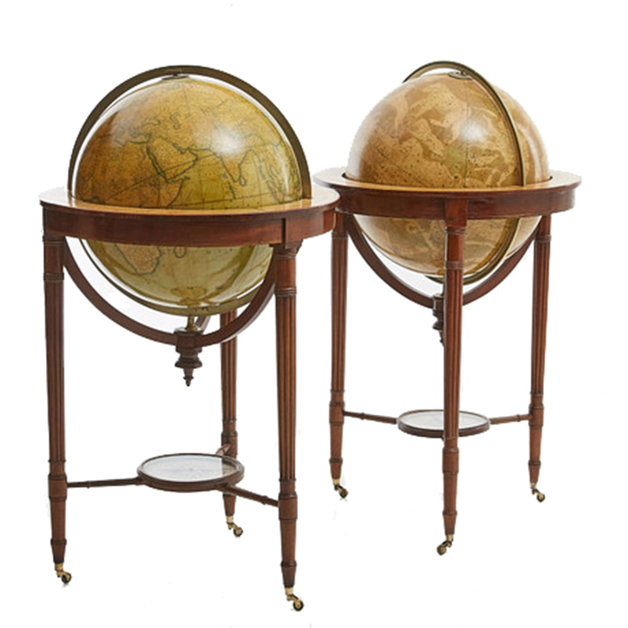 A matching pair of terrestrial and celestial globes (53 cm diameter) each made a hollow paper-marché core (2 hemispheres, joined at the equator), covered with a layer of plaster and 12 hand-coloured, engraved gores, showing the terrestrial geography and celestial bodies in great detail. Each globe mounted in a mahogany tripod stand on small wheels. With a compass (diameter: 25 cm) at the base of each stand; graduated brass meridian ring and engraved graduated horizontal rings (paper pasted on the mahogany frame) showing the months of the year, the zodiac signs and wind directions.