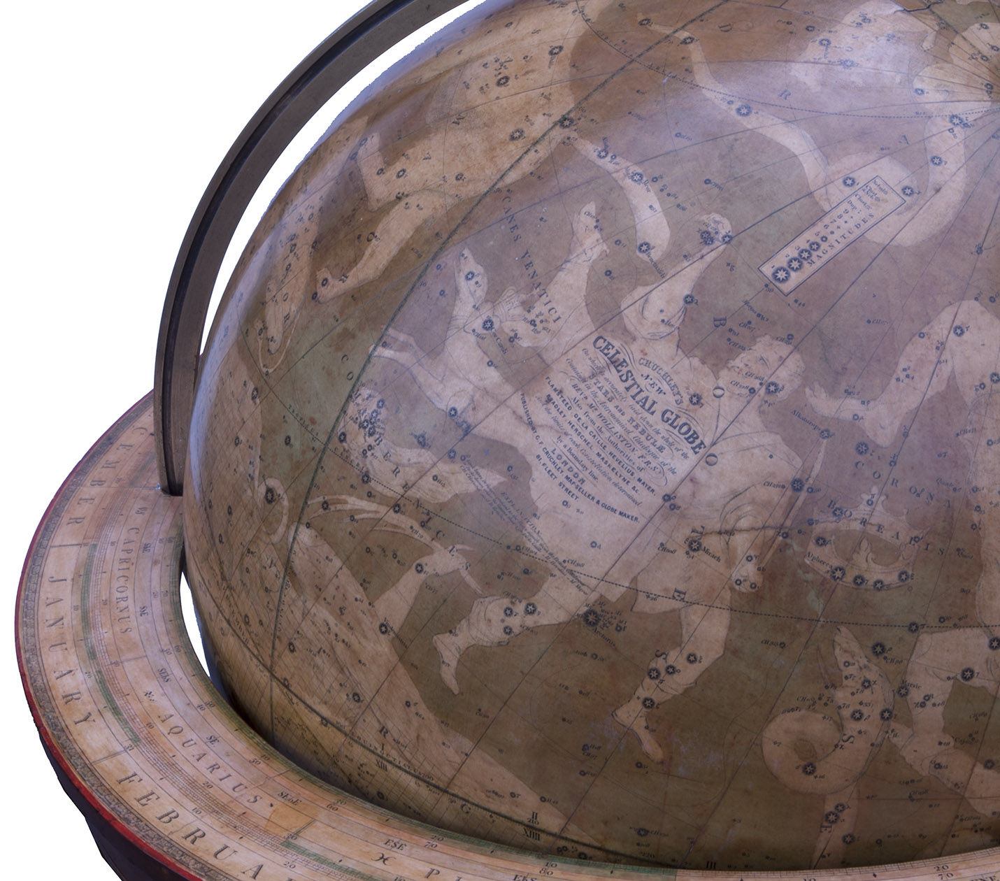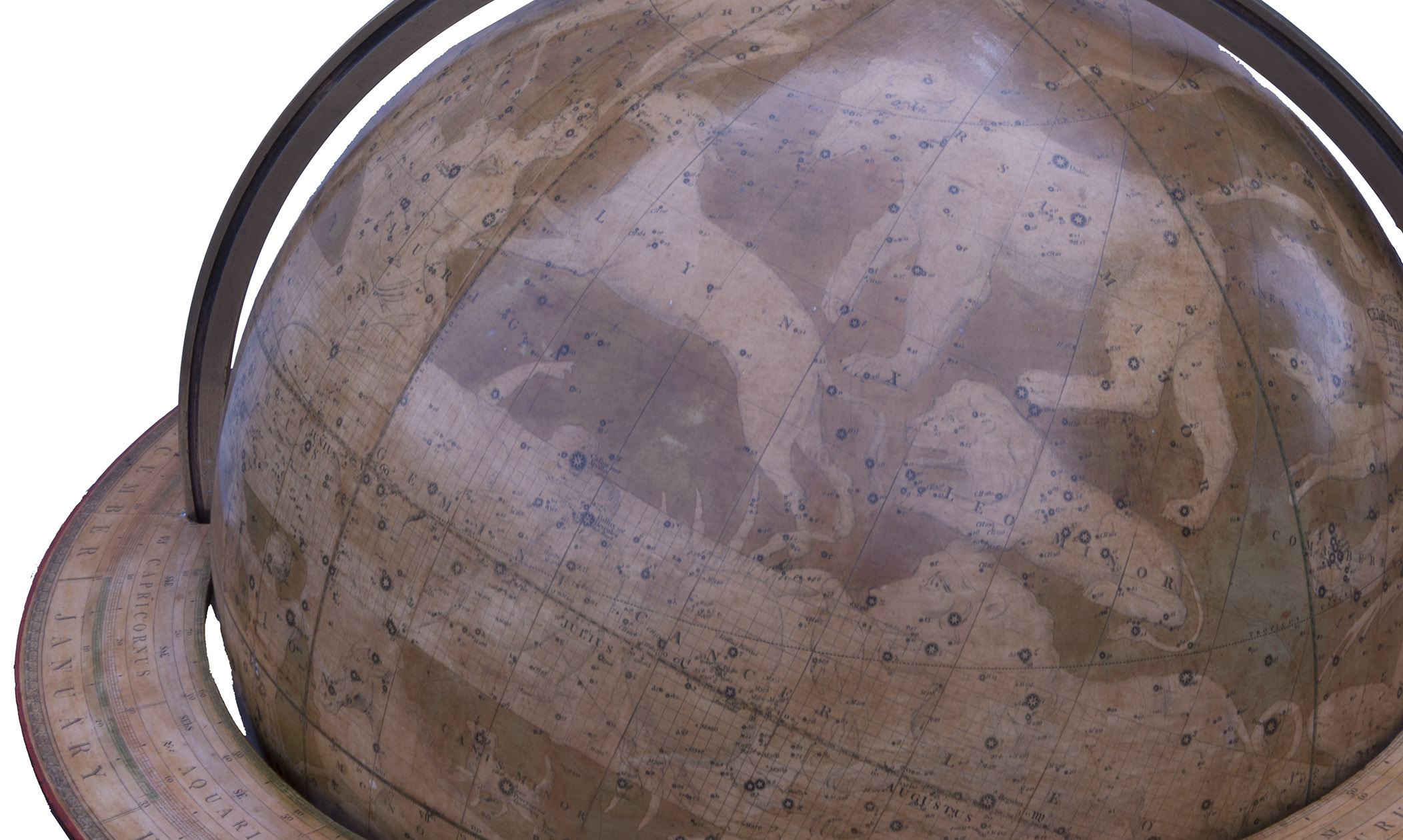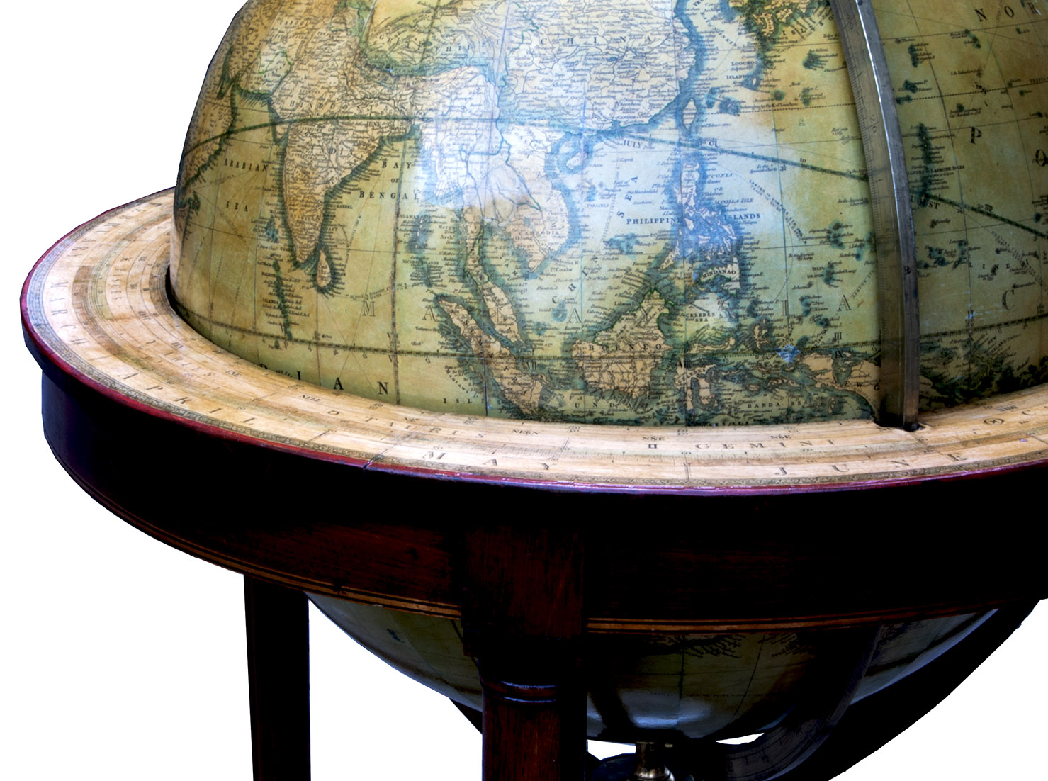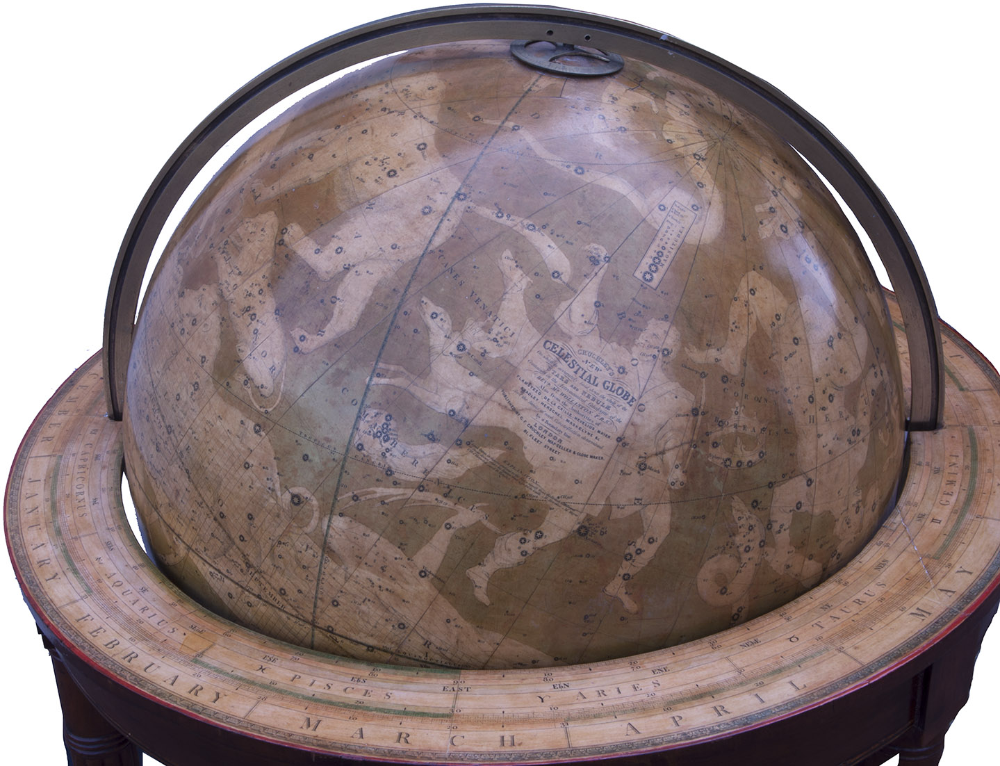 A matching pair of terrestrial and celestial globes (53 cm diameter) each made a hollow paper-marché core (2 hemispheres, joined at the equator), covered with a layer of plaster and 12 hand-coloured, engraved gores, showing the terrestrial geography and celestial bodies in great detail. Each globe mounted in a mahogany tripod stand on small wheels. With a compass (diameter: 25 cm) at the base of each stand; graduated brass meridian ring and engraved graduated horizontal rings (paper pasted on the mahogany frame) showing the months of the year, the zodiac signs and wind directions.