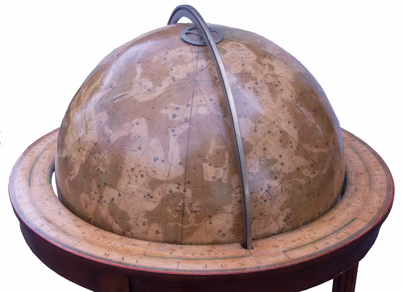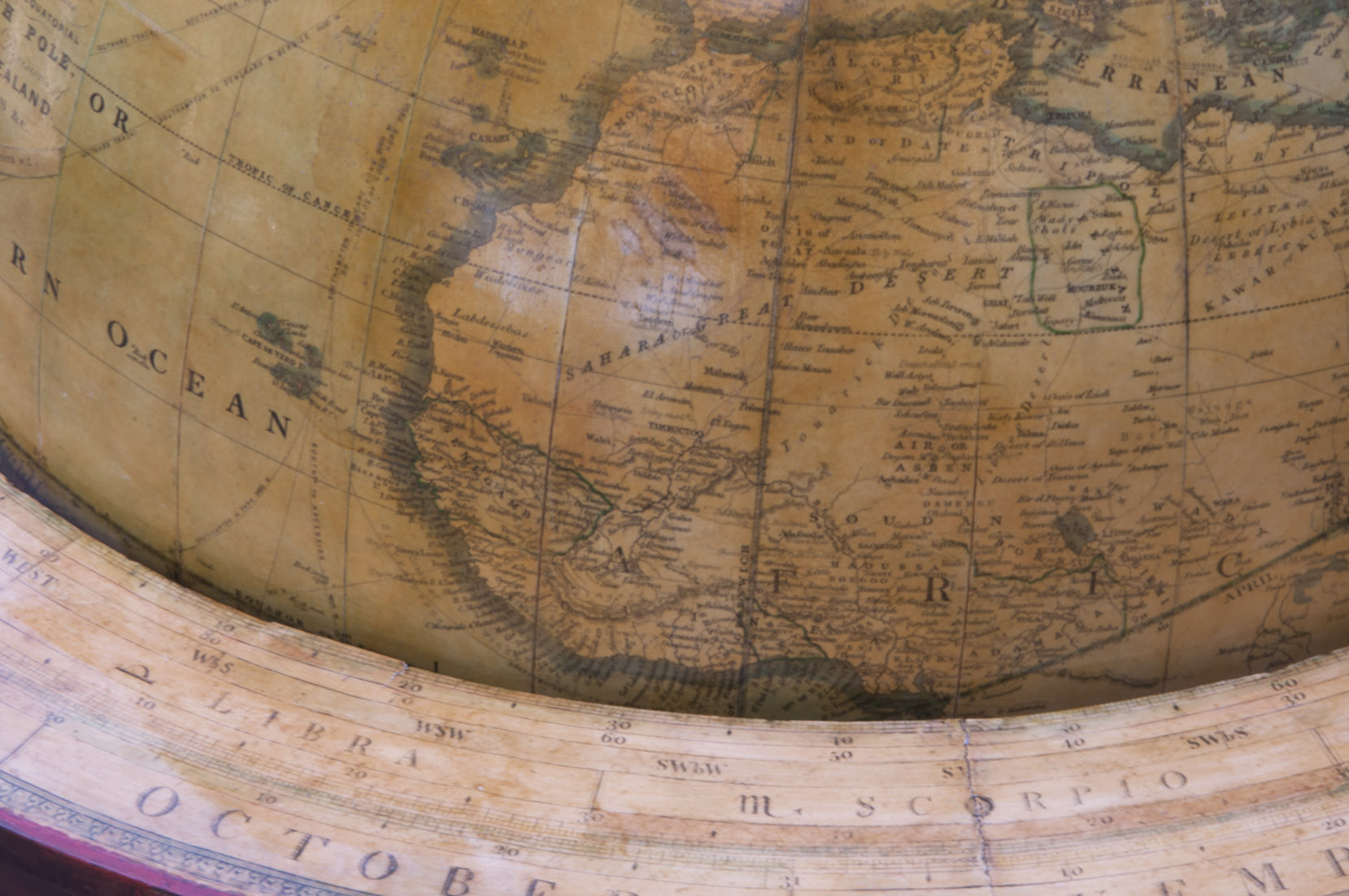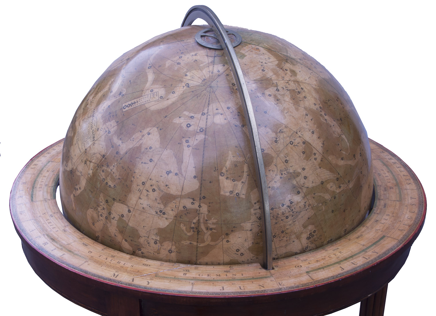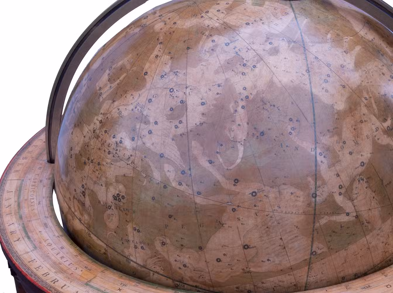 A matching pair of terrestrial and celestial globes (53 cm diameter) each made a hollow paper-marché core (2 hemispheres, joined at the equator), covered with a layer of plaster and 12 hand-coloured, engraved gores, showing the terrestrial geography and celestial bodies in great detail. Each globe mounted in a mahogany tripod stand on small wheels. With a compass (diameter: 25 cm) at the base of each stand; graduated brass meridian ring and engraved graduated horizontal rings (paper pasted on the mahogany frame) showing the months of the year, the zodiac signs and wind directions.