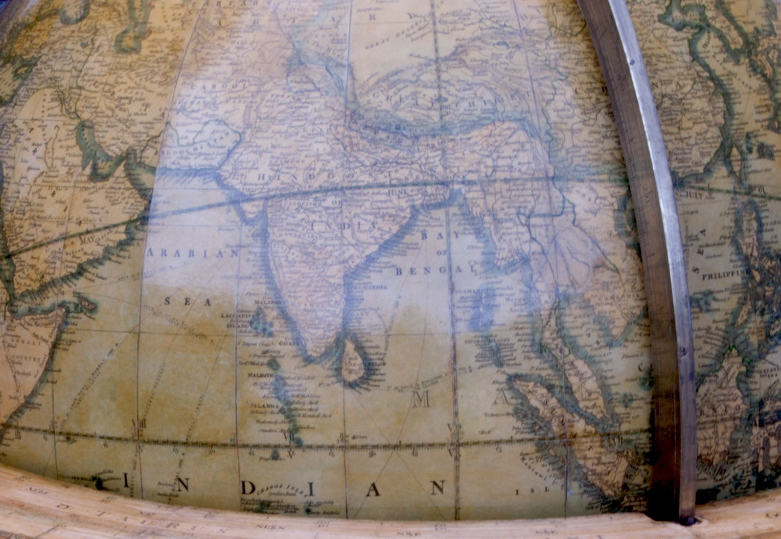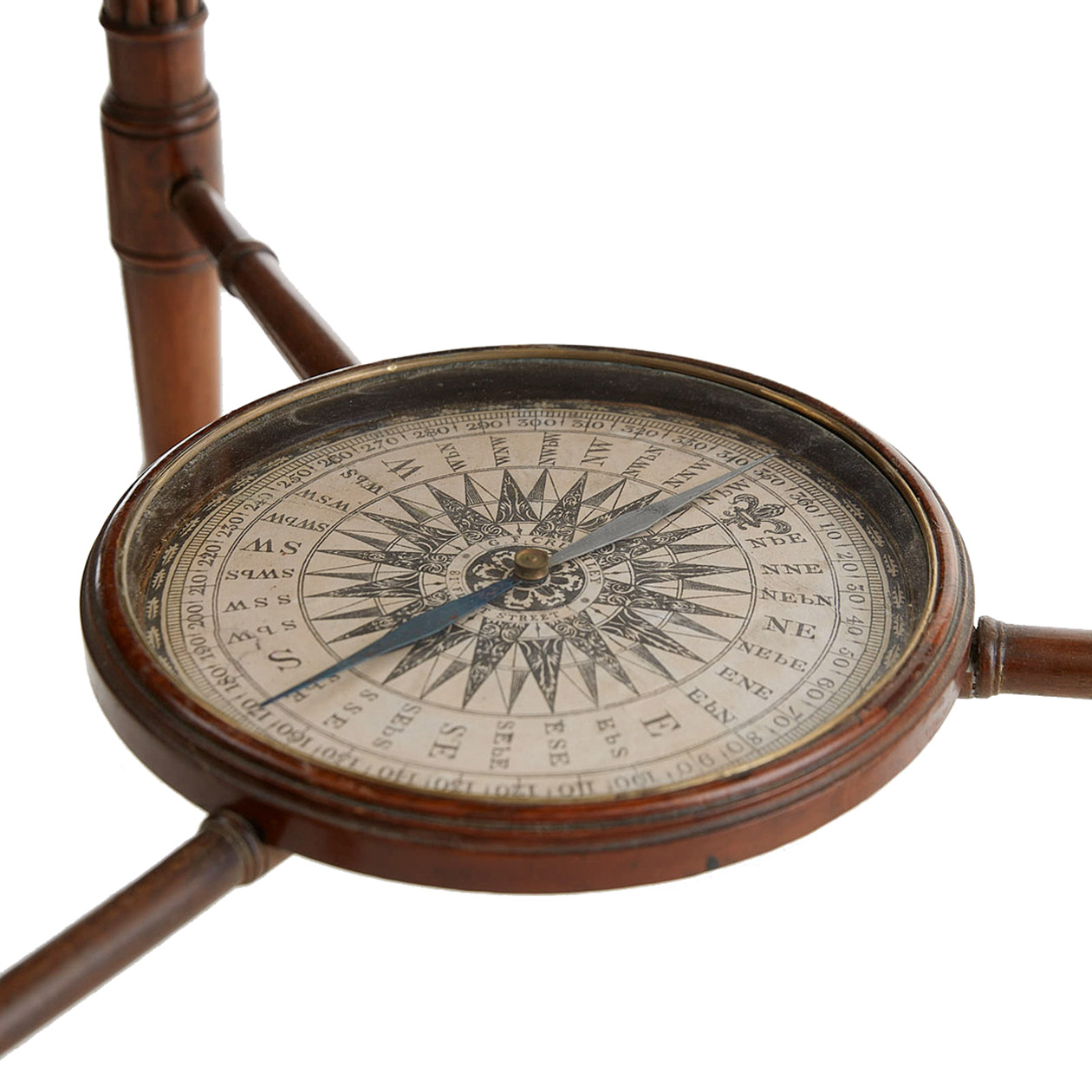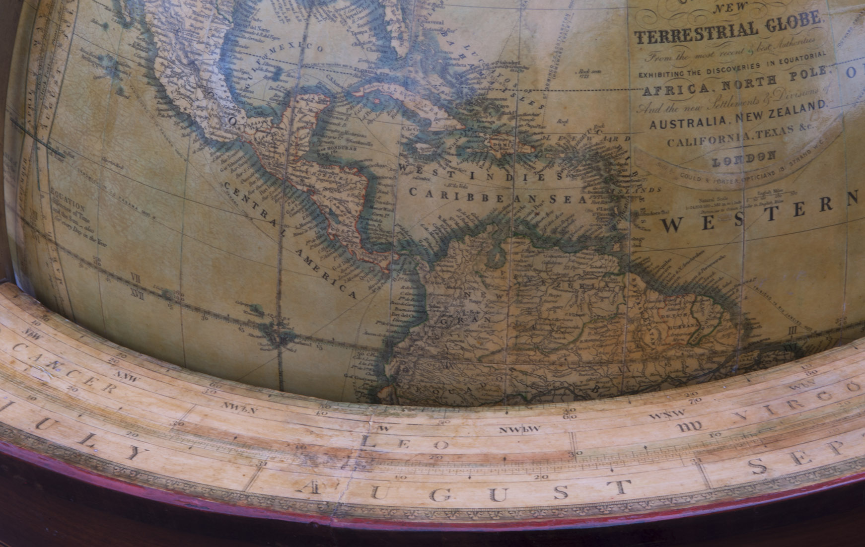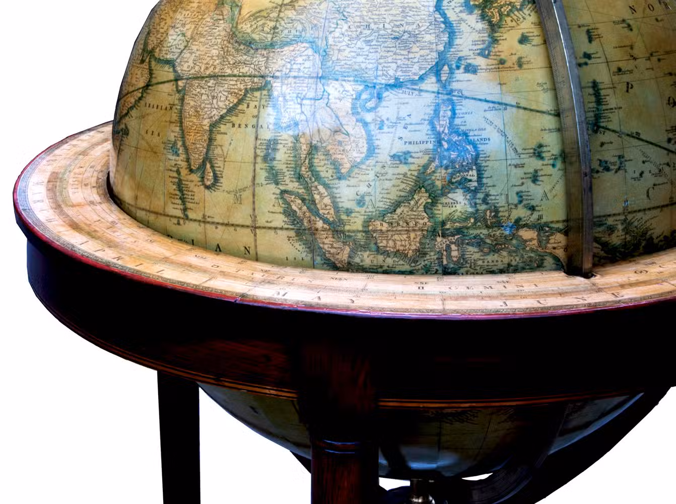 A matching pair of terrestrial and celestial globes (53 cm diameter) each made a hollow paper-marché core (2 hemispheres, joined at the equator), covered with a layer of plaster and 12 hand-coloured, engraved gores, showing the terrestrial geography and celestial bodies in great detail. Each globe mounted in a mahogany tripod stand on small wheels. With a compass (diameter: 25 cm) at the base of each stand; graduated brass meridian ring and engraved graduated horizontal rings (paper pasted on the mahogany frame) showing the months of the year, the zodiac signs and wind directions.