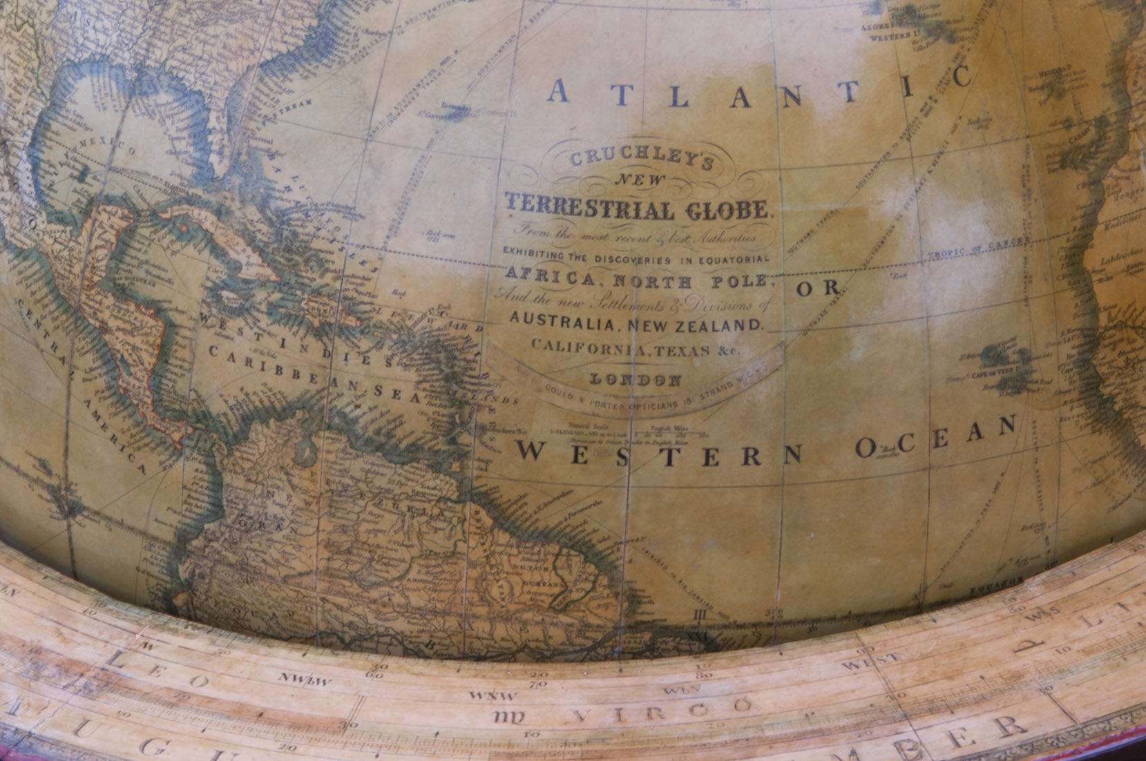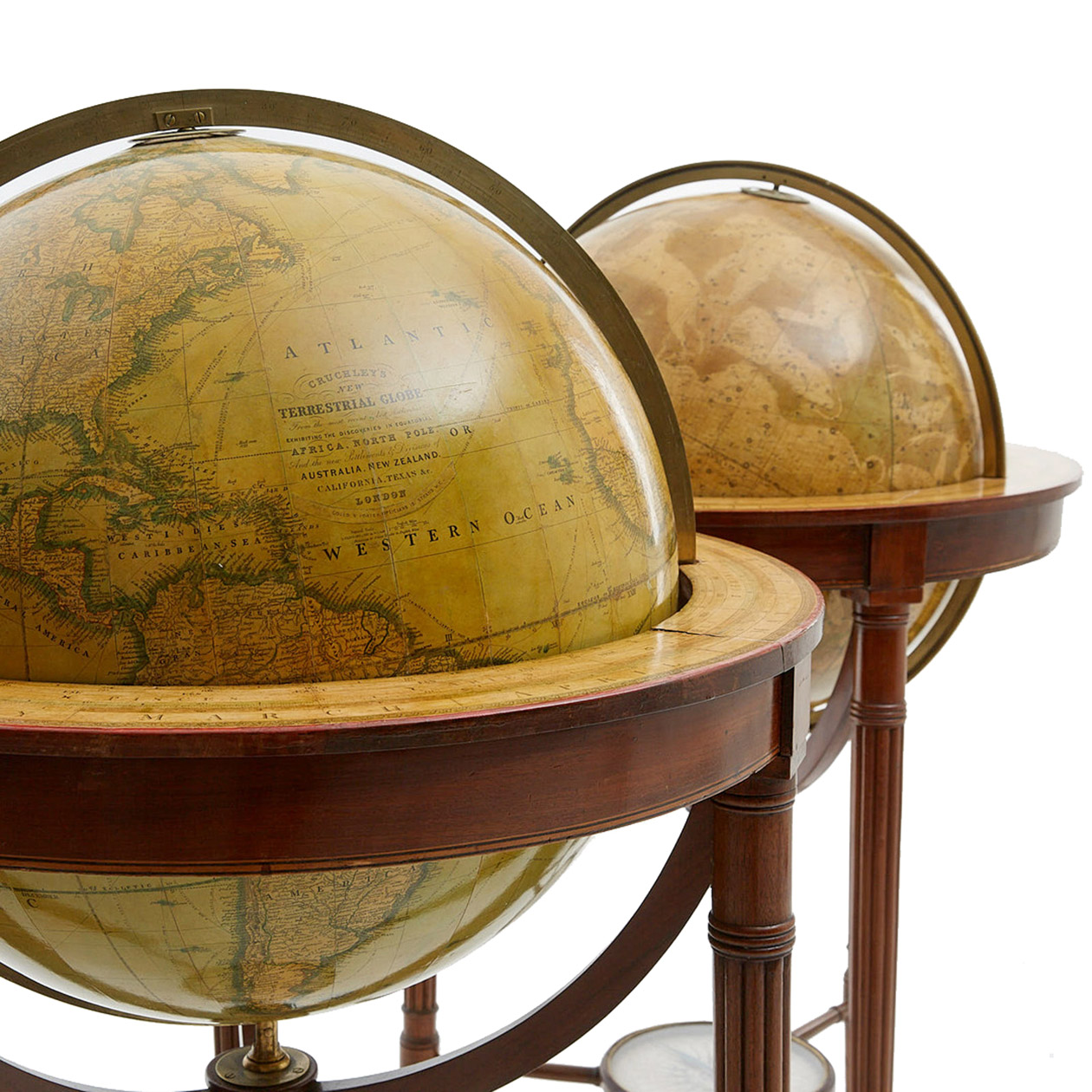 A pair of Cruchley's large, highly detailed library globes, showing the most accurate and up-to-date mid-nineteenth-century terrestrial and celestial data. While the terrestrial globe precisely portrays the earth divided into the mid-19th-century nations and states, the celestial globe shows a more wonderous, imaginative depiction of the heavens. Mythical figures and the signs of the zodiac are depicted among the constellations in a captivating way.
