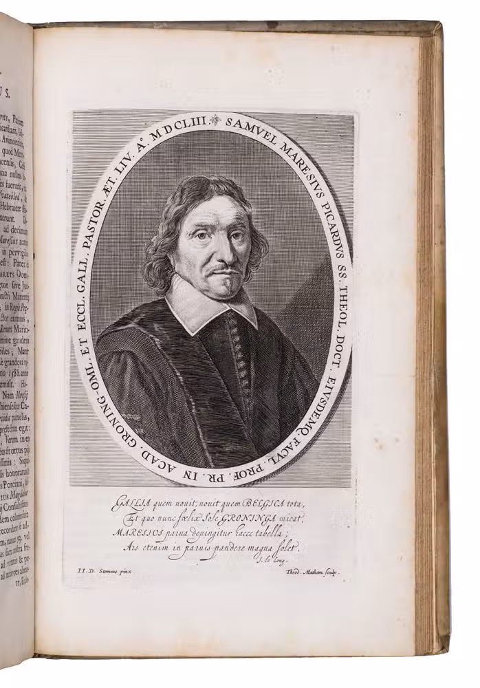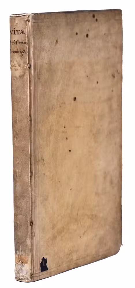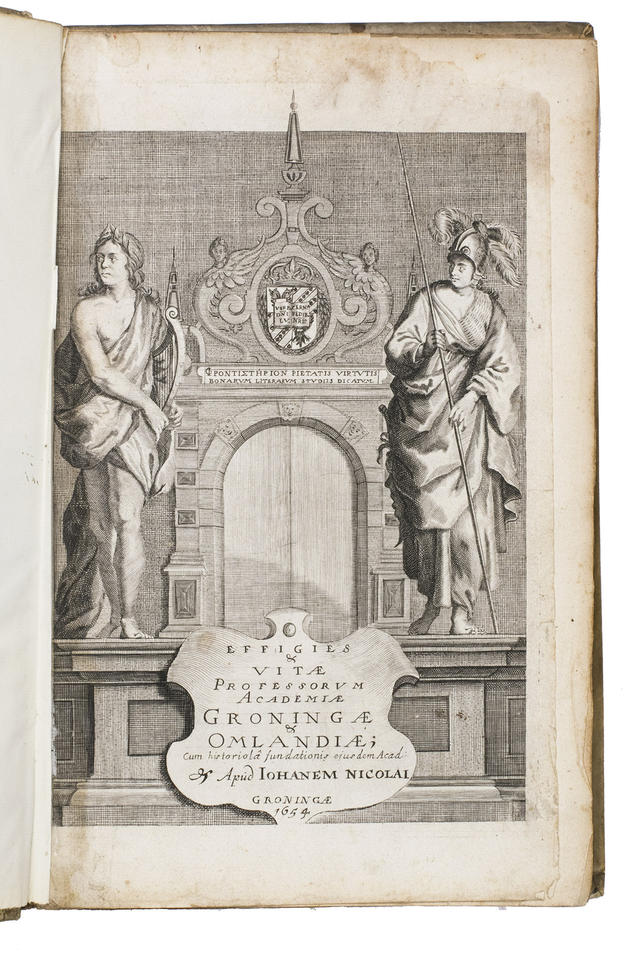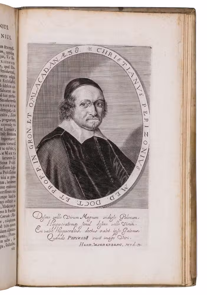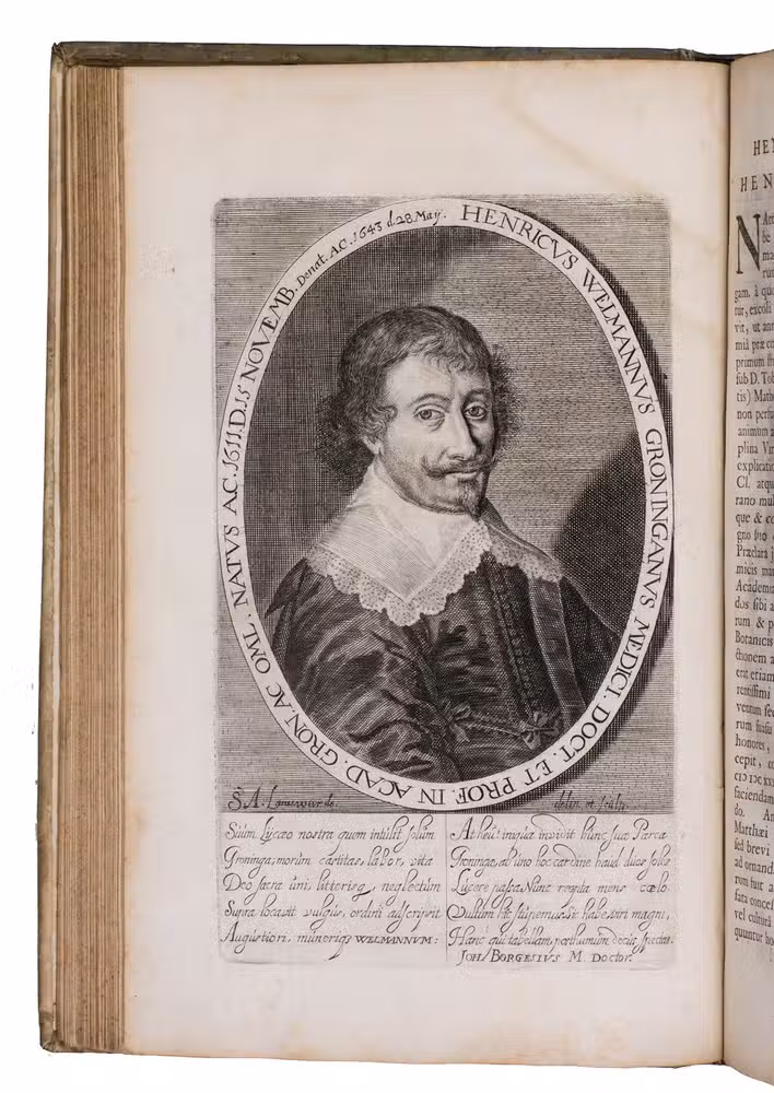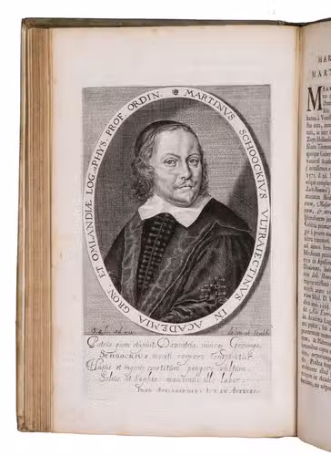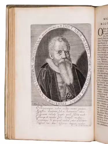 First and only edition of an illustrated history of the University of Groningen, likely printed to celebrate its 40th birthday. The work contains biographies and large portraits of its most famous professors, including Rudolf Agricola (1443-1485), Ubbo Emmius (1547-1625), Wessel Gansfort (1419-1489), Franciscus Gomarus (1563-1641), and Regnerus Praedinius (1510-1559). Twelve of these portraits are engraved by Steven van Lamsweerde (ca. 1620-1686), two by Crispijn van de Passe the Younger (1594-1670), and one by Theodor Matham (born 1589). The others are unsigned.