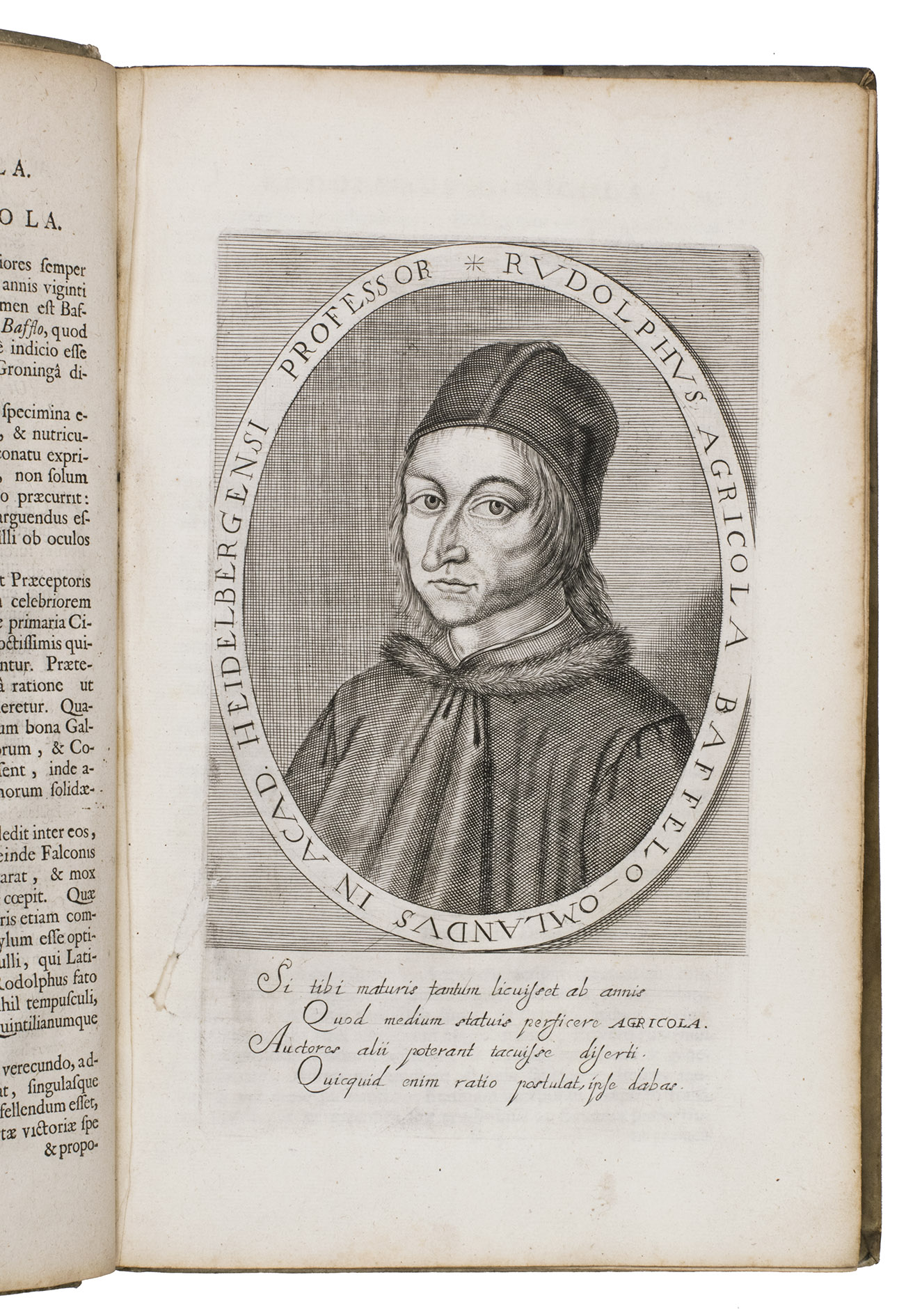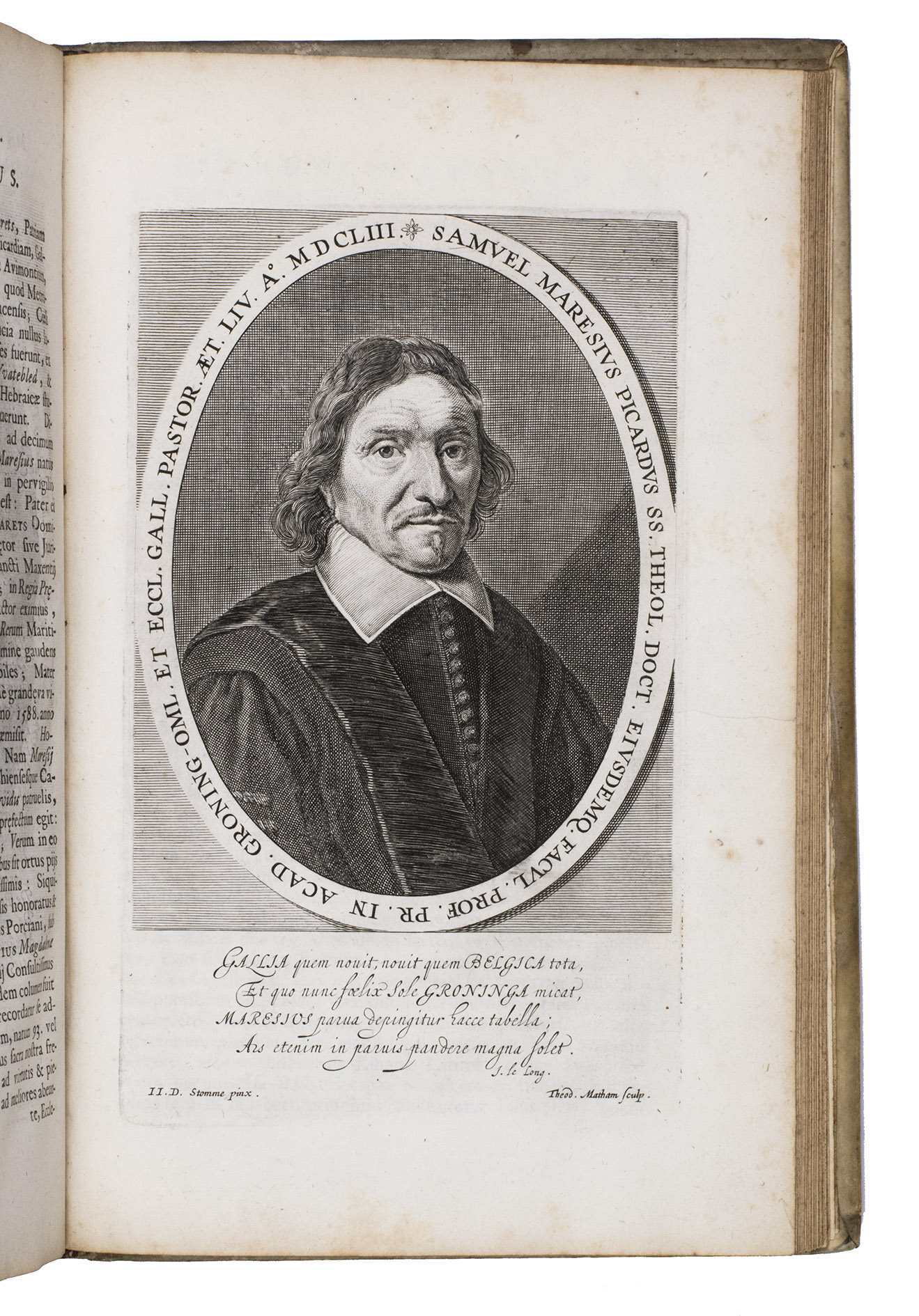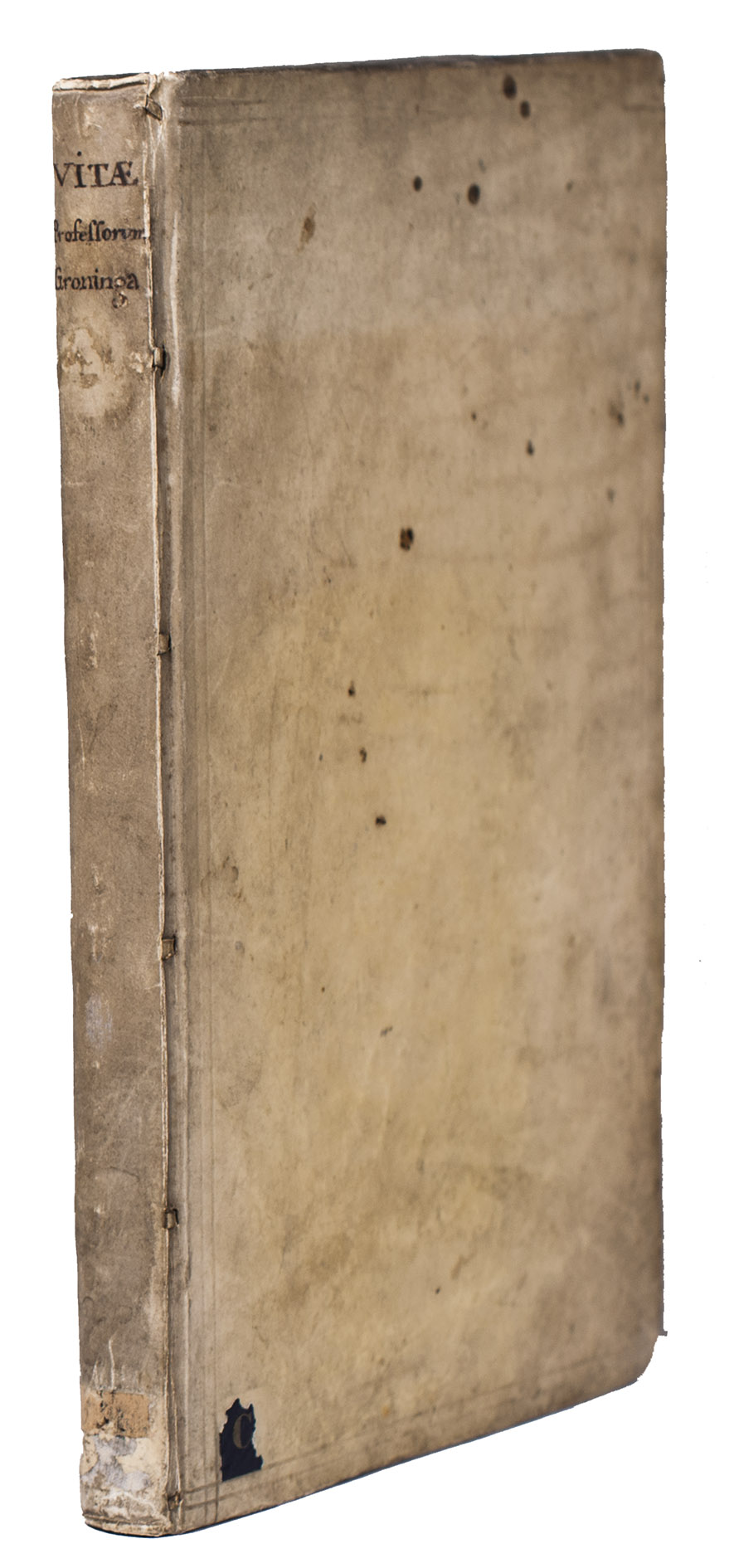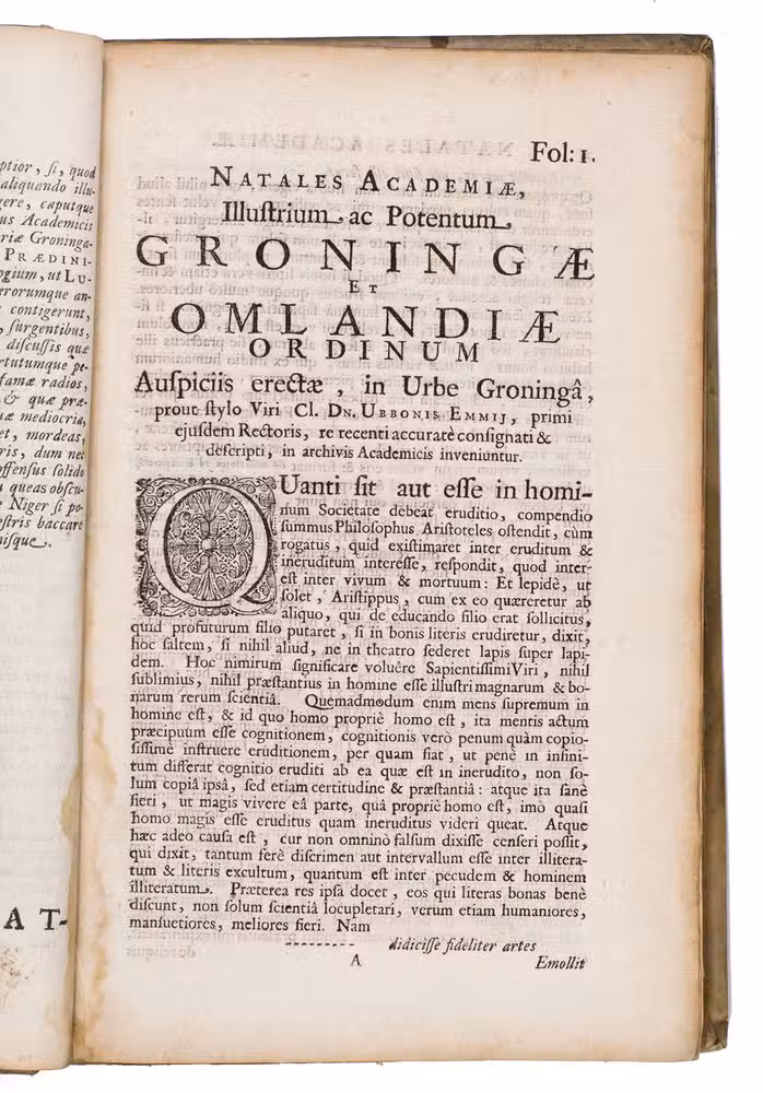First and only edition of an illustrated history of the University of Groningen, likely printed to celebrate its 40th birthday. The work contains biographies and large portraits of its most famous professors, including Rudolf Agricola (1443-1485), Ubbo Emmius (1547-1625), Wessel Gansfort (1419-1489), Franciscus Gomarus (1563-1641), and Regnerus Praedinius (1510-1559). Twelve of these portraits are engraved by Steven van Lamsweerde (ca. 1620-1686), two by Crispijn van de Passe the Younger (1594-1670), and one by Theodor Matham (born 1589). The others are unsigned.