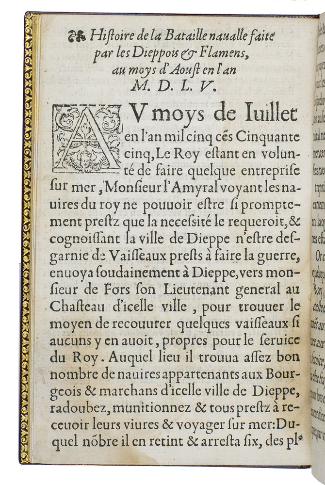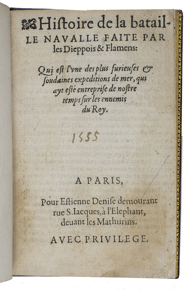 Rare issue of one of the first editions (priority uncertain) of an account of a ferocious sea battle in the Habsburg-Valois Wars (also known as the Italian Wars): 18 small French ships from Dieppe, mostly only 15-60 tonne though some are nevertheless described as galleons, defeated 23 larger Flemish ships. The battle, which took place in August 1555, was one of the fiercest of the day putting both sides in great danger. It was recently the subject of a Discovery channel television documentary. The book gives a remarkably detailed account, especially from the French side, with the names, captains and capacities of all the French ships. Our undated issue of the book, with a Paris imprint must be one mentioned by Polak: "J'ai vu un autre exemplaire avec le même titre, imprimé à Paris chez Estienne Denise, s.d."