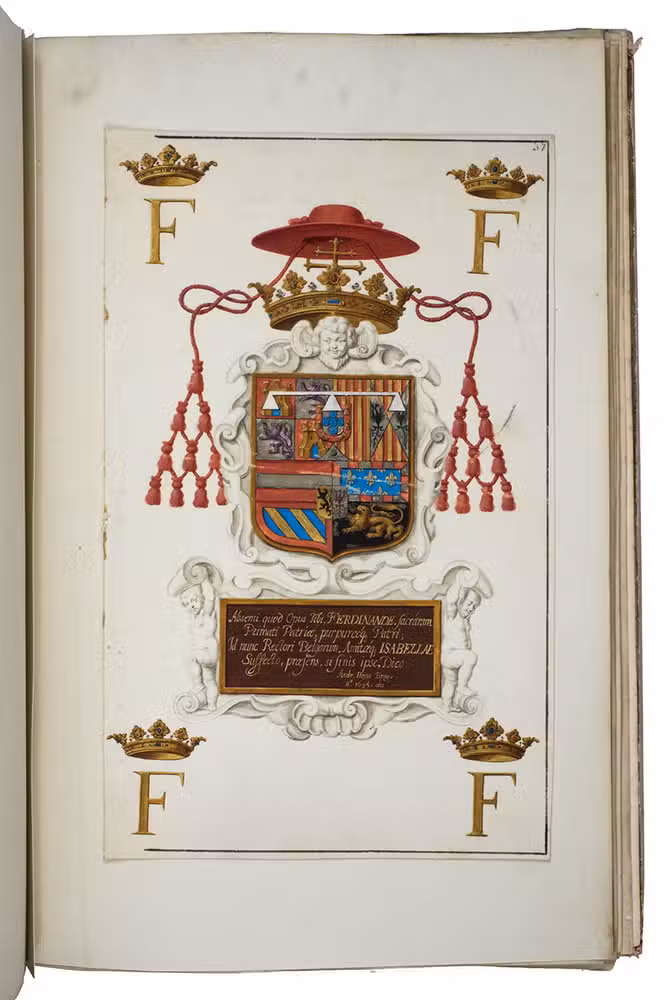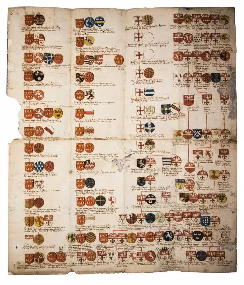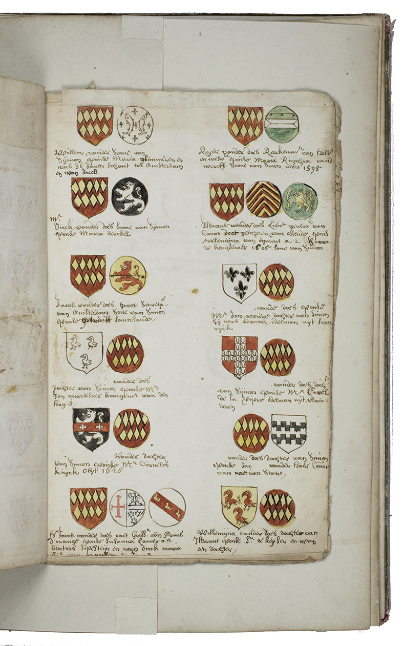 Album containing a collection of 390 coats of arms, almost all executed by hand and mostly contemporary hand-coloured, of many important West-European noble families in Flanders, the Netherlands and France, but also some important members of European royal courts. The coat of arms are sometimes depicted on their own, but sometimes they are part of the 6 genealogical trees, showing the descendants of some noble families. Many of them concern 16th-, 17th- and 18th-century people, although only a few are or can be dated, apart from a few noble persons in this album living in the 14th- and 15th-century. Although the coat of arms are mostly from different families, the album also contains two small collections of families. The album opens with one of these small sub-collections, starting with 4 heraldic documents concerning the Flemish Van der Haeghen family and related families, among others the Van Eesbeke family as well as Van Winterbeke and Van Compostelle, all represented on a genealogical tree. Also added is a formal tract by the herald of arms Jan Boukelier, herald of arms of Namur (Belgium), with two wax seals covered with paper at the bottom of this tract, on the nobility of the Van der Haeghen family. Another family of which the album contains more than one heraldic document is the Dutch family Van der Does, particularly living in Holland, and other families they are related to, for example the De Laignier family, but also Aeyta, Denain and Van der Laen. The album contains 3 family descendants of the Van der Does family and their related families, providing a lot of information on them, including detailed captions on the family members.The album also contains some highlights. One of them is the luxurious executed coat of arms of the Spanish catholic royal couple Ferdinand II of Aragon (1452-1516) and Isabella I of Castile, beautifully painted and heightened with gold on vellum, then living in the Habsburg Netherlands. Another highlight is a large descendant of the 14th- and 15th-century Burgundian family, bound at the end of the album. Interesting is that this genealogical tree particularly covers the illegitimate children of the Burgundian court. The descendant starts with John I, duke of Burgundy, also known as John the Fearless (1371-1419). In this descendant the mother of his child, John of Burgundy and bishop of Cambria (1404-1479), is mistakenly identified as his mistress Marguerite de Borsele instead of his other mistress Agnes de Croy. Although he was bishop, his son John of Burgundy had numerous illegitimate children, including Arnold of Burgundy whose mother was Jeanne de Beaufort-Spontin. In this descendant the Burgundian family finally married in to the De Schoore family, and in the end to the famous Spanish-Bruges merchant family Pardo. Other interesting families occuring in the album are the Normandian family Remond, the Flemish Van Winghe family, the Wielant family (Dutch Flanders), the Limburgian Van Eynatten family of which a member was married to the D'Eve family and many more interesting families, including the coat of arms of Samuel Thiens, then mayor of the Dutch city of Amersfoort. Altogether a very rich album on heraldry, containing many coat of arms of some of the most important noble families of the Low Countries and France from the 16th to the 18th century.