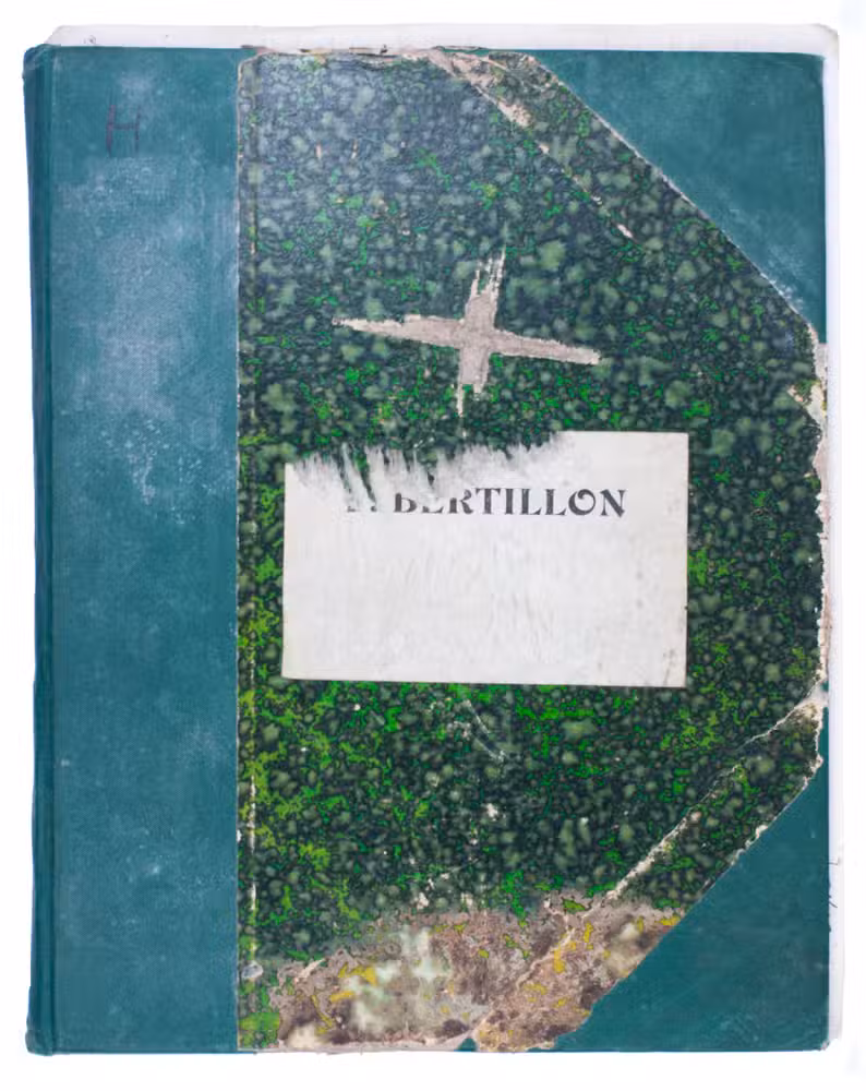 On the front paste-down is a letterpress label with name and address, "F. Bertillon|3, Rue d'Achères|Maison-Laffitte", the name repeated in a similar label on the front board. This may be François Bertillon (b. 1889), the grandson of the Paris mycologist Louis-Adolphe Bertillon (1821-1883), whose family had a residence at Maison-Laffitte, outside Paris. Louis-Adolphe was the father and François the nephew of the anthropologist Alphonse Bertillon. The samples collected in 1862 and 1869, particularly those of 1862 with the data methodically and scientifically noted on a pre-printed form, were probably described by Louis-Adolphe. François probably found his late grandfather's samples and notes and began collecting himself around 1911, when he would have been 22 years old.