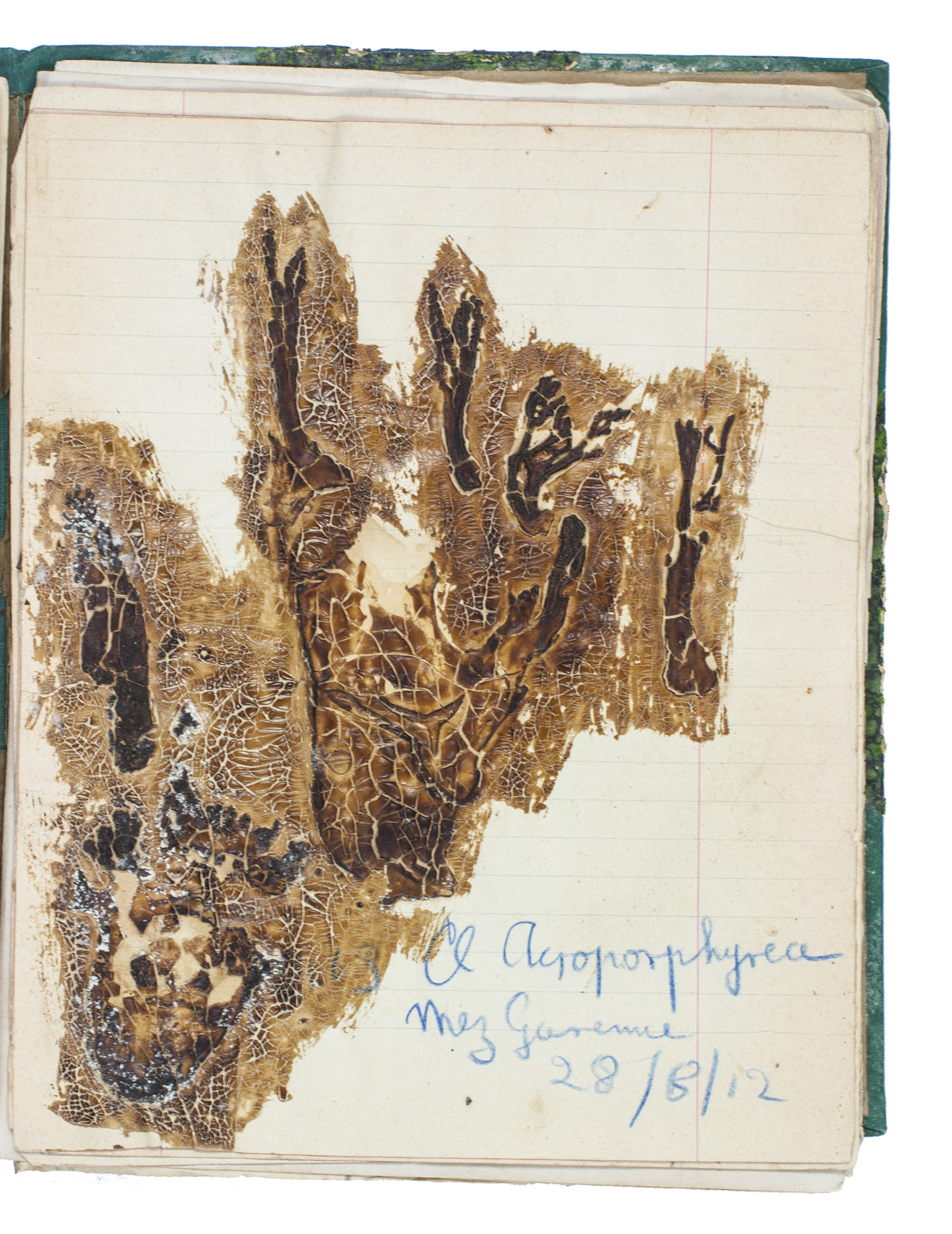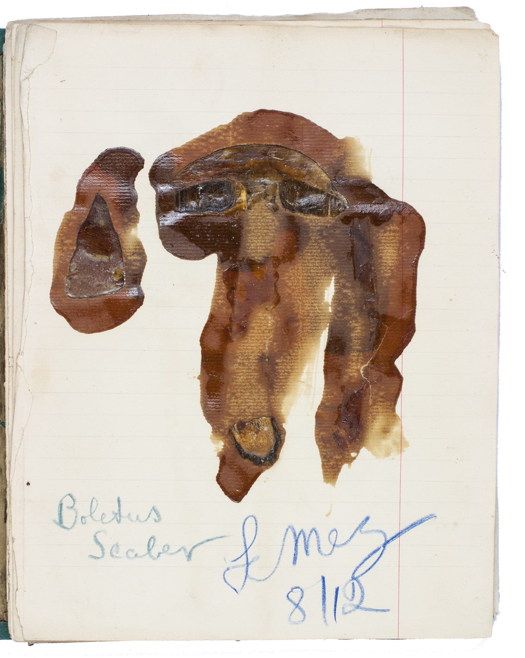 A collection of original samples of 23 varieties of mushroom, mounted on paper leaves or bifolia and dried, with manuscript notes providing information about the samples and with an occasional pencil drawing. Most give the name of the mushroom (in Latin or French) and the date and/or place where it was collected. Most were collected in or around Paris or within a few hours travel of Paris. The earliest two, both dated 19 October 1862, give much more detailed information written on a pre-printed (lithographed?) form in script lettering.