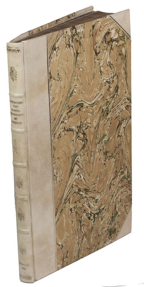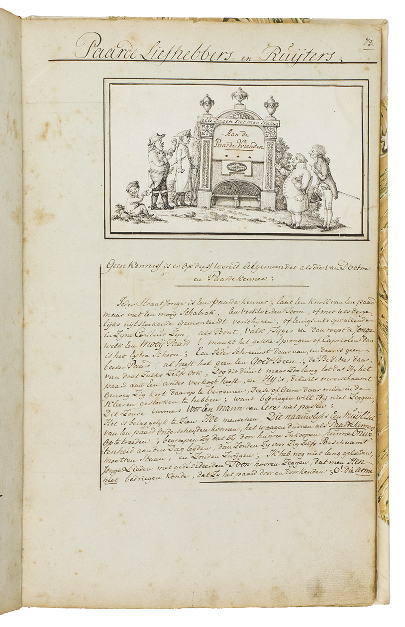 [The Netherlands, ca. 1815]. Folio (38 x 24 cm). Manuscript on paper written in brown ink in a readable Latin hand, with the title on p. 72, illustrated with 30 small watercolour drawings of horses mounted on the leaves (mostly about 8.5 x 11 cm), and a washed pen drawing with 5 caricature figures before a monument (9.5 x 16 cm), mounted above the dedication. Half vellum (1930s?), gold-tooled spine. [4 blank], 248, 251-254, 257-267, [9 blank] pp.