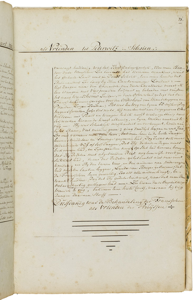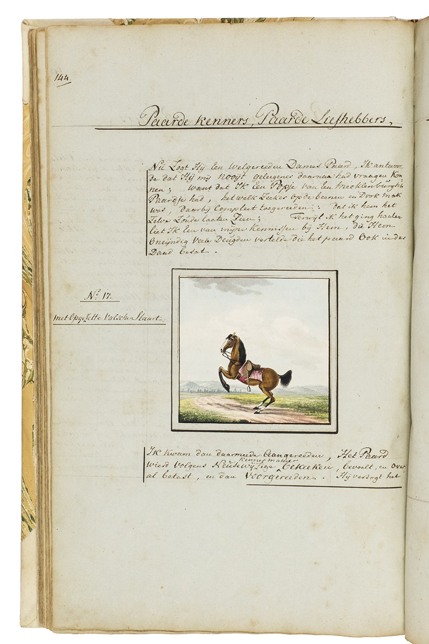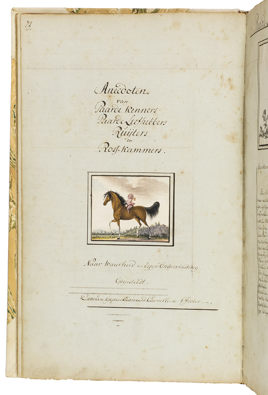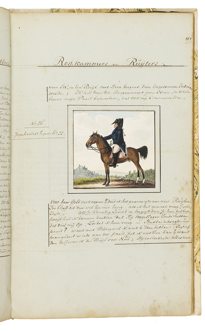 Very beautifully illustrated manuscript by a retired Dutch cavalry officer who had been in Prussian service against Napoleon Bonaparte in the years 1806 to 1813, giving his personal account of the horses he kept and traded during his career. The fine watercolours, executed with great care and refined draughtsmanship, show portraits of all 31 horses the author once owned. The text of the manuscript is also of considerable interest. The author relates many entertaining stories and includes many personal details his lifelong schooling in horsemanship, displaying a profound knowledge of horses. He also gives accounts of his daily life in the Prussian army. The manuscript provides insight into the life of the Silesian and Saxon noblemen, proceedings at the horse market in Leipzig, the situation of the army before the Battle of Jena, etc. Moreover, it gives a detailed descriptions of the terrible plundering of the French Wurtenberger Light Cavalry in Silesia, in 1806, and of the Russian invasion of Wohlau in 1813. Separate treatises devoted to these incidents precede the main part of the manuscript (the anecdotes and other information concerning horses) and serve as a sort of preface to them. The author also gives an account of his stay at the camp of the Count van Salm near Bergen-op-Zoom, Netherlands, of a horseback trip from Vianen to Utrecht, during which his horse fell and died, and another trip, from The Hague to Zutphen, on a tireless Zeeland horse. The manuscript explicitly refers to events from 1806 to June 1813 and was probably written soon after the latter date.