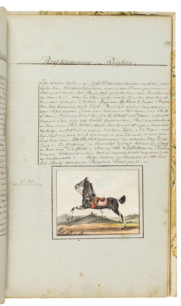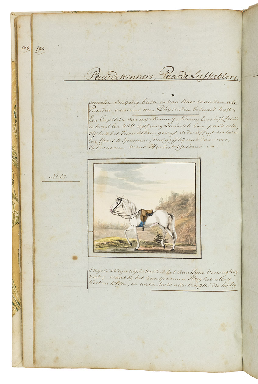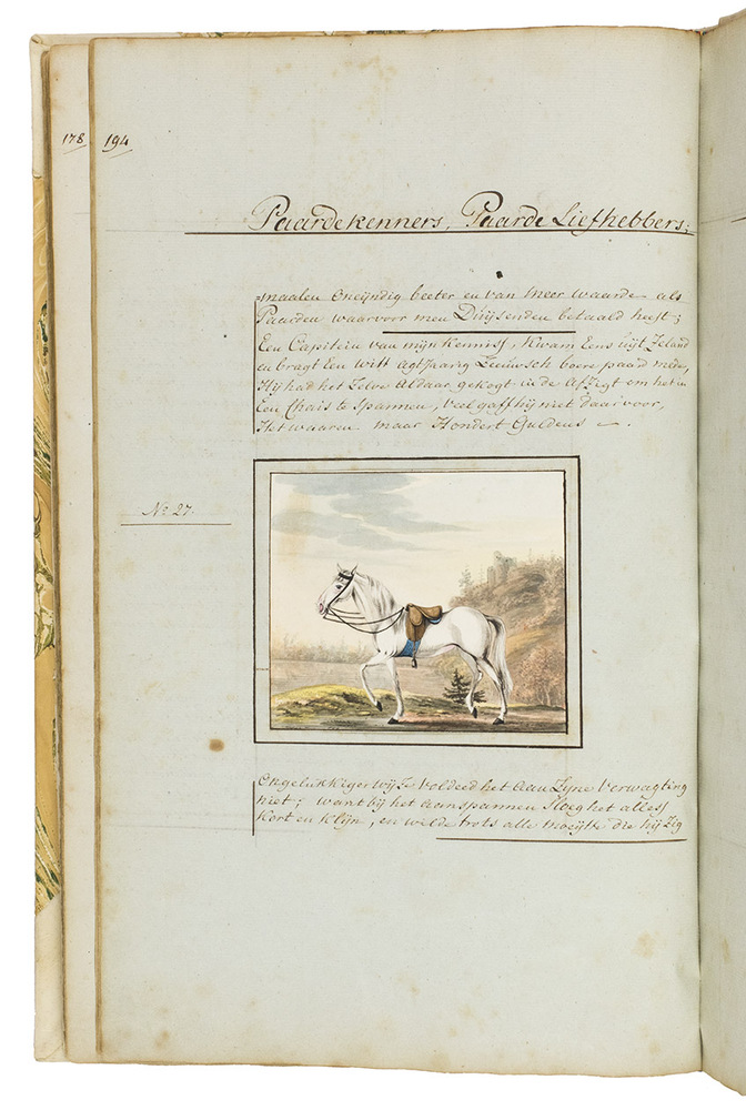 In 1917 the manuscript apparently belonged to Nicolaas Gerhard van Huffel (1869-1936), physicist, amateur painter, collector of graphic art and teacher at the school of graphic arts in Utrecht. The ink borders drawn around the mounted drawings have sometimes bled through the paper and on two leaves the stiffness of the mounted drawing has caused the manuscript leaf to tear along that border, a small and mostly marginal tear affects one word of the text, and there is a marginal stain in the foot margin of a couple leaves and occasional minor foxing, but the manuscript is still in very good condition, most of the watercolour drawings fine. A remarkable horse manuscript, providing insight into horse trading & keeping, and army life in the period 1806 to 1813 and with 30 beautiful watercolour drawings of horses. Nicolaas Gerard van Huffel, in: Oude Kunst II (1917), pp. 248-252.