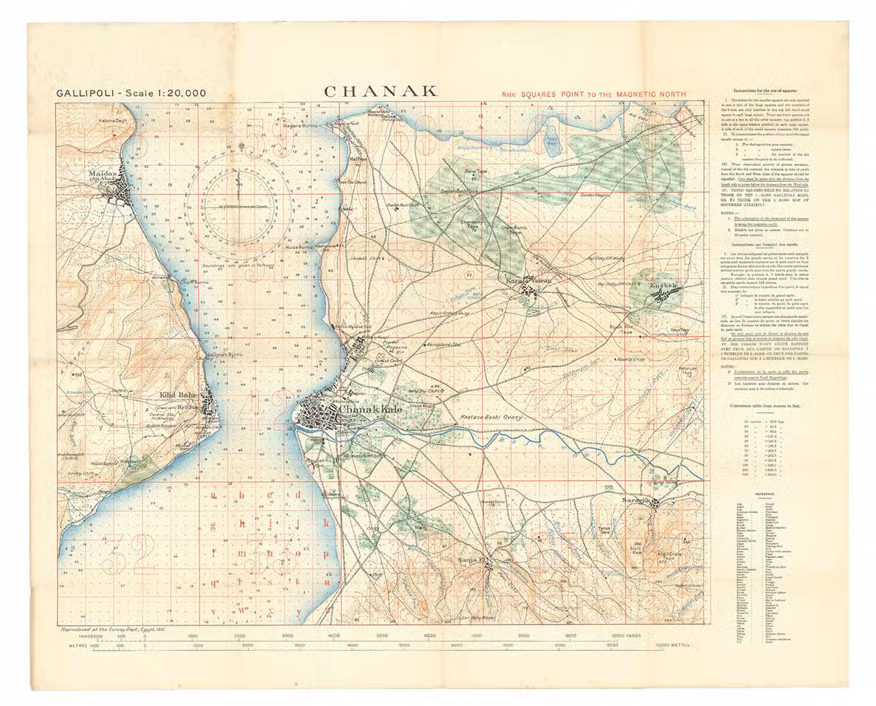 The finest contemporary map of the Çanakkale sector of the Gallipoli Campaign, the site of the dreaded "Narrows" of the Dardanelles where allied naval forces made their ill-fated attempt to "force the straits" towards taking Istanbul, at a scale of 1:20,000. Drafted in Cairo under the direction of T. E. Lawrence (Lawrence of Arabia) at the Arab Bureau's Intelligence Office, based on a recently captured Ottoman map. The main map image is in black with land contours in brown, waterways in blue, and vegetation in green, with soundings printed in the strait and a grid of parallels and meridians in red (with a note that they are based on a magnetic north). The larger squares (each 5 x 5 smaller squares) are numbered (in a single sequence for the six maps in the series) and the 25 smaller squares designated by letters a-z (without e) - printed only in square 33, so that any 600 x 600 metre square on the map can be specified with coordinates.