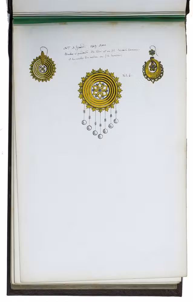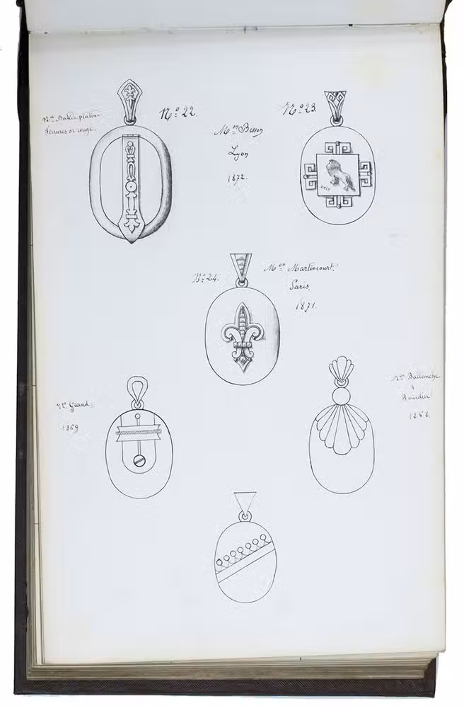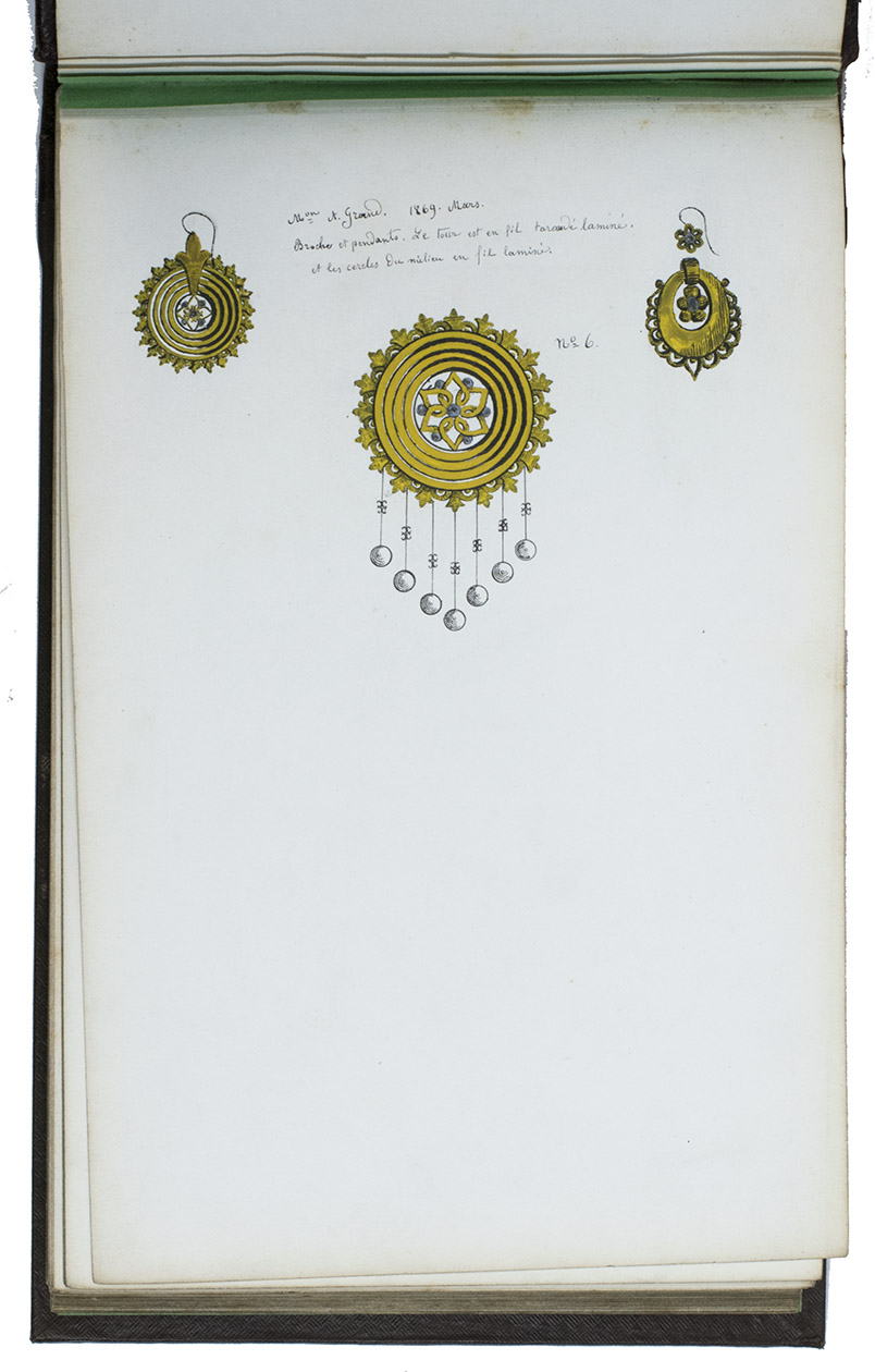 Model album for jewelry, probably from a Parisian luxury jeweler, with 101 ink drawings of jewelry models and designs. All drawings by the same anonymous hand. The first 59 drawings are numbered 1-59 and have French comments added in neat handwriting that provides the name of the jeweler that produces the jewelry pictured, the place where the jeweler is active and the date when the model first came on the market. All jewelers mentioned are from Paris, except for Besson from Lyon. These are: Grand, Martincourt, Ballanche & Bourdier, Loussel et Vacherot, Galerie Vivienne, Goliat, Magasins du Boulevard des Italiens and Magasins du Palais Royale. The dates range from 1868 to 1872. Each numbered model is accompanied by a short descriptive text giving details about the material and sometimes the popularity. The catalogue includes earrings, brooches, medallions, crosses, bracelets, hairpins, badges, clasps and a diadem, made of silver, gold and platinum, using pearls and precious stones such as rubies and onyx. The rest of the designs, without numbers or text, may be the jeweler's own designs.