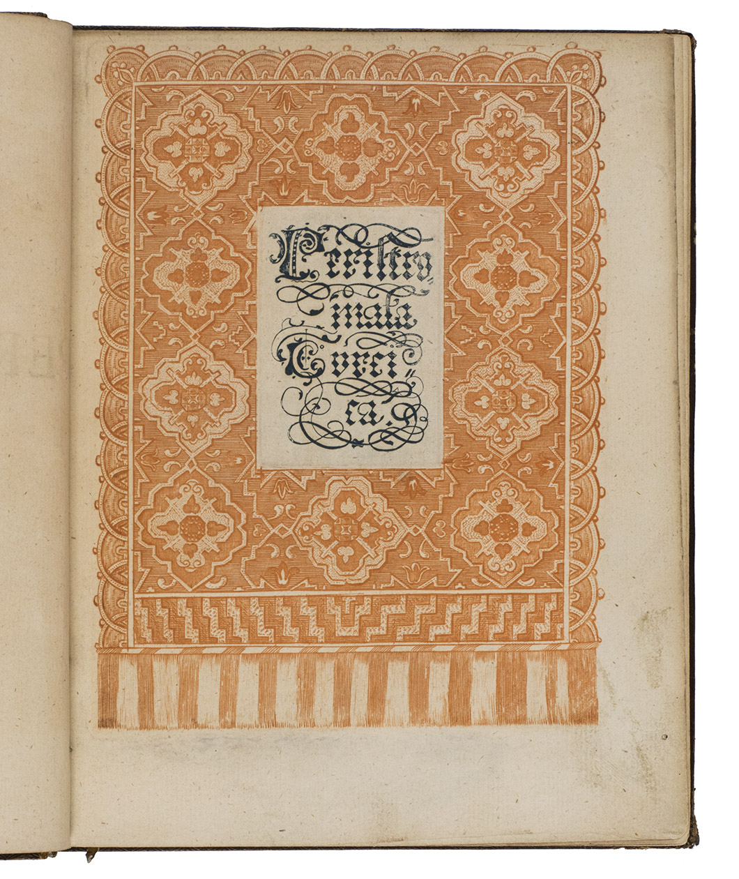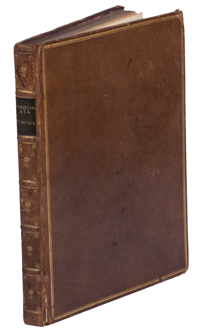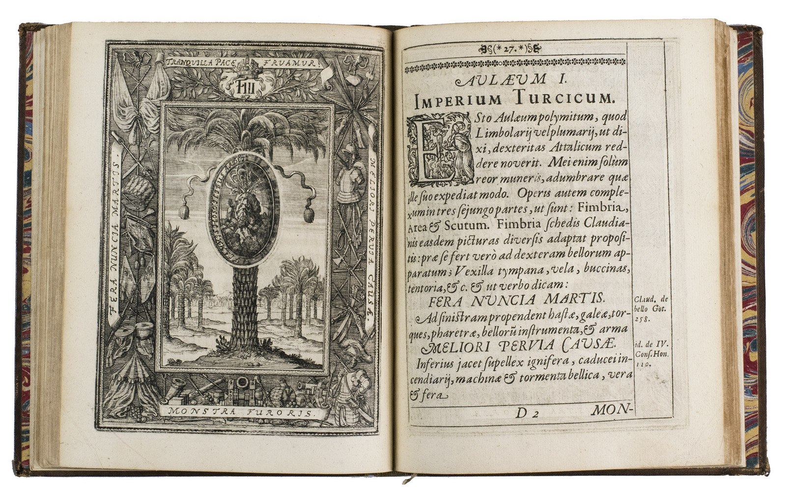 [Nürnberg, Wolfgang Endter] (ad 1 with a false colophon: Paris, Toussaint du Bray), [each title-page with a chronogram:] 1641 (ads 1-2, 4) & 1642 (ad 3). 4 editions published together in 1 volume. 4to. With 4 letterpress title-pages in red and black, each with the date in a chronogram, 2 engraved title-plates plus 12 full-page engraved emblematic illustrations, all on integral leaves, each with a small plate nested in a larger plate (7 in the Peristromata with a varying rectangular central plate in dark blue or black and the same outer plate of a Persian carpet in orange; 7 in the Gallia with a varying oval central plate and the same outer plate representing peace with the palm tree in a landscape device of the Fruchtbringende Gesellschaft and a border representing war with military attributes). Further with 5 woodcut head- and tailpieces (plus 8 repeats), 21 "woodcut" decorated initials (5 series, at least some actually metal castings made from woodcuts) plus 8 repeats, and cast vine-leaf ornaments, acorns and other fleurons. Set in roman and italic types with incidental Greek and Hebrew. Light brown calf (ca. 1820?) by Charles Murton (ca. 1795?-ca. 1860?) in London, with his stamp on the front paste-down, sewn on 5 cords, gold-tooled spine with black morocco label, gold thick-thin fillets on boards, gold-tooled board edges, blind-tooled turn-ins, curl-marbled endpapers (white, red, blue, yellow and blue-green in that order), and an orange silk ribbon marker. 46, [1], [1 blank]; [3], [1 blank], 34; 64; 51, [1 blank] pp.