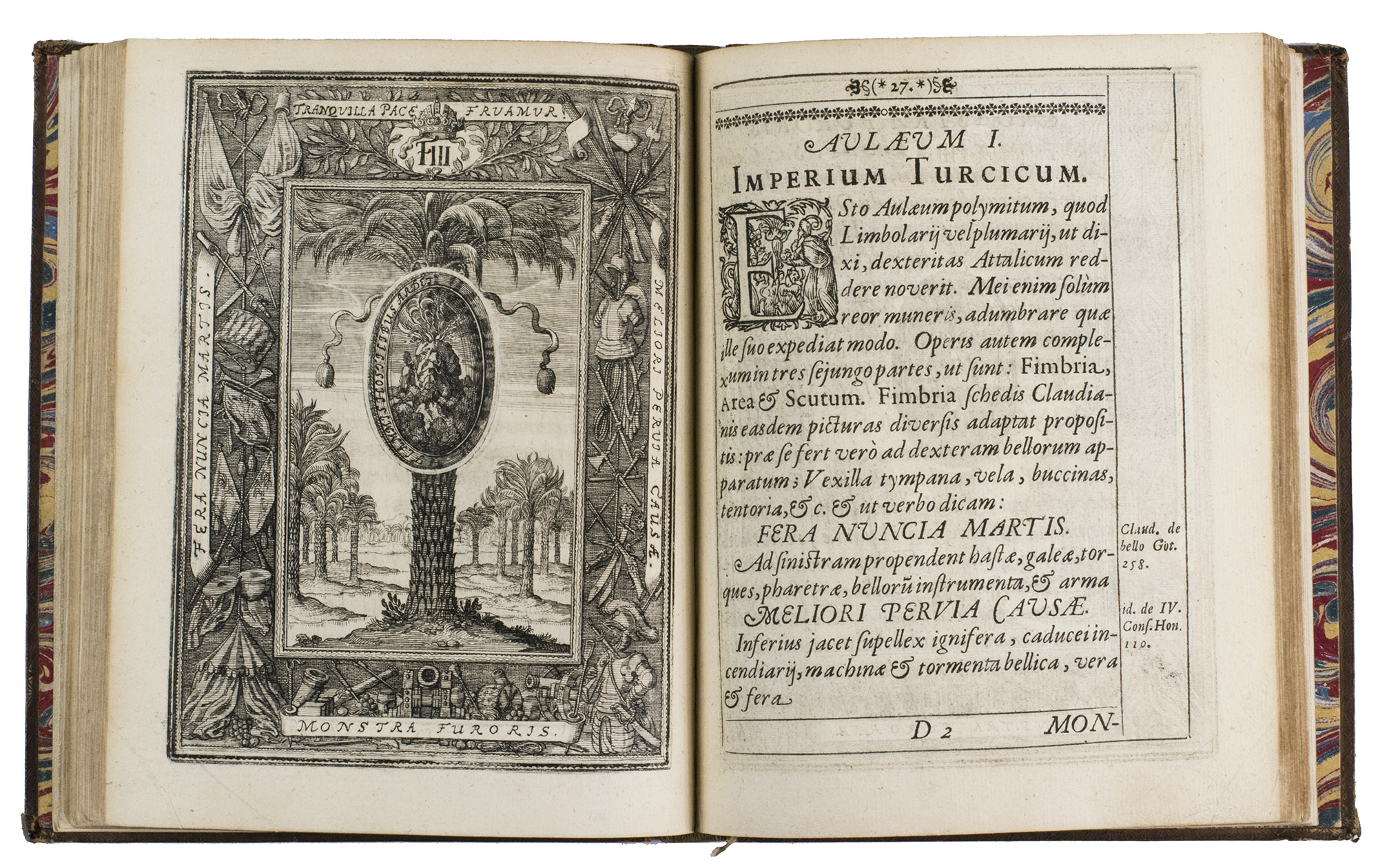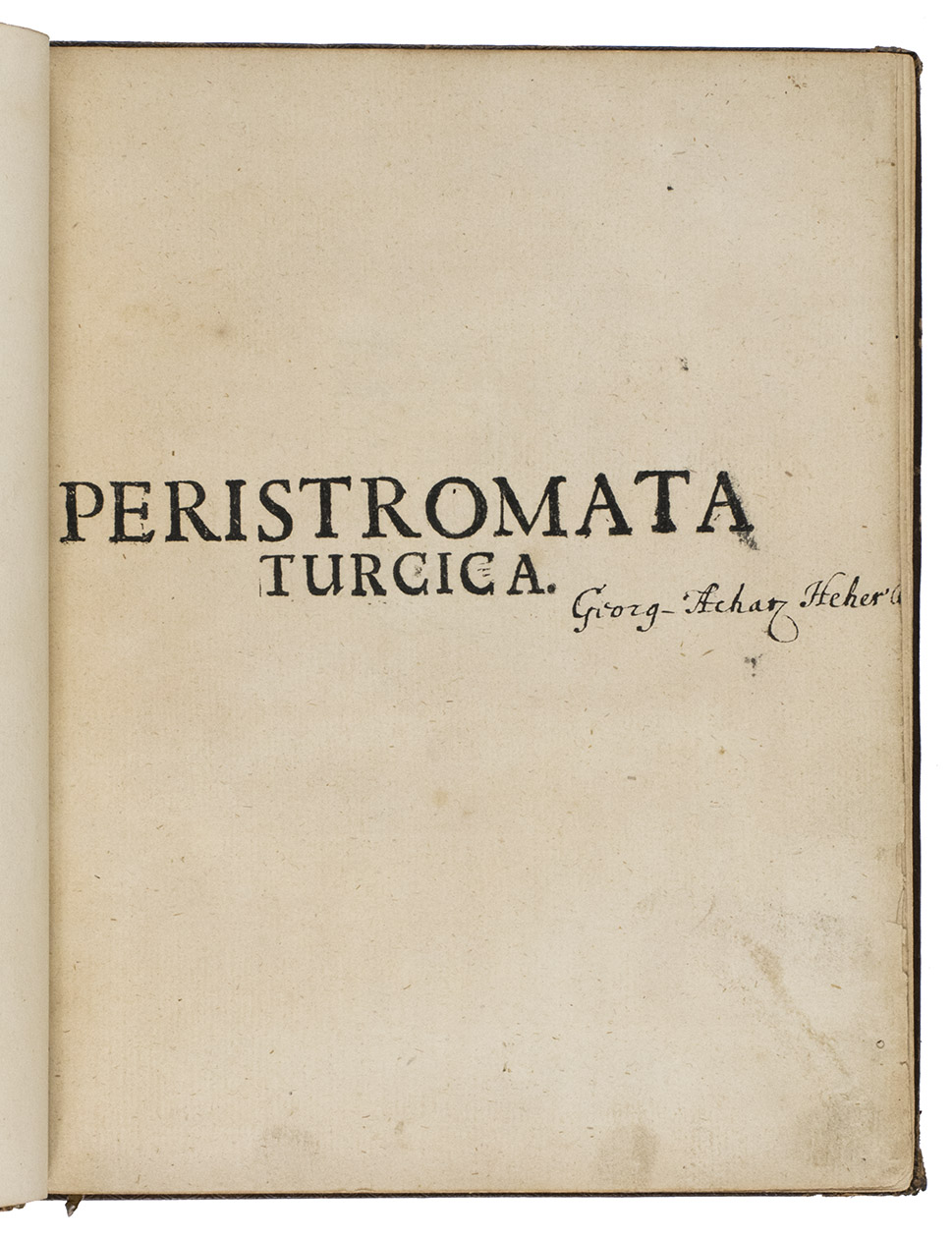 Rare first and only Latin editions (probably the first and only early editions in any language) of four closely related polemical pamphlets on European policy toward the Ottoman Empire. The publication was instigated by the prominent Nürnberg poet and jurist Georg Philipp Harsdörffer (1607-1658), who somehow got access to the French manuscripts of the pro-Richelieu Peristromata Turcica (Turkish carpets), and the anti-Richelieu Gallia deplorata, translated them into Latin, edited them for publication and added what is believed to be his own anti-French Latin rebuttal of the former, Germania deplorata. On 26 November 1641 he sent all three to the Calvinist Prince Ludwig of Anhalt-Köthen, founding president of the Fruchtbringende Gesellschaft in Weimar, who found the Peristromata Turcica shocking and dangerous, not only for its content but also because its remarkable and "seductive" graphic form. At a spring 1642 meeting of the society Ludwig initiated the writing and production of an emblematic rebuttal, the Aulaea Romana (Roman tapestries). Besides the political importance of these pamphlets as records of differing European attitudes toward the Ottoman Empire, they are remarkable graphic and typographic artefacts, early examples of colour printing and important emblemata.