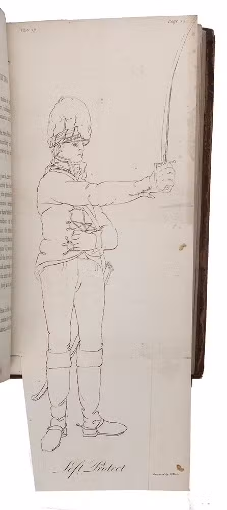 With a contemporary ownership annotation ("797, 11 April Peter Rhodes") on the title page. The work has been rebacked, with the original title label laid down, the edges and corners of the boards are scuffed, the boards have been scratched and chipped, resulting in some loss of leather on the back, which has been filled in with a dark paint. The work is slightly browned and foxed throughout, a few plates are slightly torn along the fold, the margins of some of the plates have been cut smaller to ease folding, without affecting the image, lacking the final blank. Otherwise in good condition. Pardoel 919.01 (under Fawcett, William); Thimm, p. 250; Yallop, H., "The sword exercises of the British Cavalry: 1796-1858," in: Acta periodica duellatorum, 8, (1), 2020, pp. 123-156.