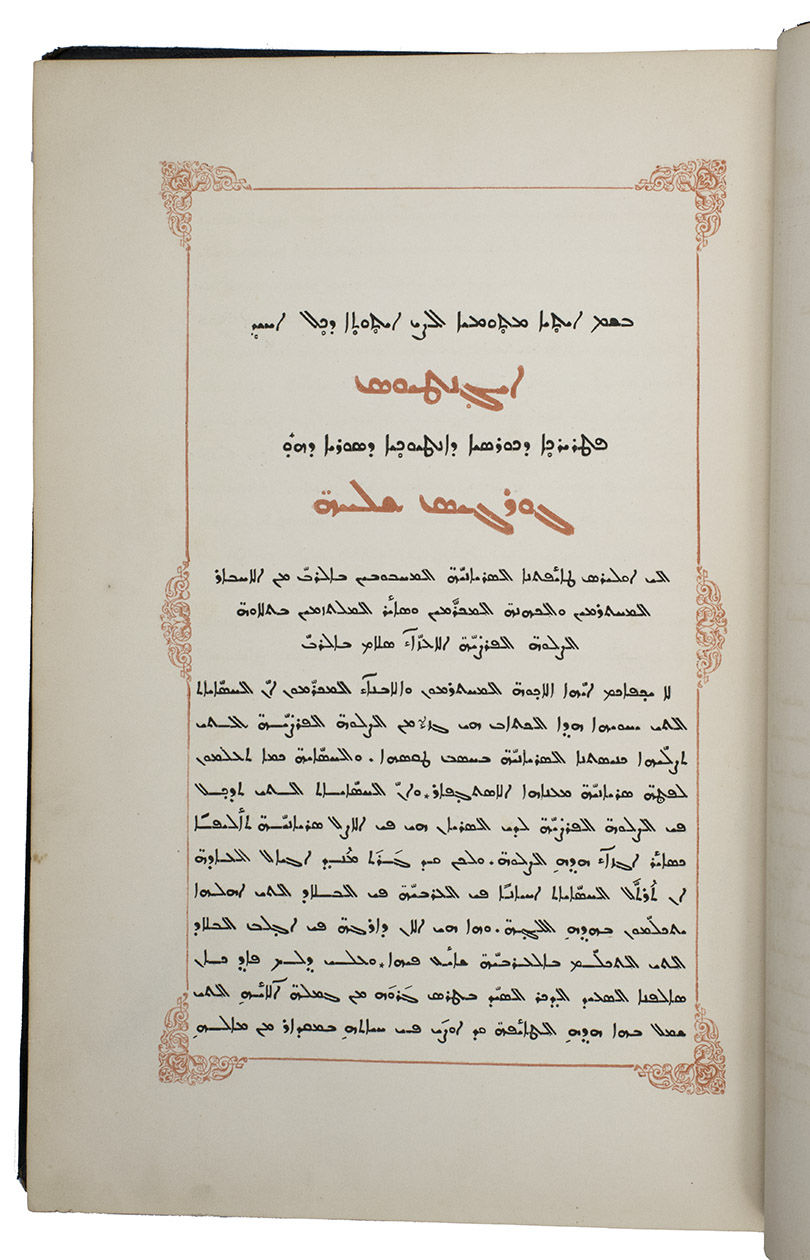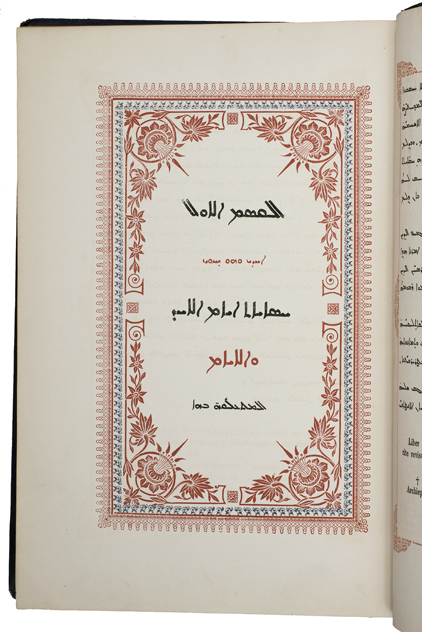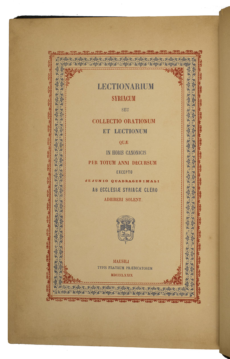 Mosul, typis Fratrum Praedicatorum (= Dominican printing office), 1879. Folio. With a Latin title-page set in roman type and a Syriac title-page set in Syriac type, both within a red and blue ornamental frame. Preliminary leaves also set within a red ornamental frame. Text set in Syriac type and printed in black and red. With a few religious illustrations throughout the text.  Contemporary half blue sheepskin, blue cloth sides, gold-tooled spine lettered (in Syriac) in gold, marbled endpapers. 648 pp.