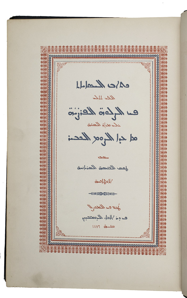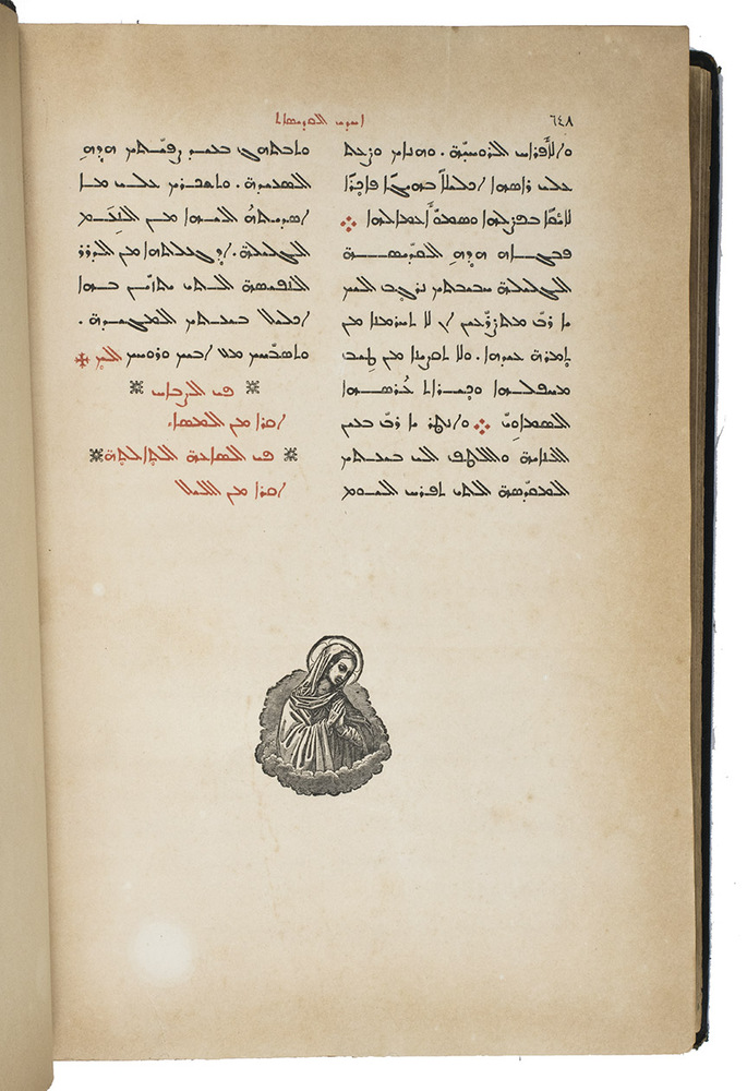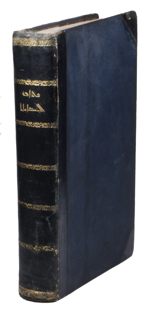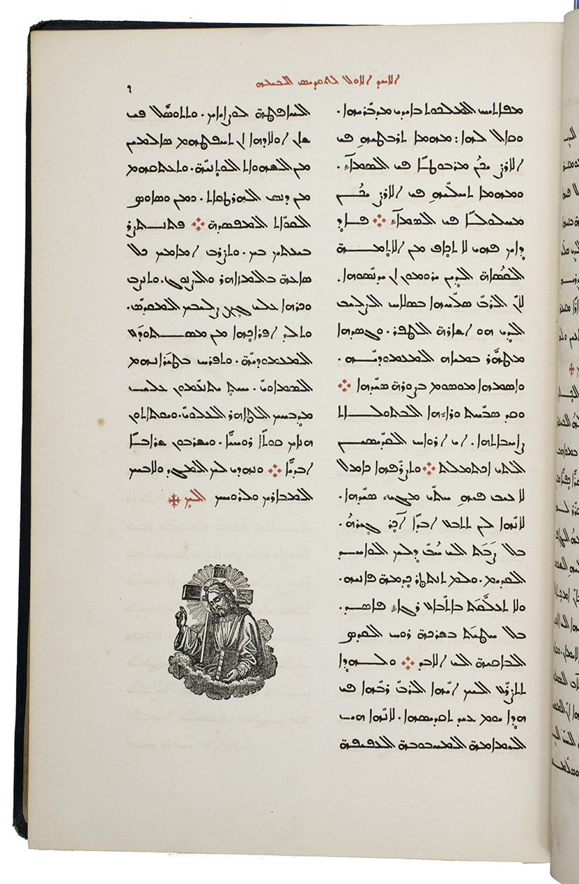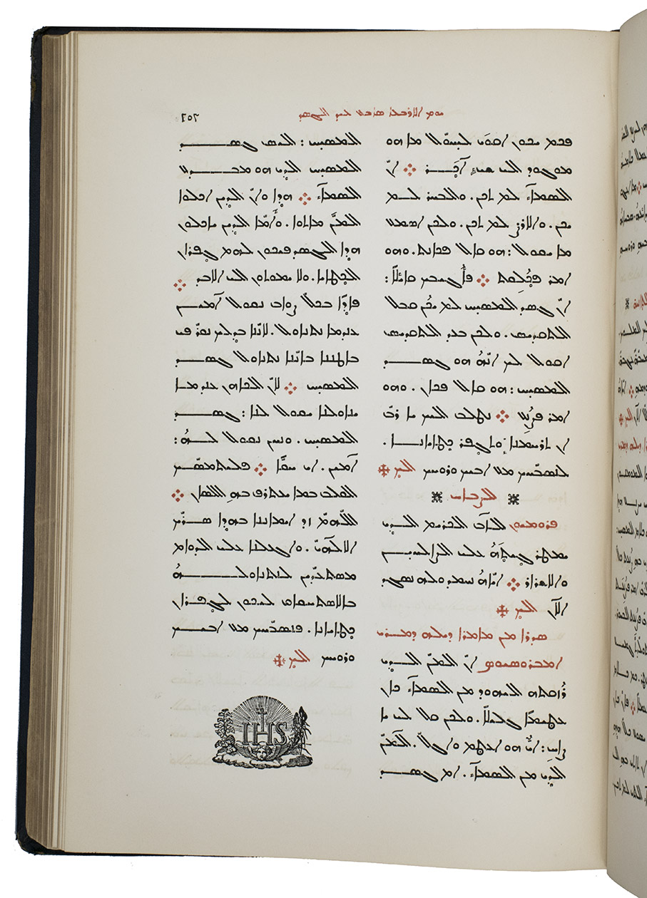 Mosul, typis Fratrum Praedicatorum (= Dominican printing office), 1879. Folio. With a Latin title-page set in roman type and a Syriac title-page set in Syriac type, both within a red and blue ornamental frame. Preliminary leaves also set within a red ornamental frame. Text set in Syriac type and printed in black and red. With a few religious illustrations throughout the text.  Contemporary half blue sheepskin, blue cloth sides, gold-tooled spine lettered (in Syriac) in gold, marbled endpapers. 648 pp.