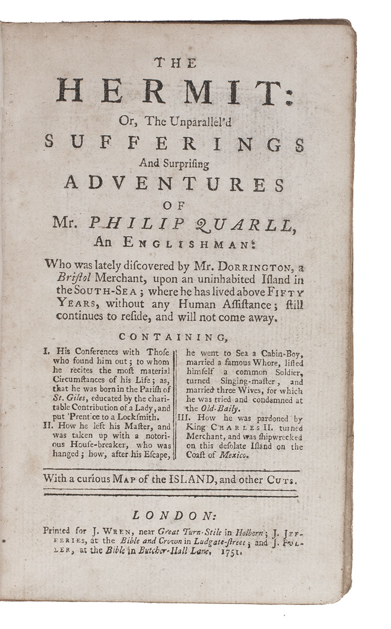 The hermit: or, the unparalleld sufferings and surprising adventures of Mr. Philip Quarll, an Englishman: who was lately discovered by Mr. Dorrington, a Bristol merchant, upon an uninhabited island in the South-Sea...