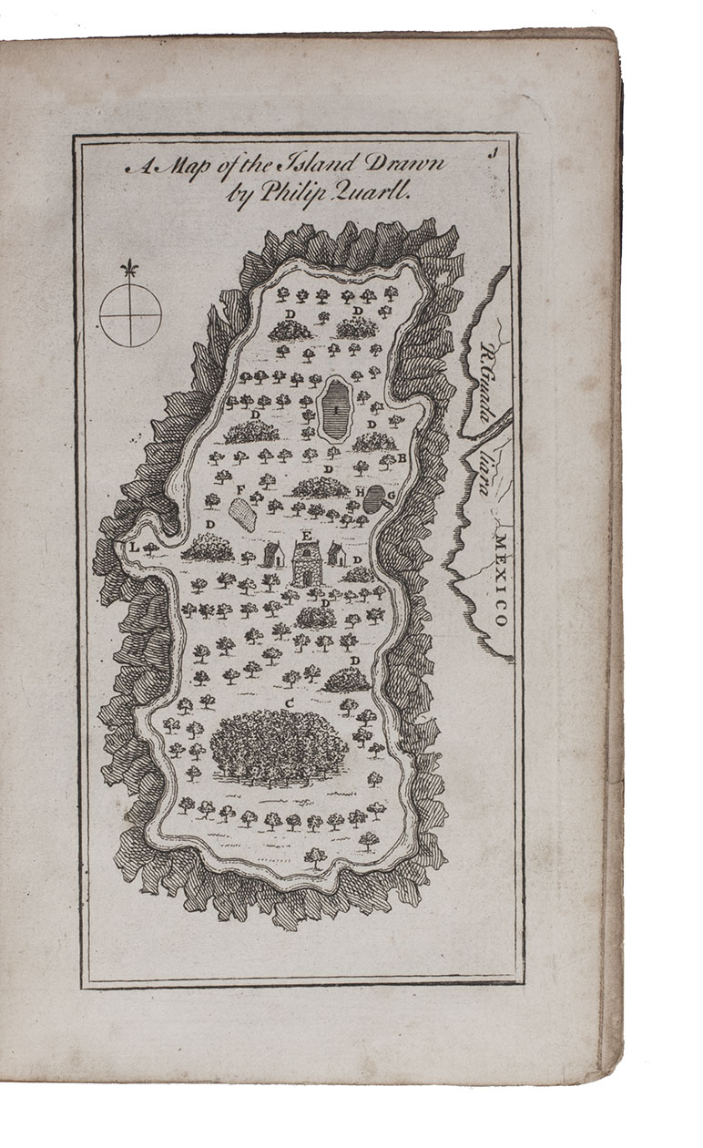Rare third edition of a popular account of an imaginary voyage and robinsonade, written by Peter Longueville. The first edition was published in 1727, and "became an enormously popular work, rivalling Defoe's Robinson Crusoe, of which it is possibly the best imitation" (Howgego). The story tells about the imaginative Englishman Philip Quarll, who shipwrecked near an uninhabited island in the South Sea where he continued to live for almost fifty years. It starts with the voyage of the Bristol merchant Edward Dorrington, who discovered Quarll in 1725. He gives an extensive account of Quarll's life, starting with his adventures in England, where he married three wives before becoming a merchant seaman. Stranding on the island, he had to build a home and survive. The book relates remarkable events involving sea monsters and Quarll's pet monkey Beaufidelle. "Apart from occasional intrusions by bloodthirsty Indians and marauding Russian pirates, life in his 'second Garden of Eden' is carefree and idyllic, so much so that he refuses Dorrington's invitation to return to England" (Howgego).Somewhat browned, foxed and with a few marginal water stains. Overall a good copy. Corners of binding bumped and worn, hinges cracked, lacking the front flyleaf. ESTC (7 copies); Gove, pp. 262-268; Howgego, Invented narratives, L45; cf. Howgego, to 1800, F36; Negley, Utopian Literature, 1462; Sabin 66952; Ullrich IV, pp. 118-119.