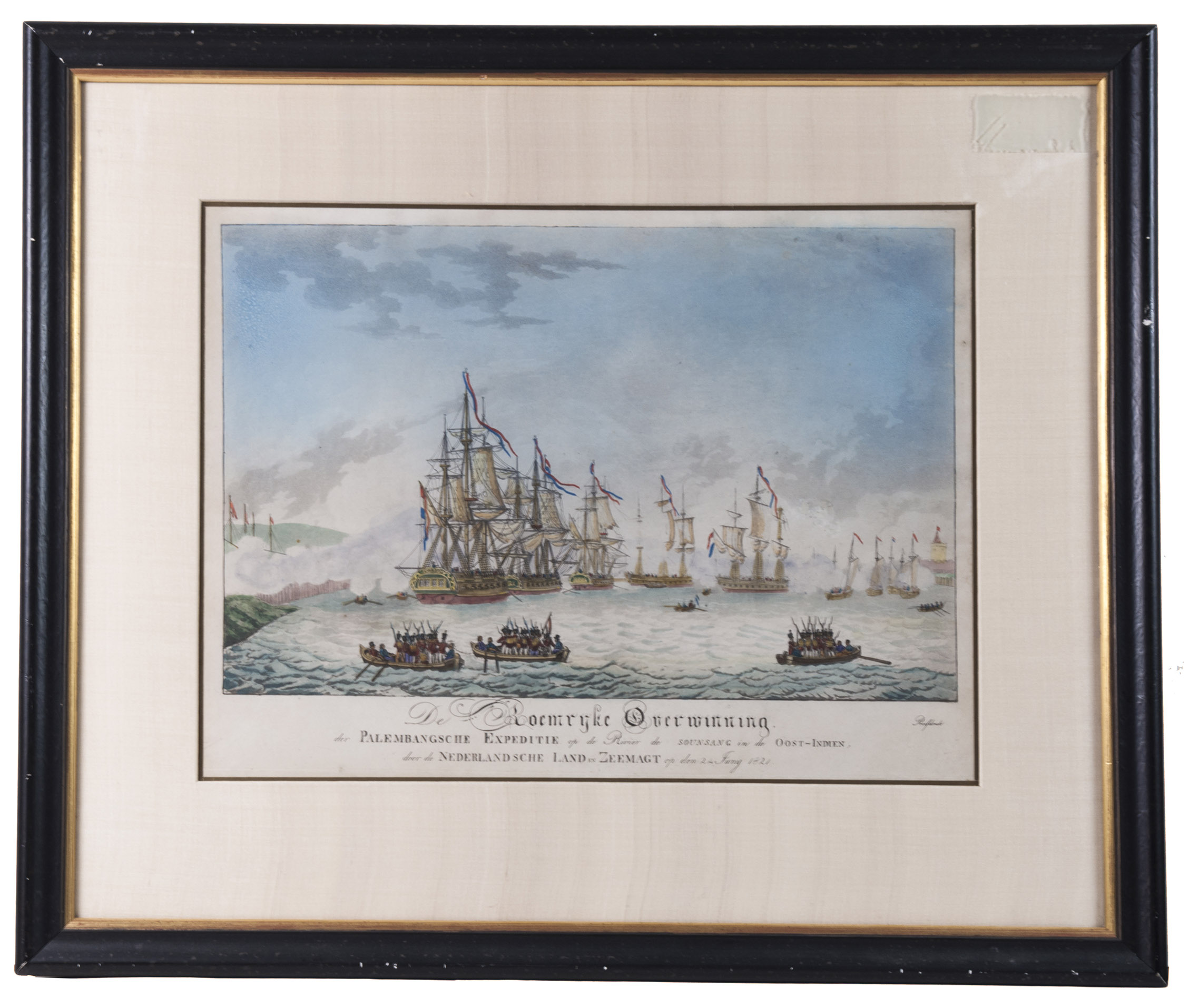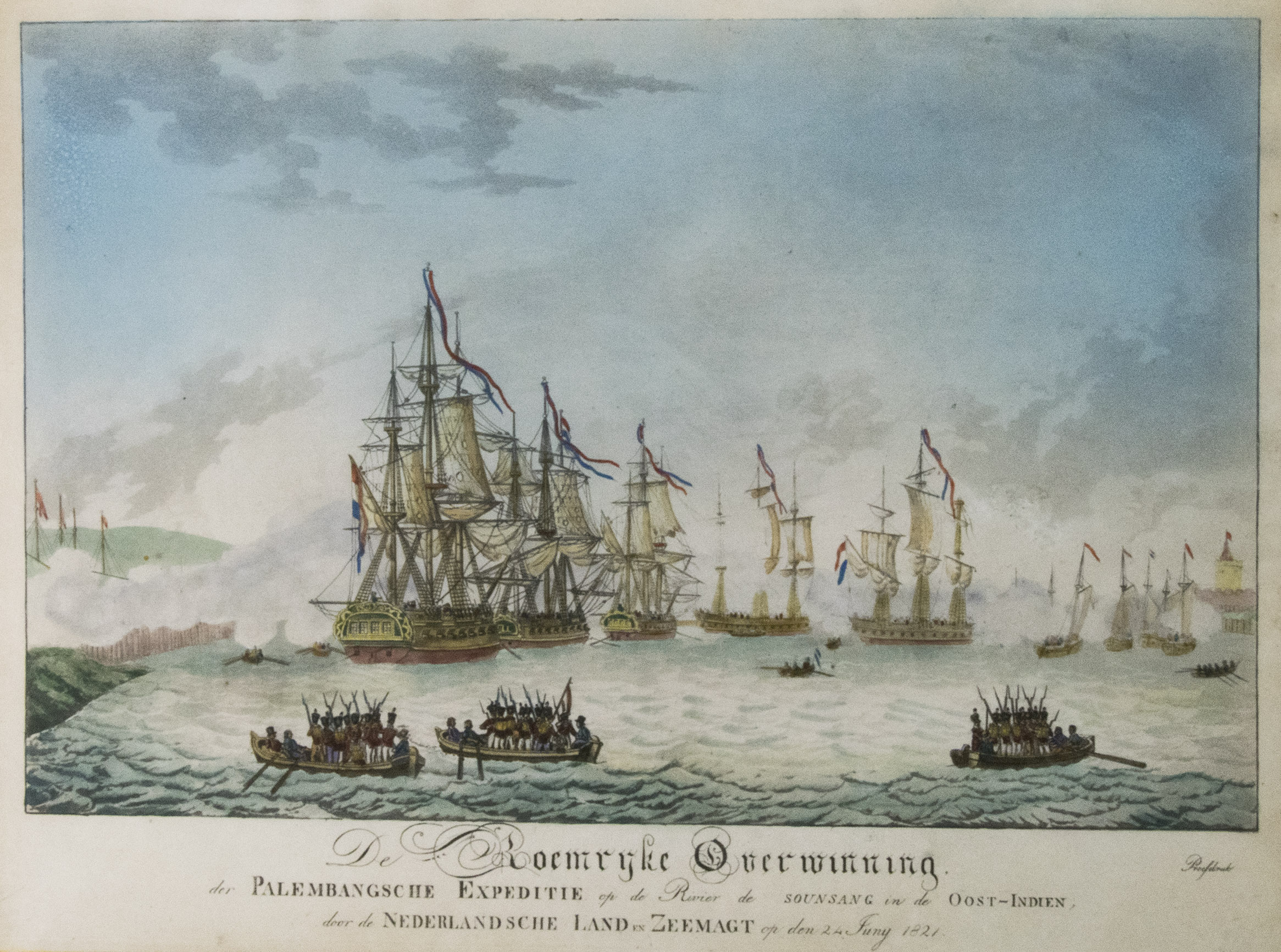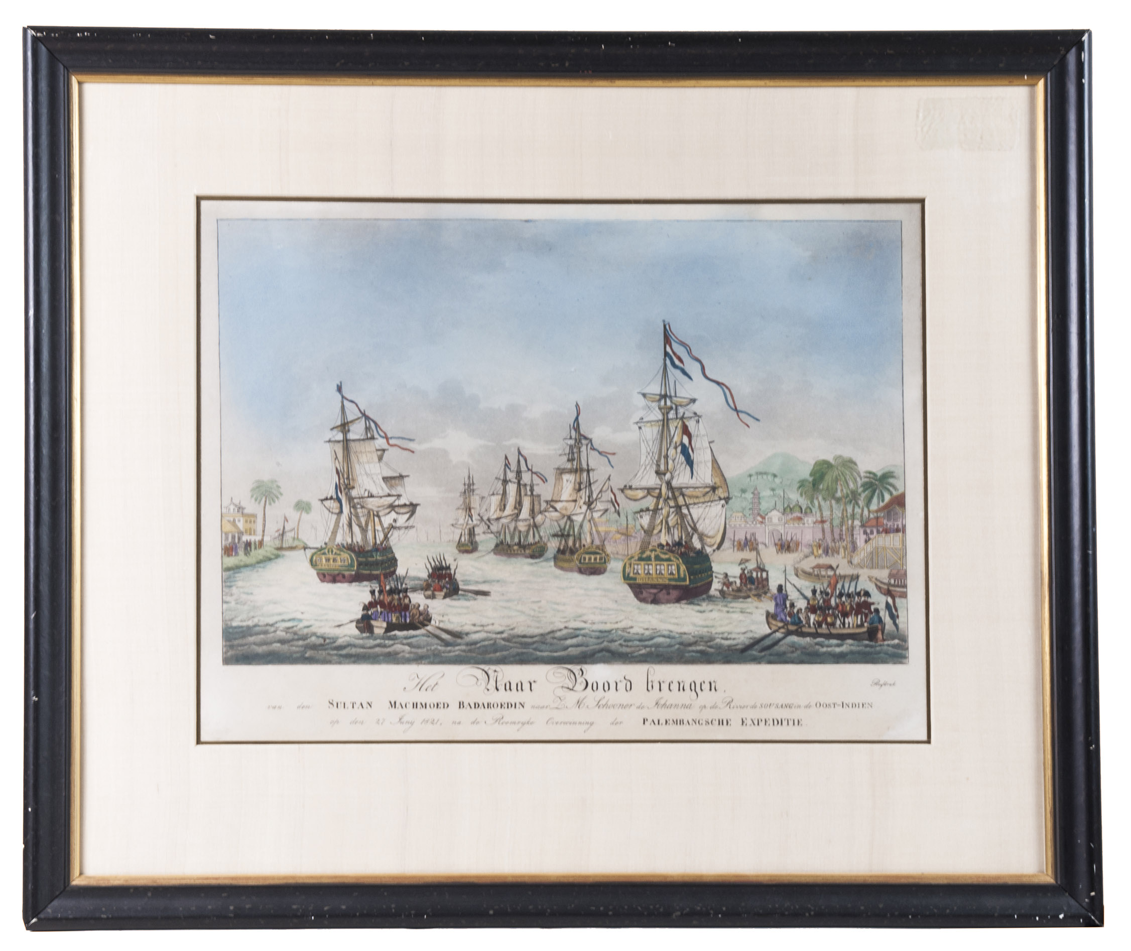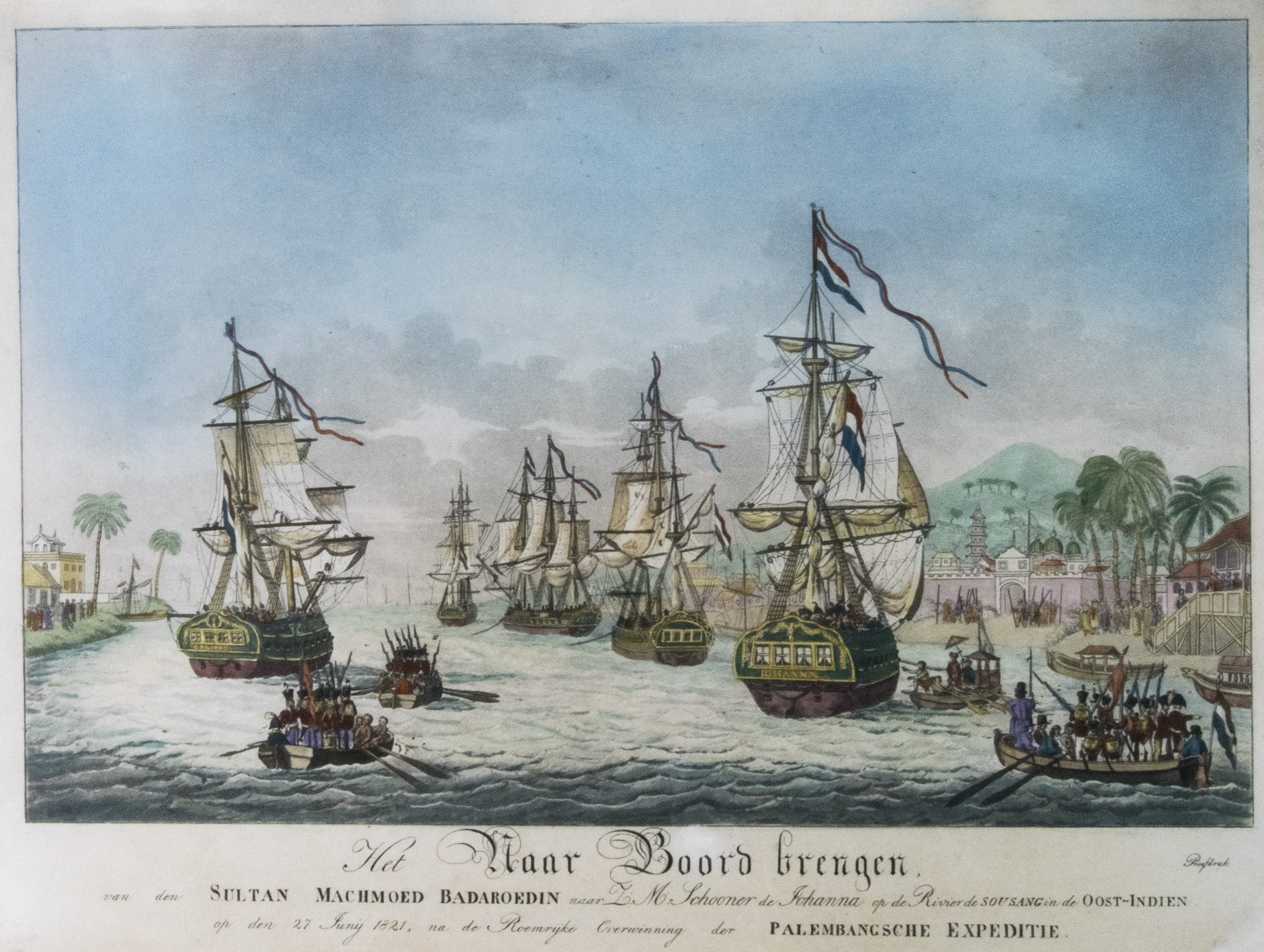 In May 1821, under command of the Dutch general Hendrik Merkus de Kock (1779-1845), the Dutch army left the port of Batavia (now Jakarta) with 32 warships and 14 transport ships containing a total of almost 1.500 combat troops. On 24 June, the Sultans defensive positions along the Soengsang river (nearby the island of Gombora) were shelled from the Dutch warships and subsequently captured, the first aquatint shows this successful attack (with in the foreground the Dutch infantry approaching the riverside in sloops). On 27 June, the Sultan decided to surrender and the second aquatint shows his arrival at the Dutch frigate "Johanna", lying before the city of Palembang. After his arrest, the Sultan was transferred to the island of Java where he lived as a state prisoner until his death in 1852. In October 1823, the Palembang Sultanate was dissolved and placed under direct Dutch rule.