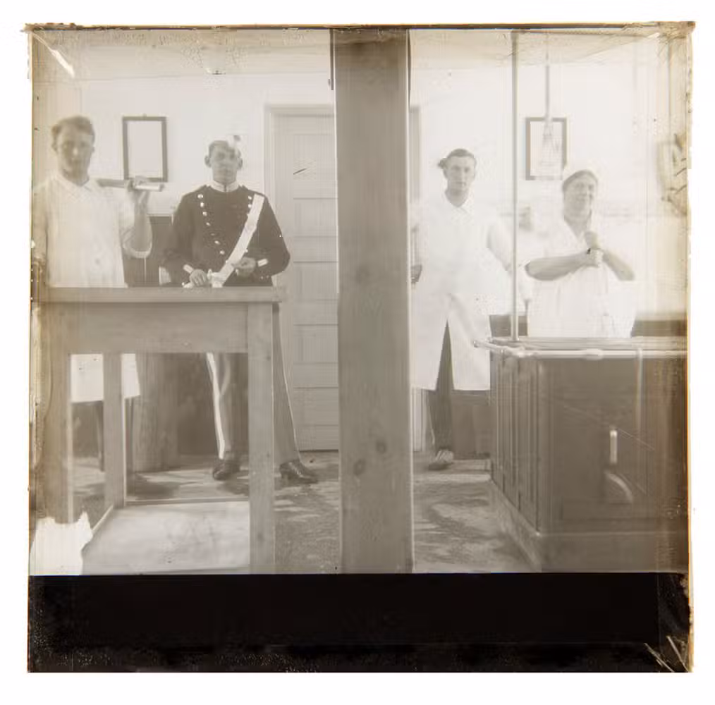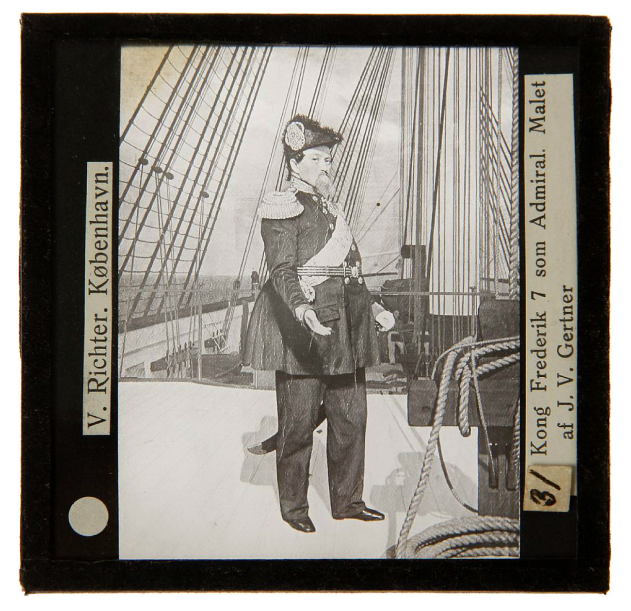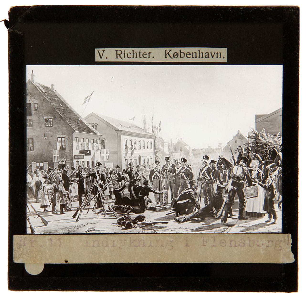 Remarkable, all-encompassing collection of turn-of-the-century magic lantern slides. Several of the slides show cavalry horses: the "Krigen, 1848-1864" set includes (no. 45) an equestrian portrait of General Bülow, victor of the 1849 Battle of Fredericia, painted by Aug. Jerndorff; (no. 29) Friedrich von Schleppegrell riding at the battle of Isted; (no. 26) General Krogh on horseback (all V. Richter, Kopenhagen); no. 20. captioned "Pferdeablieferung" (horse delivery).