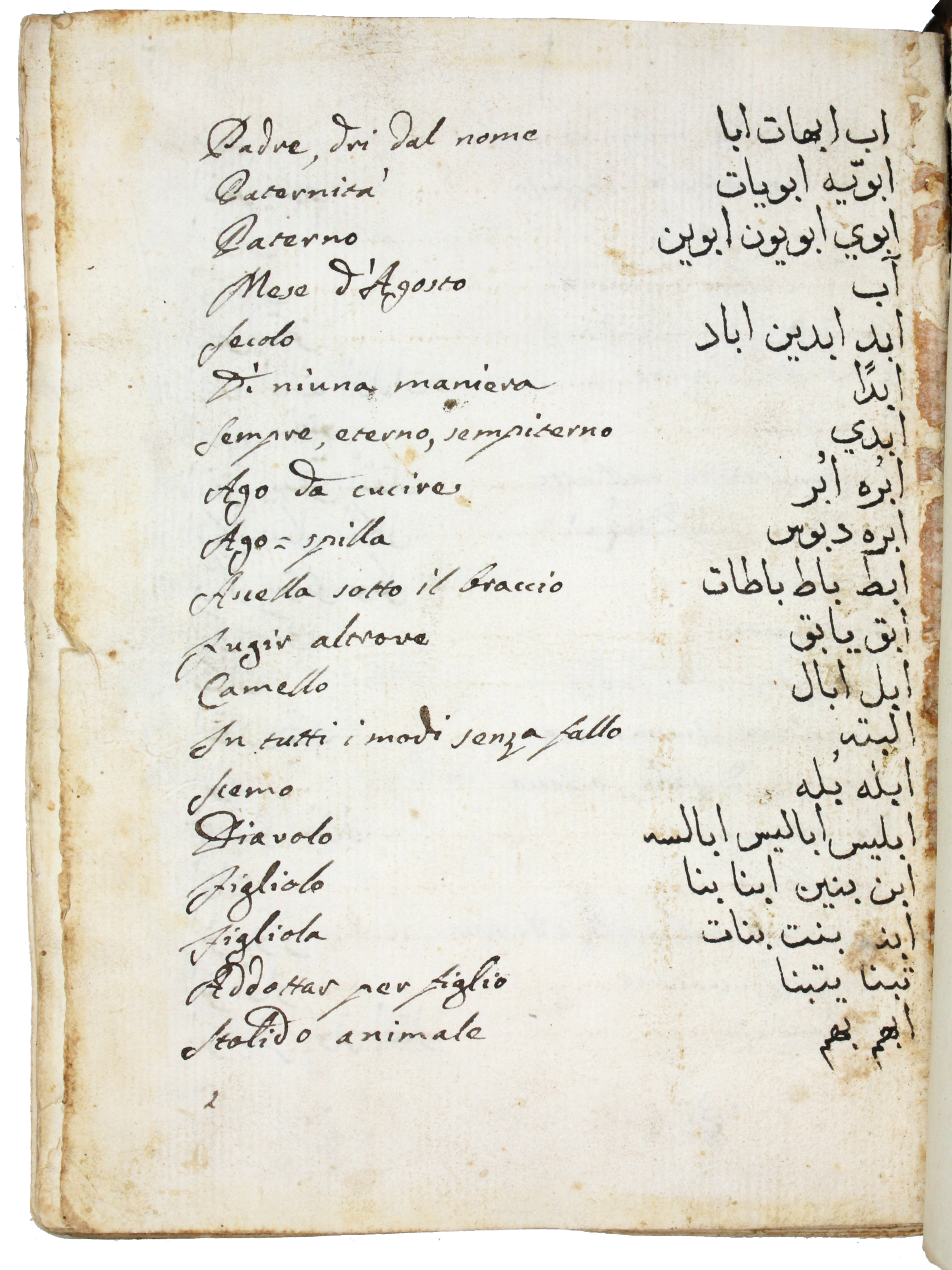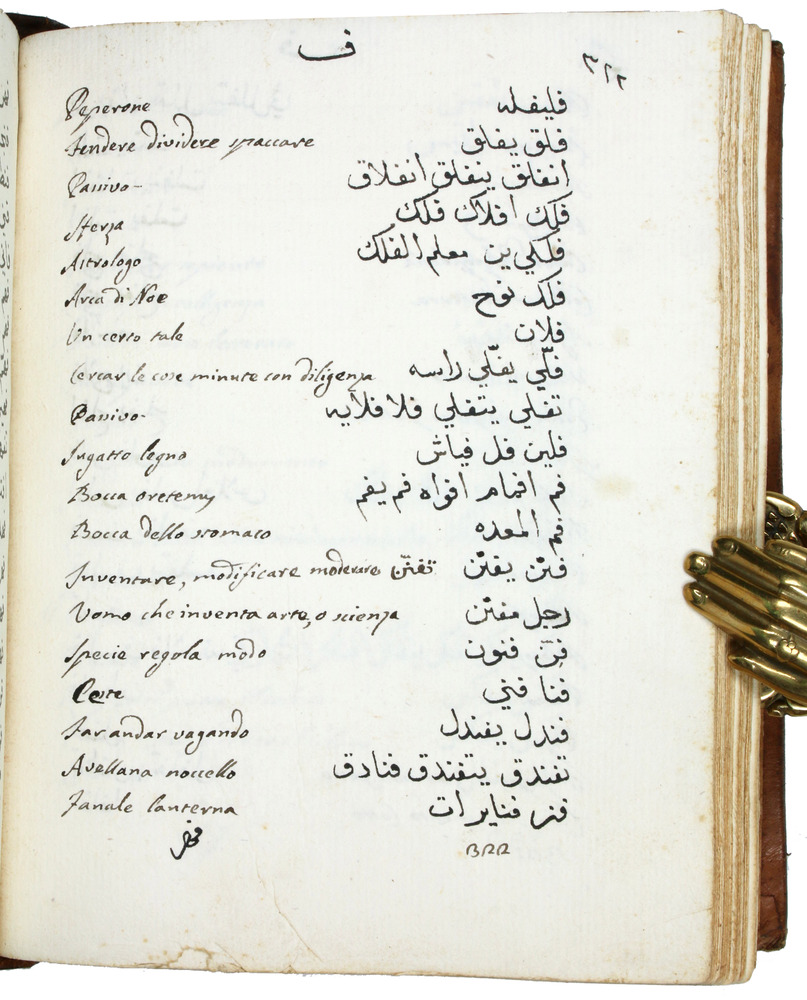 Manuscript dictionary comprising some 9,000 Arabic terms and their Italian translations. It was formerly owned by the German oriental scholar and Franciscan priest Arsenius Rehm (1738-1808), who lived in Cairo between 1769 and 1776, building a large collection of manuscripts, which he brought with him when he worked for some time at the Franciscan abbey of Frauenberg at Fulda, Hesse. After his death his collection remained at the monastery until it was purchased by the Benedictine Abbey of St Boniface (Munich) in 1852. The present volume, which had not been part of the collection proper, remained in Frauenberg, whose library was dispersed in 2021 by the Franciscan Province. "The library includes a fairly extensive Arabic dictionary of his, though not written by him. It offers only the Italian translation of the Arabic words. In the Arabic style it begins, from our perspective, at the end" (cf. Bihl).