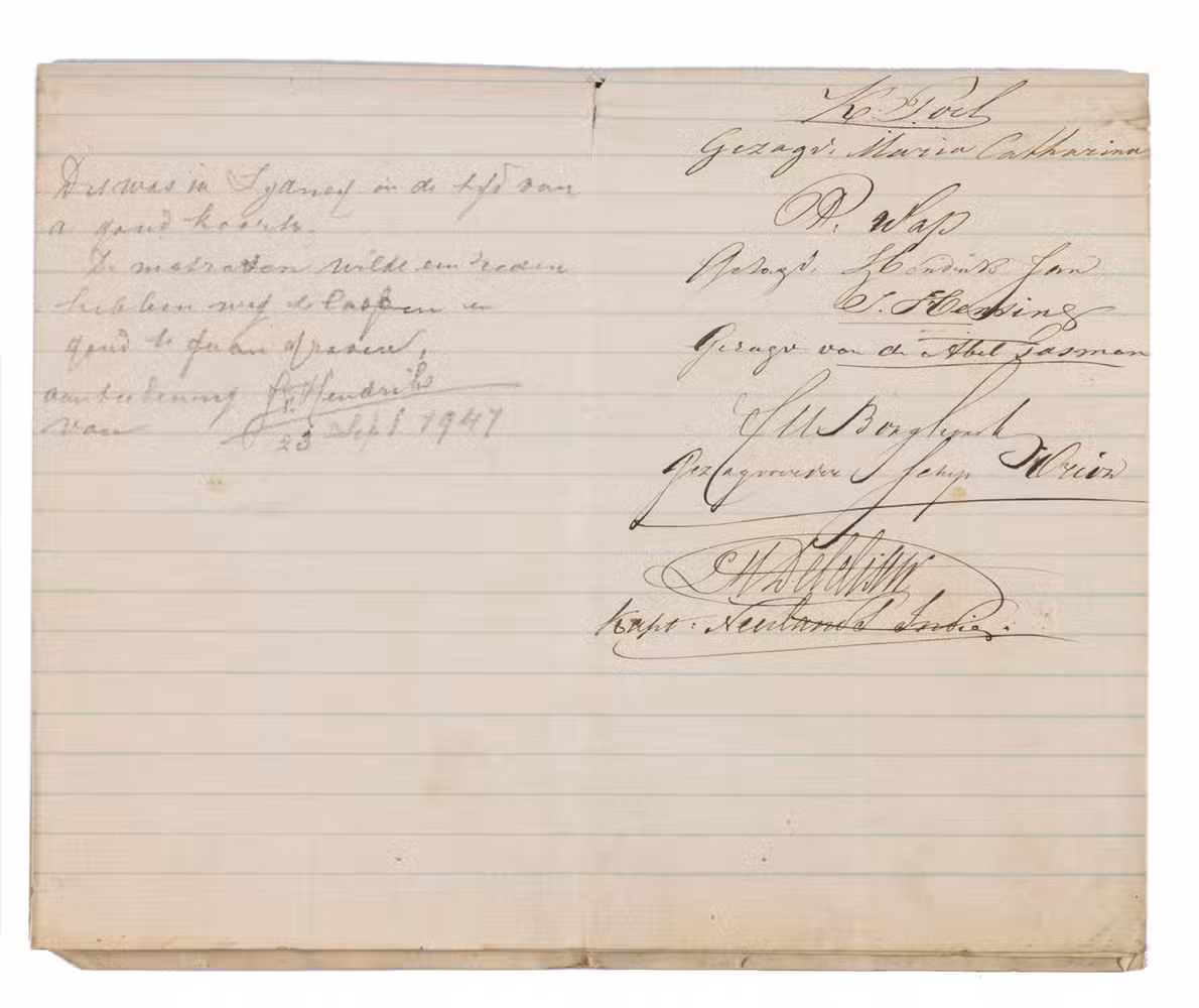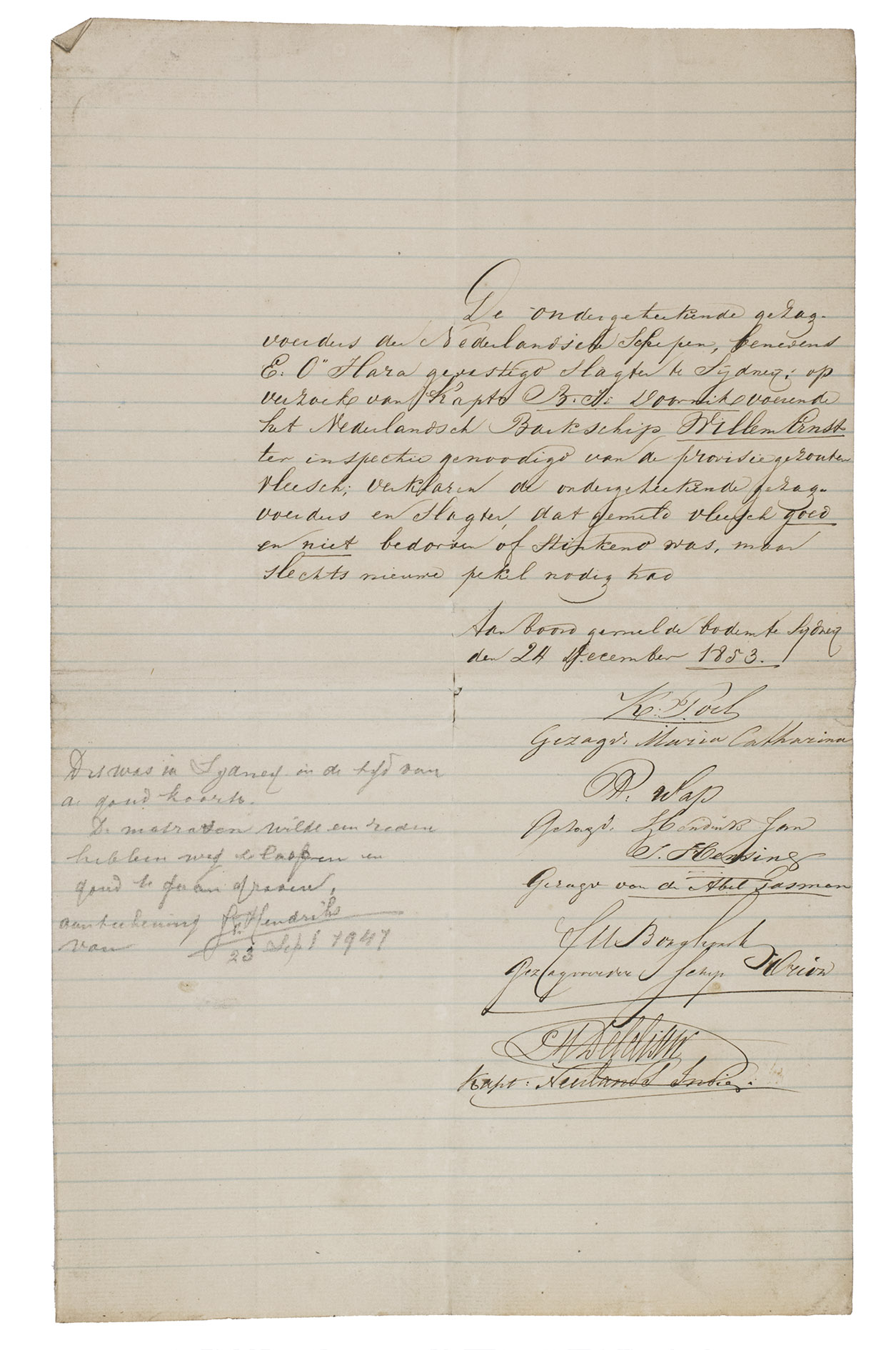 The declaration is written on the recto of the first leaf of a blue-ruled double-leaf and signed on board of the Willem Ernst in the harbour of Sydney on 24 December 1853. The five captains had inspected the meat on request of the captain of the Willem Ernst, Batholomeus Justus Doornik (1802-1867), and the butcher, Edward OHara (1811-1863), living in Sydney. The five captains were: Klaas Poel (1819-1858), captain of the Maria Catherina (built in 1852); P. Wap, captain of the Hendrik Jan; J. Henting, captain of the Abel Tasman; Cornelis Marinus Borghorst (1811-?), from 1848-1859 captain of the Orion; and L. M. Delcliseur, captain of the Neerlands Indië.