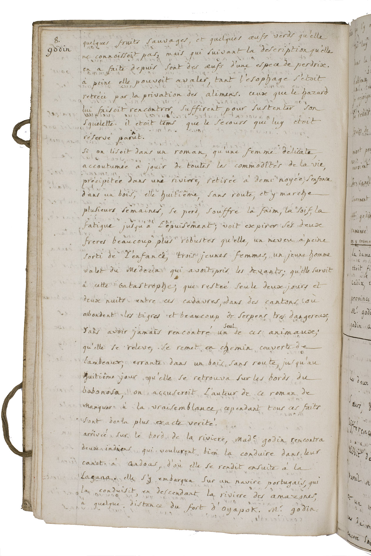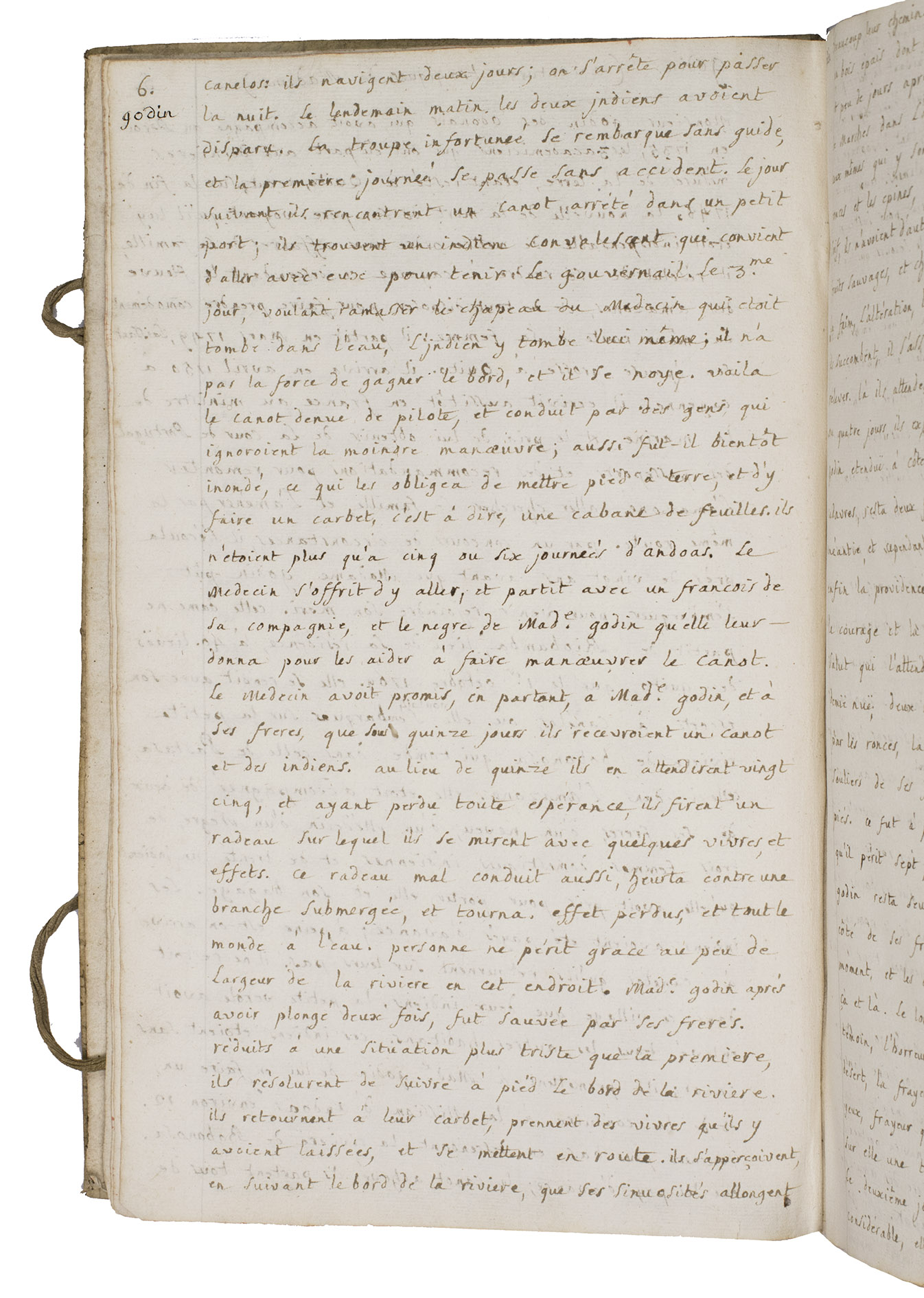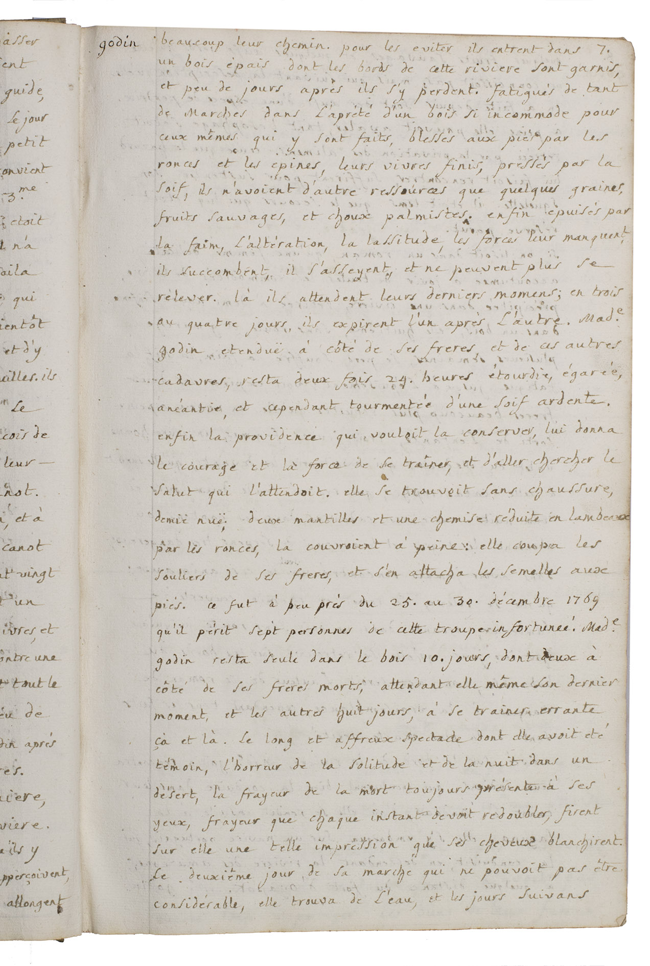 Pp. 5-9, are devoted to "Godin (aventures tragiques de Madame)", referring to Jean Godin des Odonais (1713-1792) and, more poignantly, to his wife Isabel Godin (1728-1792). After participating in the French geodesic mission to South America led by La Condamine, Jean Godin remained abroad for decades. Isabel, separated from her husband for 20 years, attempted a catastrophic descent of the Amazon in order to re-join him. Of the party that set out, most perished, she survived alone in the forest for several days before being rescued and ultimately reaching Cayenne.