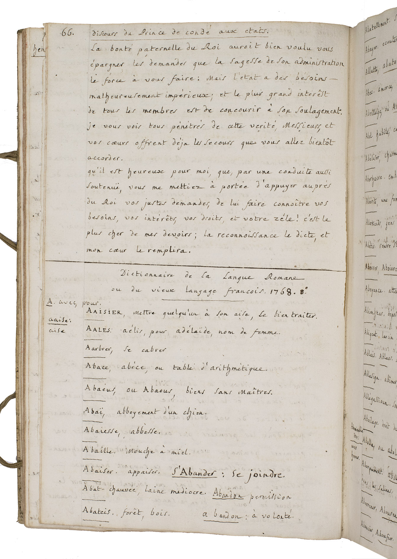 The largest portion of the manuscript (pp. 66-262) consists of a substantial transcript of the Dictionnaire de la langue romane ou du vieux langage françois (1768, 8vo), demonstrating sustained philological interest.