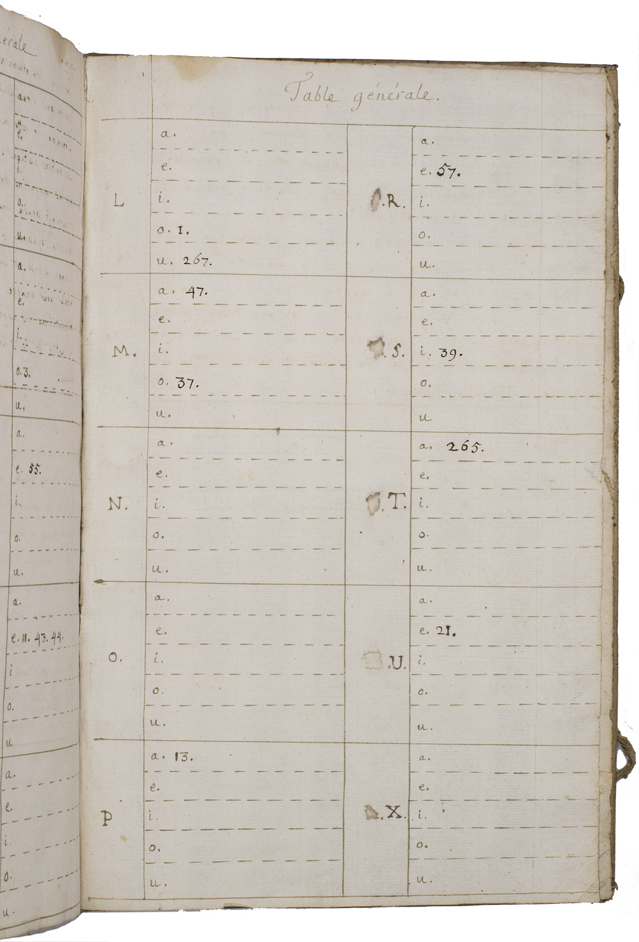 [France?, second half of the 18th century]. Folio (ca. 36.5 x 23 cm). French manuscript on paper, written in a neat 18th-century hand in brown and black ink, 26-28 lines to the page. Repurposed vellum from a 17th-century manuscript, with the manuscript title "Miscellanea" on the front board and the spine, and 2 pairs of cloth ties. 267, [2], [1 blank] pp.