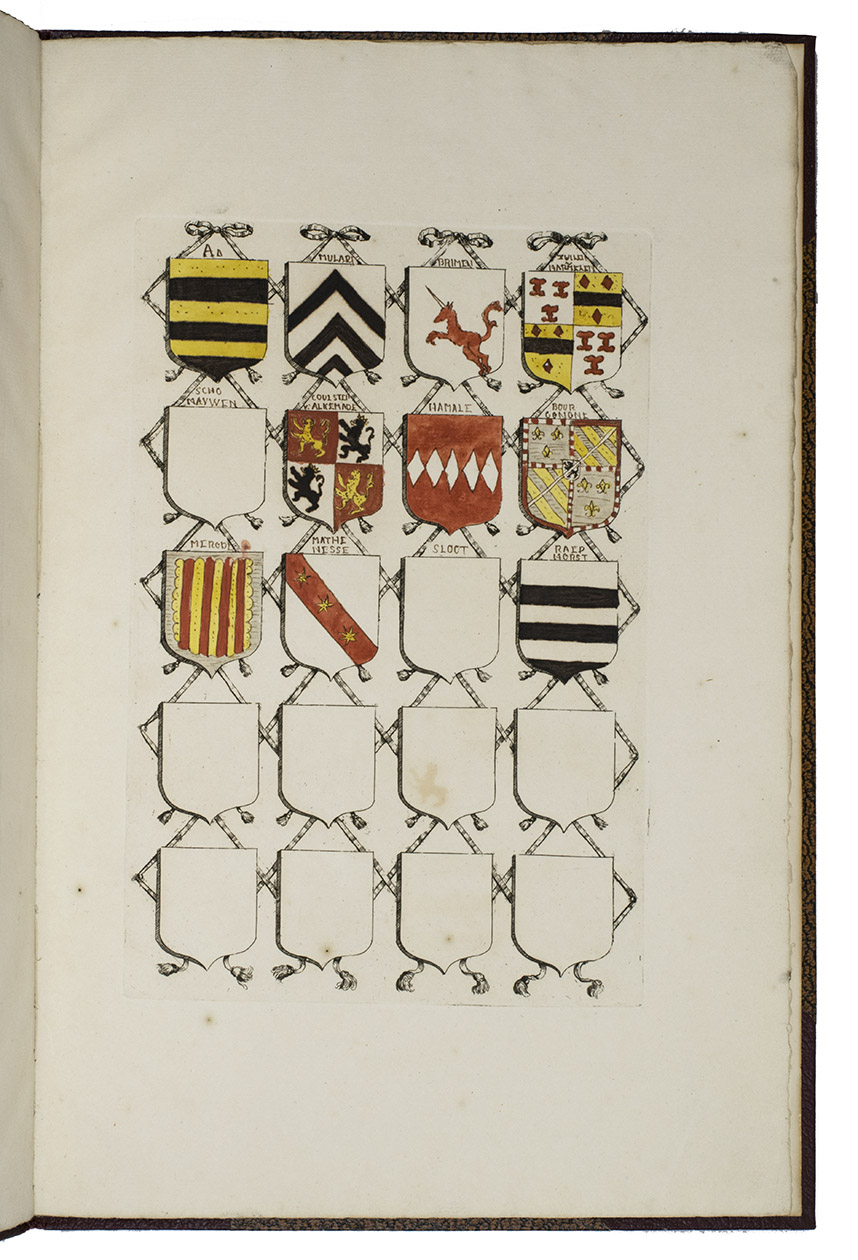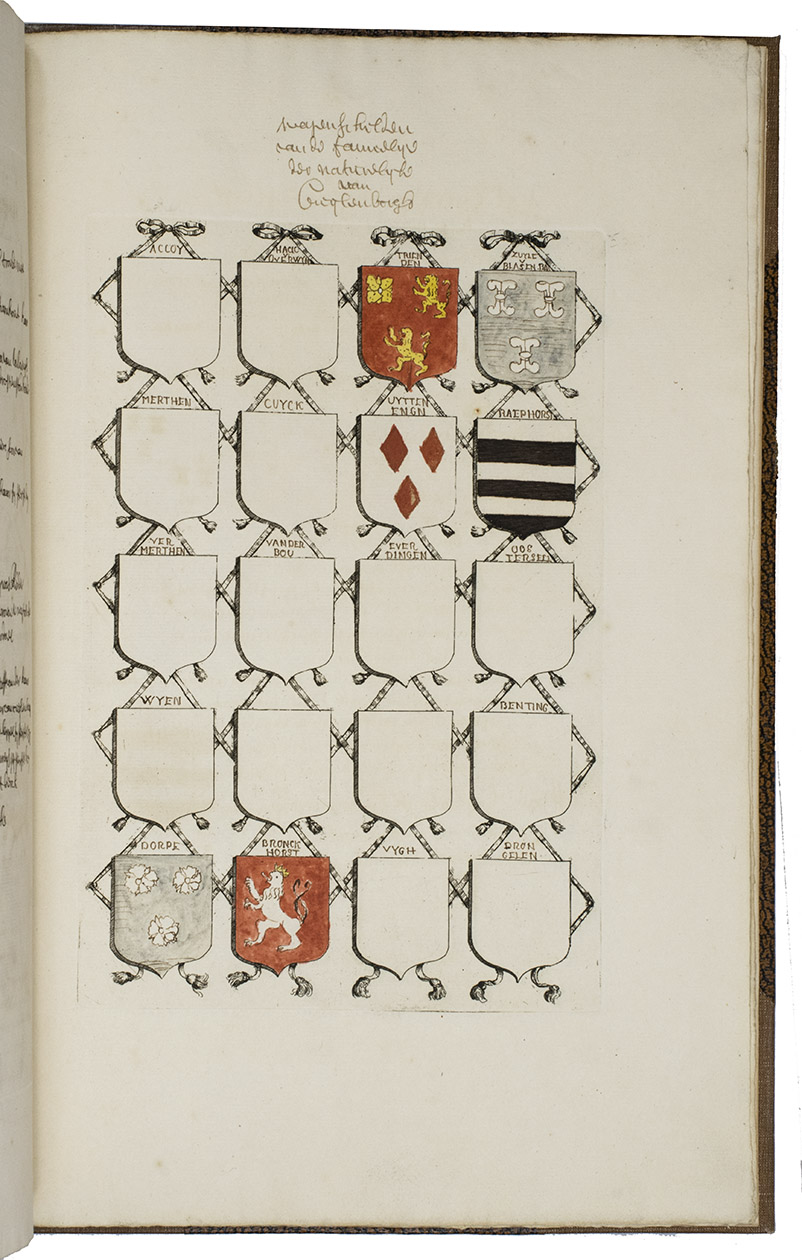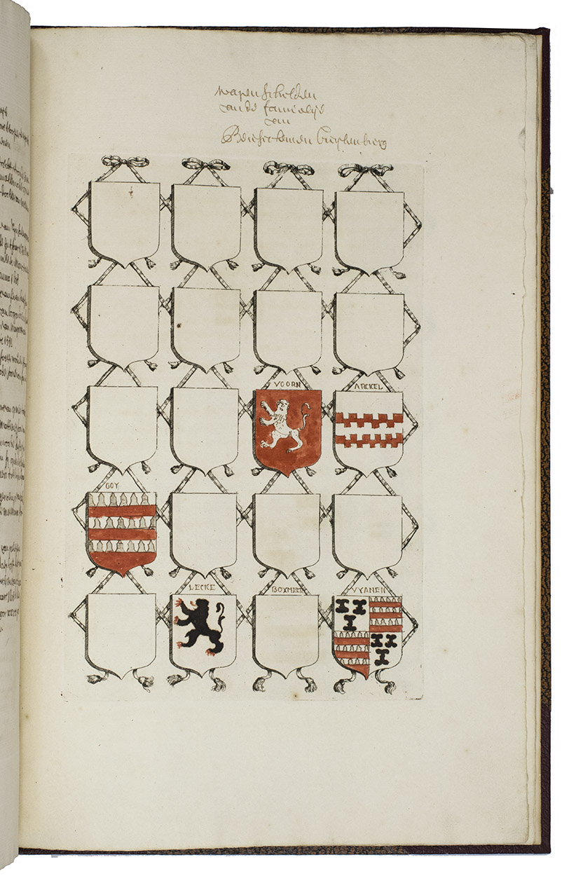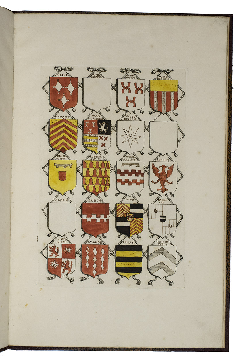 [Utrecht, Culemborg or Beusichem?], ca. 1655-1675, after 1654]. 2 volumes. Large folio. Manuscript in Dutch, written in one hand in a neat, 17th-century hand cursive hand. With 65 coat of arms, almost all of them coloured by hand. Also with some spaces for coats of arms left blank. A loose leaf added to volume with 34 ink-drawn and contemporary hand-coloured small coats of arms with accompanying text written in a cursive 17th-century hand. 19th-century half brown cloth (vol. 1) and red buckram (vol. 2), brown decorated paper sides, titles in gold on the front boards. [4 (plus 1 loose leaf)]; [8] ll.
