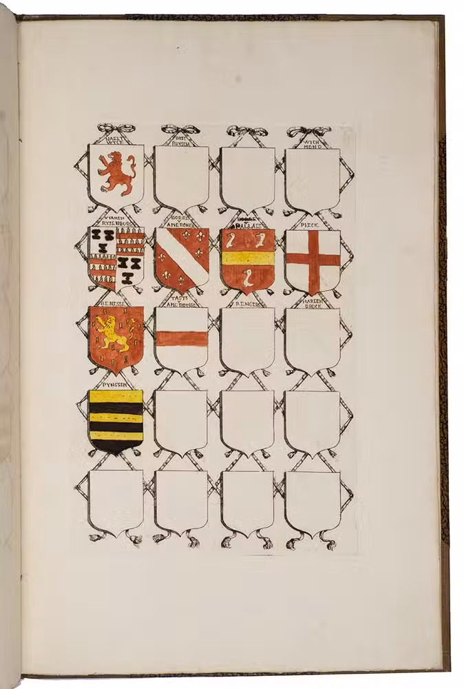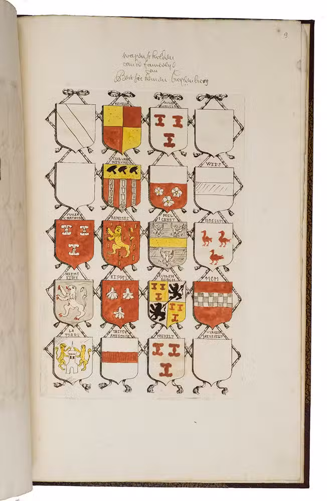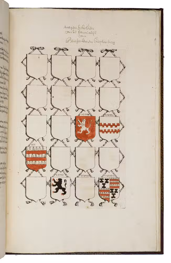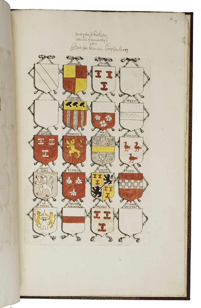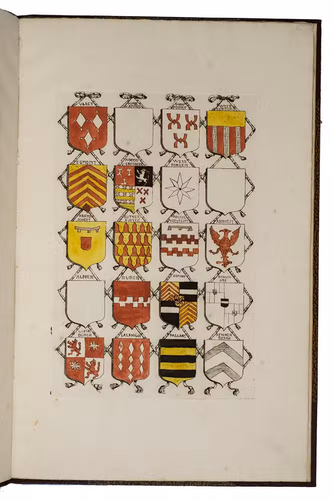 [Utrecht, Culemborg or Beusichem?], ca. 1655-1675, after 1654]. 2 volumes. Large folio. Manuscript in Dutch, written in one hand in a neat, 17th-century hand cursive hand. With 65 coat of arms, almost all of them coloured by hand. Also with some spaces for coats of arms left blank. A loose leaf added to volume with 34 ink-drawn and contemporary hand-coloured small coats of arms with accompanying text written in a cursive 17th-century hand. 19th-century half brown cloth (vol. 1) and red buckram (vol. 2), brown decorated paper sides, titles in gold on the front boards. [4 (plus 1 loose leaf)]; [8] ll.