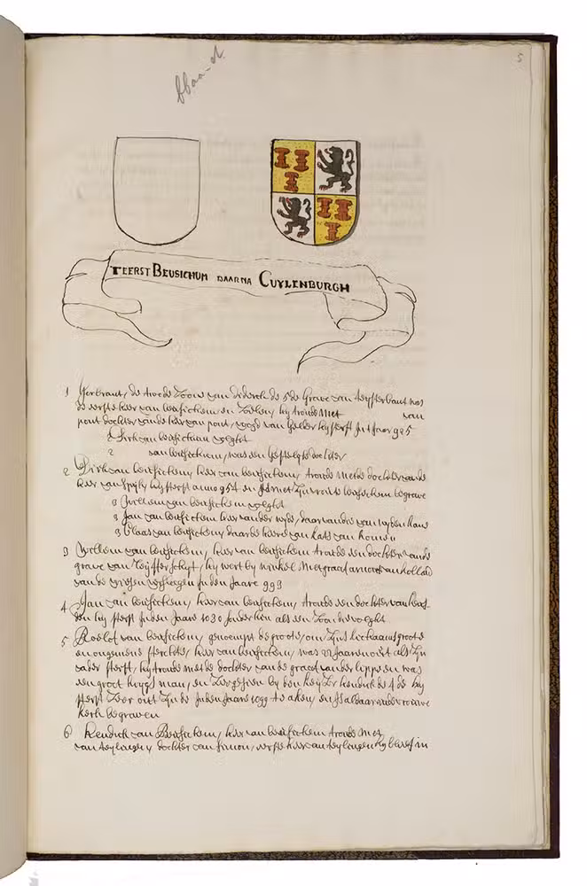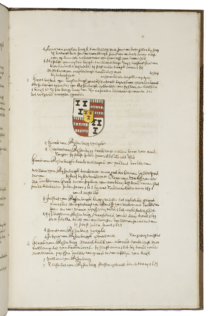 Very interesting manuscript genealogies of two highly important Dutch noble families originating from the city of Culemborg and the village Beusichem, south-east of Utrecht, together with their allied Dutch, Flemish and Hainaut families, running from ca. 925 till ca. 1650 (latest entry in the manuscript dated 1654). Both volumes are written in the same hand, probably in the third quarter of the seventeenth century, and elaborately illustrated with different hand-coloured coat of arms. The first volume contains coat of arms from, among others, important Dutch families as Uytten Enge, Raephorst, Bronckhorst, Vyanen-Rijsenburg, Borre van Amerongen, Taets van Amerongen and Reness; the second volume also contains coat of arms from important Dutch but also Flemish and Hainaut families, such as Arckel, Vyanen-Montfoort, Weerdenburg, Egmont, Reiffenscheyt, Lalaing, Pallant-Cocq van Nerynen, Poelgeest, Nievelt, Merode, Mathenesse, etc. In this first volume, a leaf with a genealogy is inserted. This leaf was written by the Utrecht historian and genealogist Arnoldus Buchelius (1565-1641), who composed many leaves with family trees and coloured coats of arms for wealthy Dutch noble families. The present leaf concerns the Cuylemburch and Rysenburch family. Altogether, beautifully written in a neat 17th-century hand, the manuscript is not only visually appealing, but it also provides a rich history of some of the most important families from the Low Countries from the 10th till the 17th century.