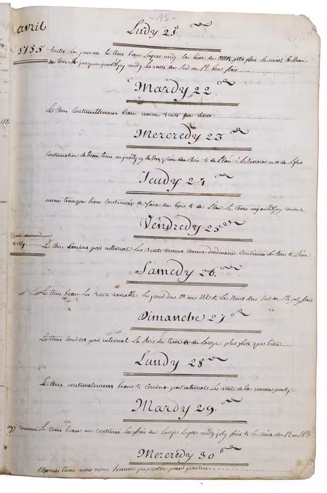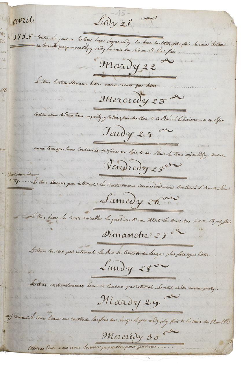 This wonderful logbook details the journey of a French captain from Manila to the Maluku Islands in todays Indonesia. The journey took place during the months of March to May of 1755. The captain of the ship recounted with great detail the events of every day of the journey, with detailed daily accounts of the weather, winds, manoeuvres of the ship, its departures, anchorages, and precise coordinates at every point of the journey. The captain furthermore had a keen eye for the geographical and nautical details along the journey. He recounted the exact locations of for example sandbanks and bays, where ships and their crews can take provisions and fresh water. The accounts are detailed and captivating: "After our boats were back on board, we set sail [...] in the afternoon to moor under the old Portuguese fort on the Solor island [Indonesia], the winds for the tide were fresh at 1:34 a.m. [...] sand and gravel, and then I went back to mooring. The pavilion of the fort [...] the village is under the said fort at 3 cables from us [...]". The captain goes on to describe the geographical features of the islands as well as other places en route with great detail. Curiously, we find inscriptions in Spanish and the names of one don Phelipe Qui, who describes himself as "el piloto" and one Padre Don Estevan de Melo. The latter might be identical with Don Estevan Roxas y Melo, a native of Lima, Peru and secretary to the Archbishop of Manila, Rodriguez, since 1736. Roxas y Melo was part of the 1751 reconstruction of the Cathedral of Manila, working under the auspice of the Italian architect Juan de Uguccioni.