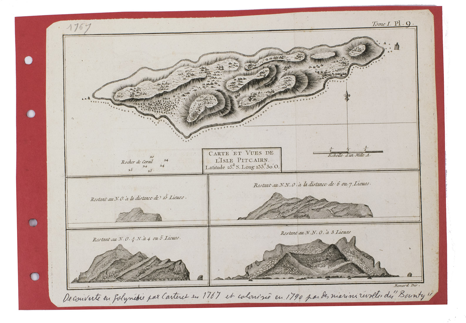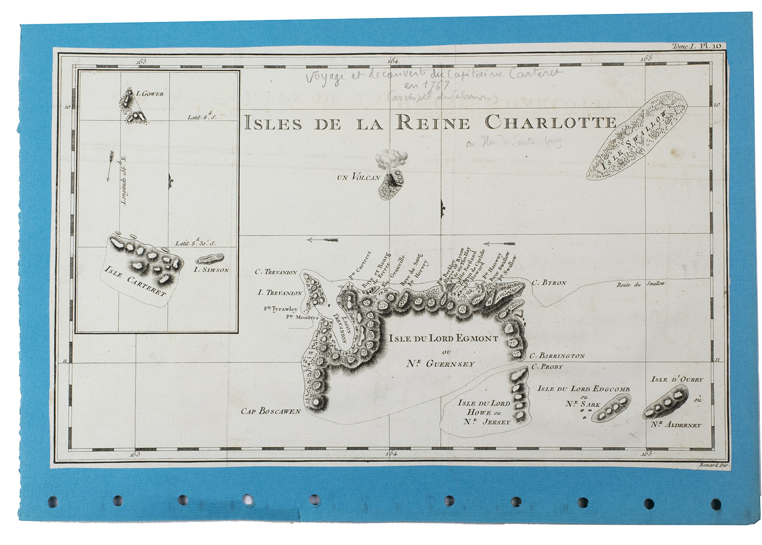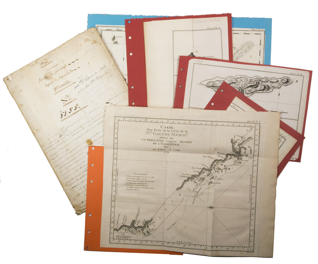 The logbook comes with six printed maps, partly illustrating the journey of the captain, pasted on contemporary cardboard. They depict the Bay of Sulavesi with the city of Bantang, Pitcairn, the coast of New Guinea, the coast of Queensland, the Santa Cruz Islands in the present-day Solomon Islands and Alejandro Selkirk Island. The plates stem from the French translation of James Hawkesworths An Account of the Voyages (Hawkesworth, Relation des voyages entrepris par ordre de sa Majesté Britannique, actuellement regnante; pour faire des découvertes dans l'hemisphère meridional, Paris 1774).