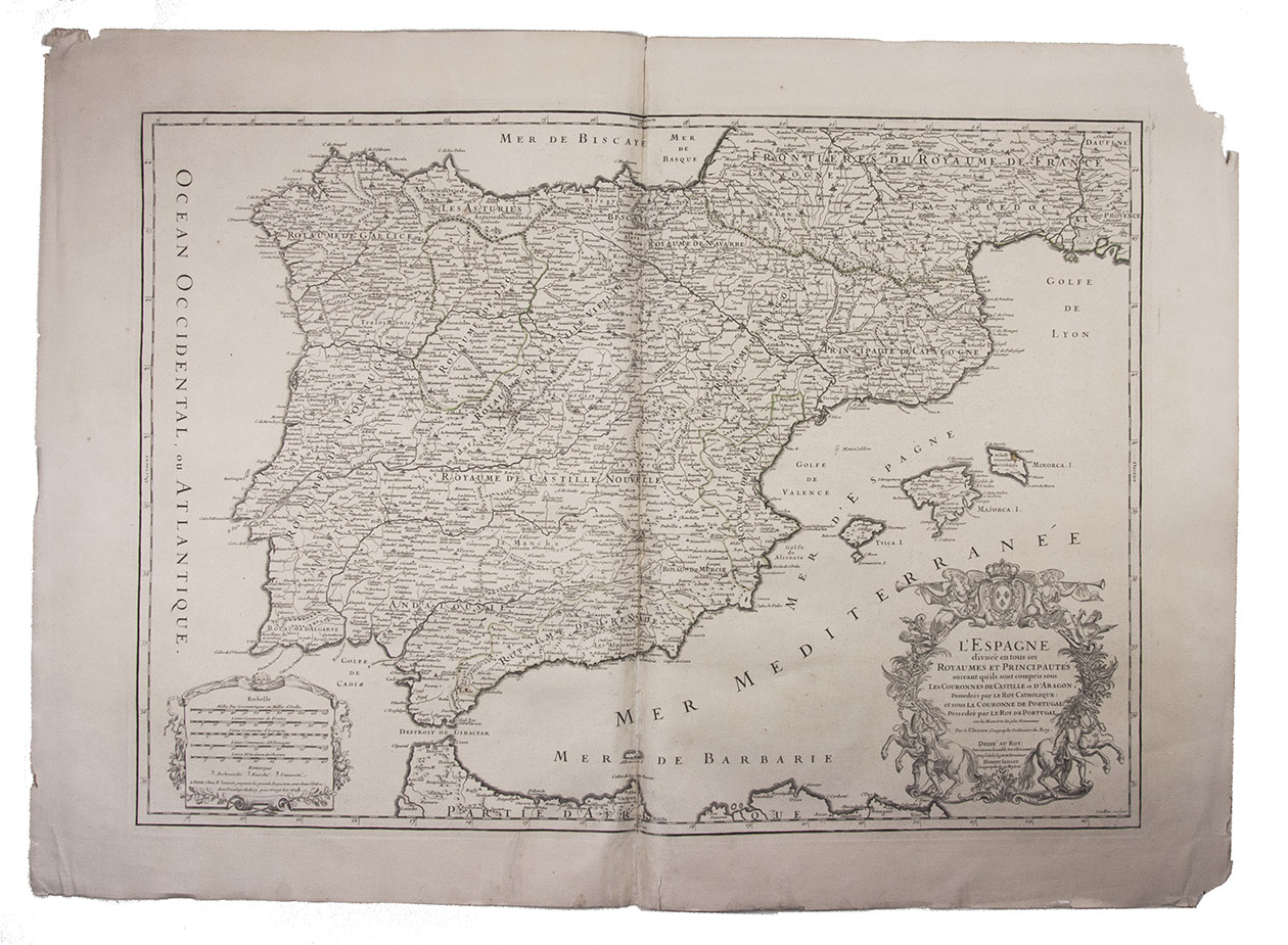 l'Espagne divisée en tous ses royaumes et principautés suivant qu'ils sont compris sous les Couronnes de Castille et d'Aragon, possedees par le Roy Catholique et sous la couronne de Portugal possedee par le Roy de Portugal.