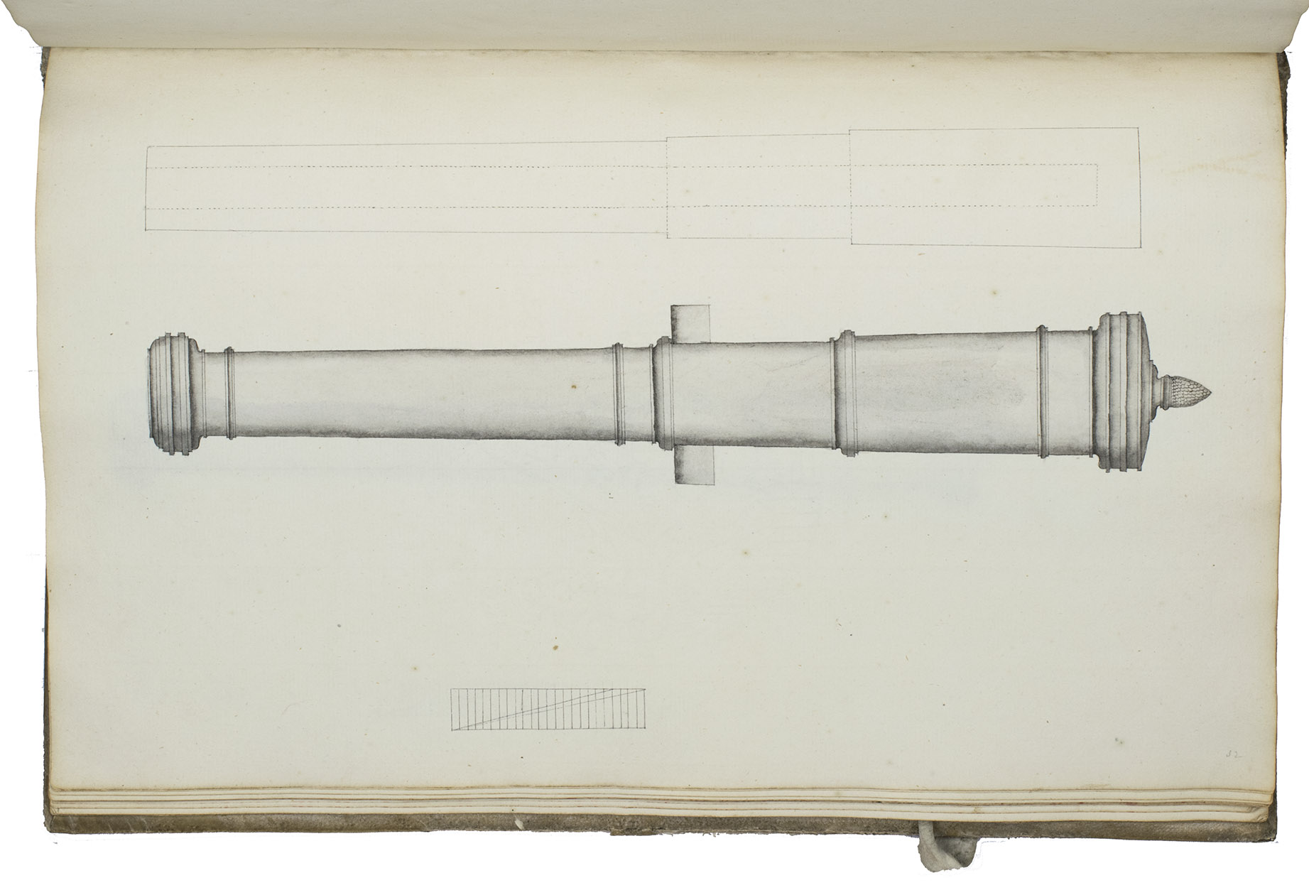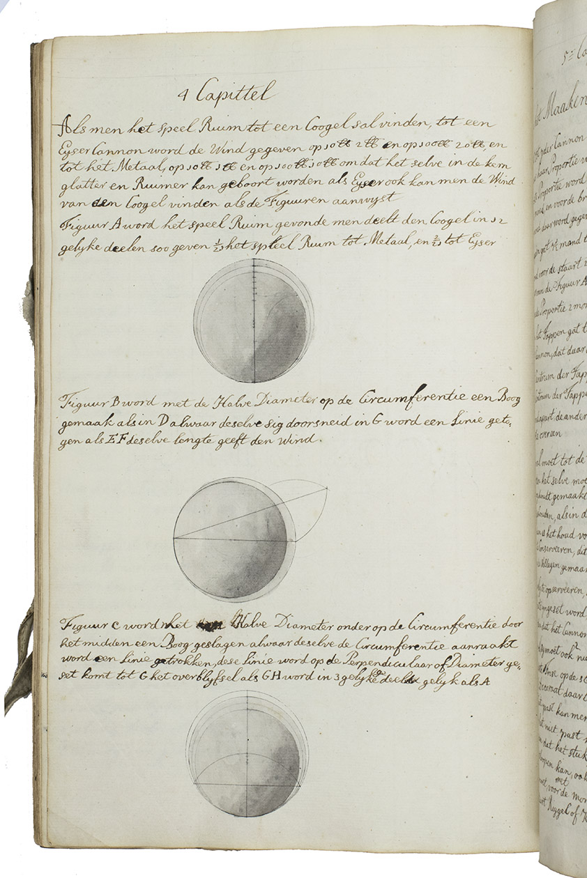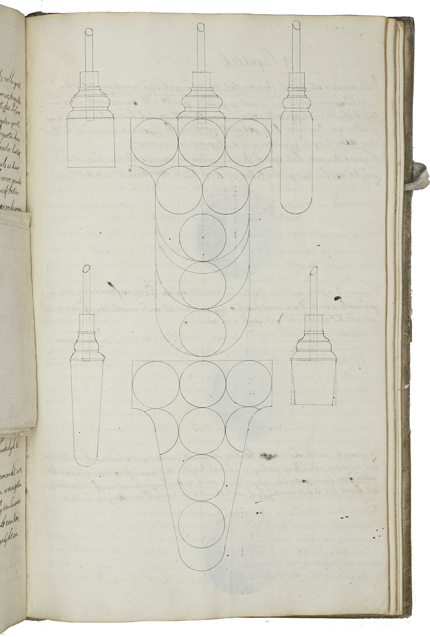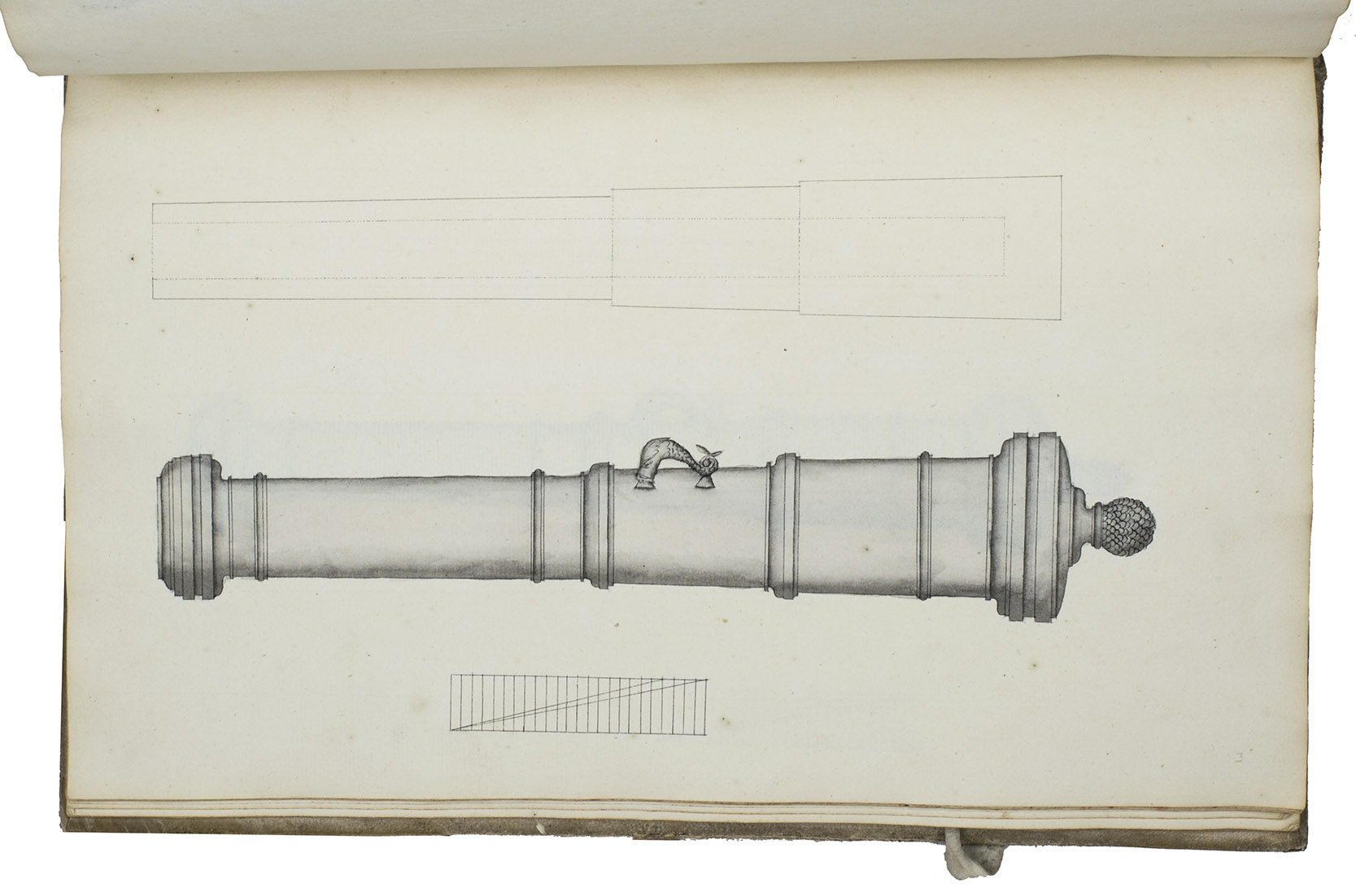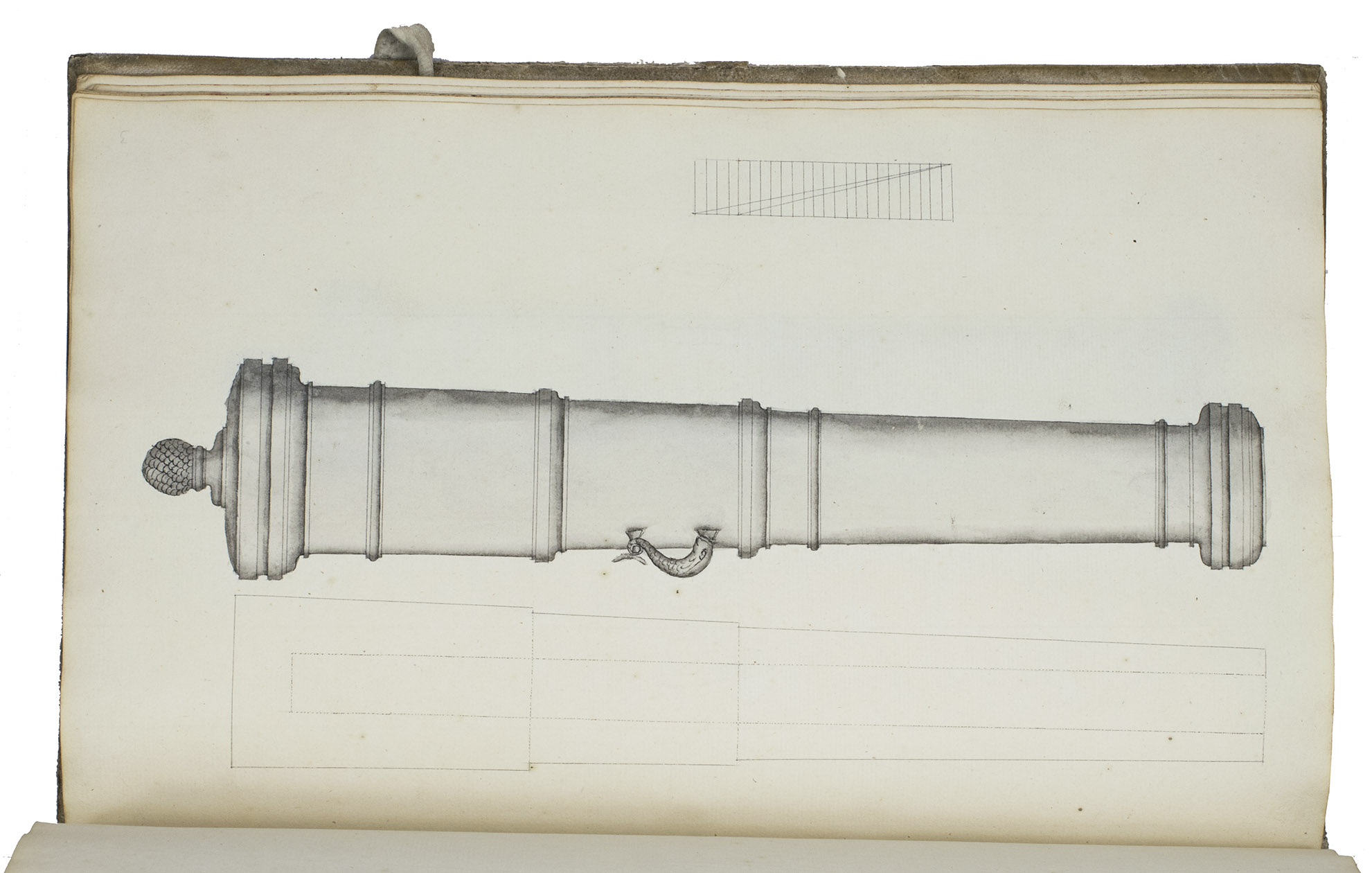 [Netherlands, ca. 1750]. 3 related works in 1 volume. Folio. With numerous mathematical diagrams, fortification plans and measured drawings of artillery and ammunition, including 12 full-page watercolour drawings (3 fortification plans and 9 beautifully rendered canons) and many more watercolour drawings in the text. With a large folding fortification plan tipped in, a large folding artillery drawing loosely inserted, and several smaller drawings tipped in or loosely inserted. Contemporary sheepskin parchment. [2 blank], [40], [12 blank]; [37 (plus a folding plan & other inserts)], [5 blank]; [22] (plus a folding drawing), [16 blank] ll. including the integral paste-downs.