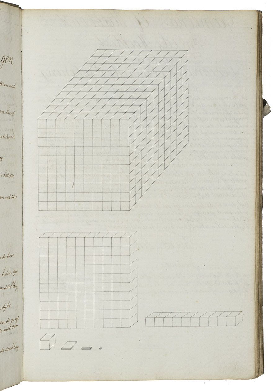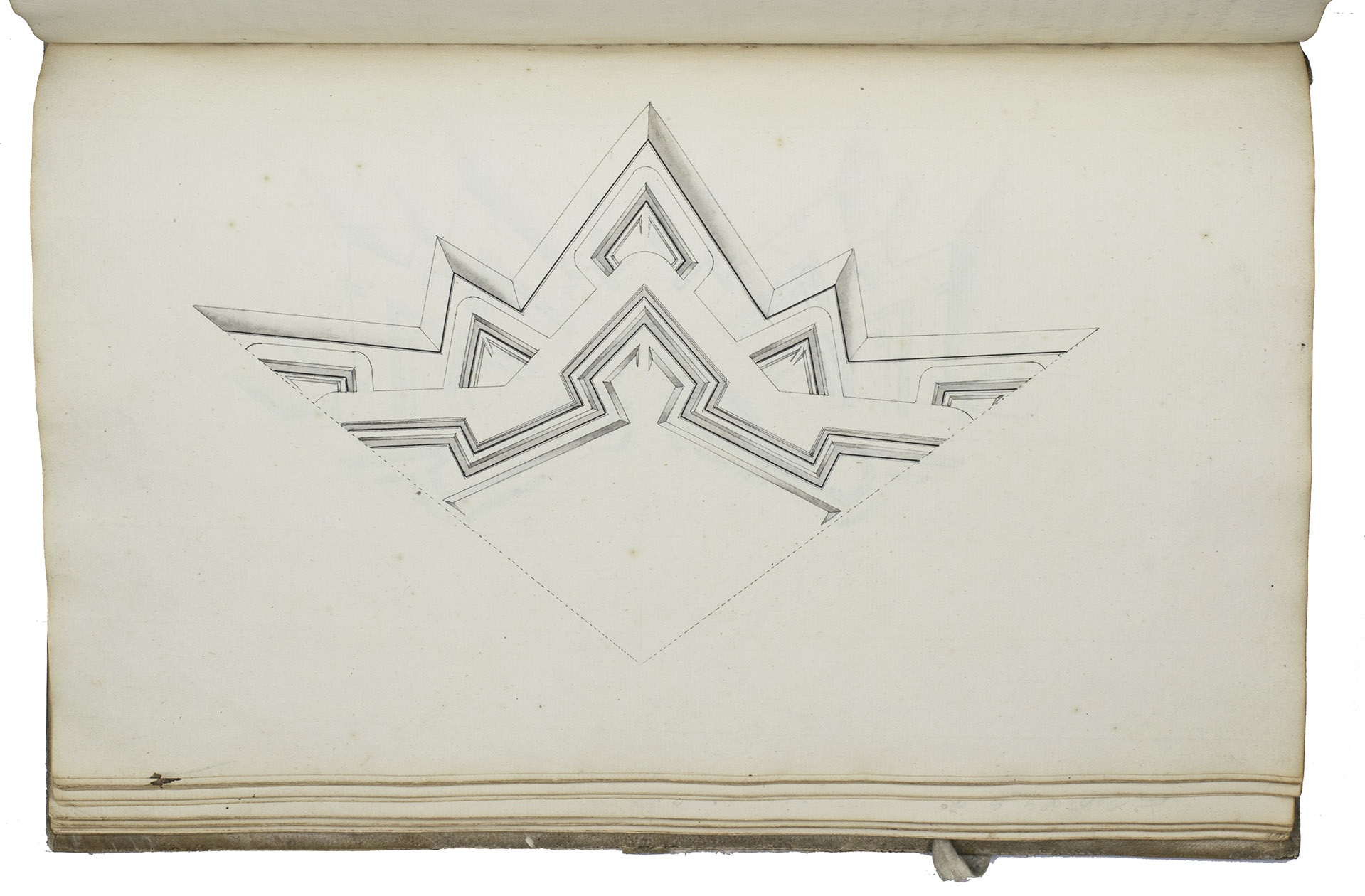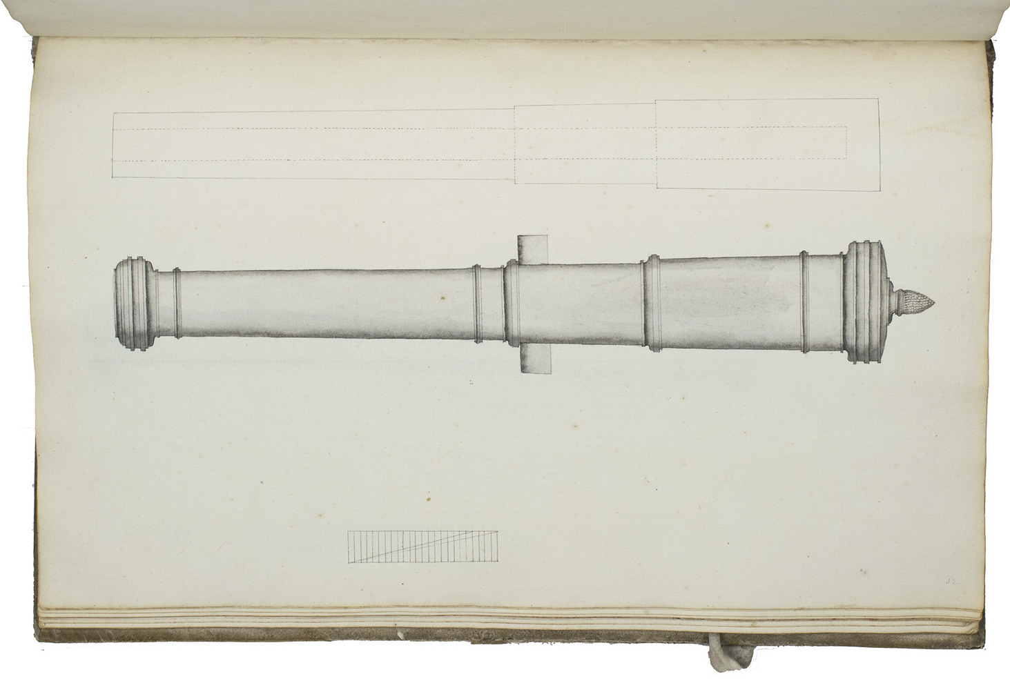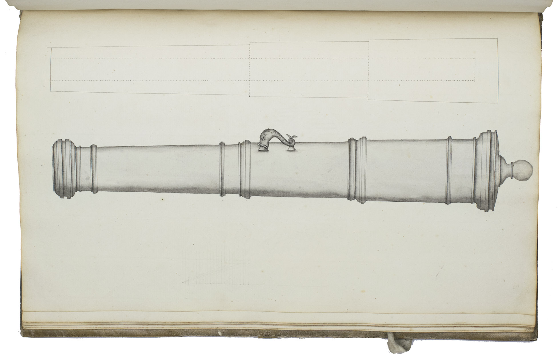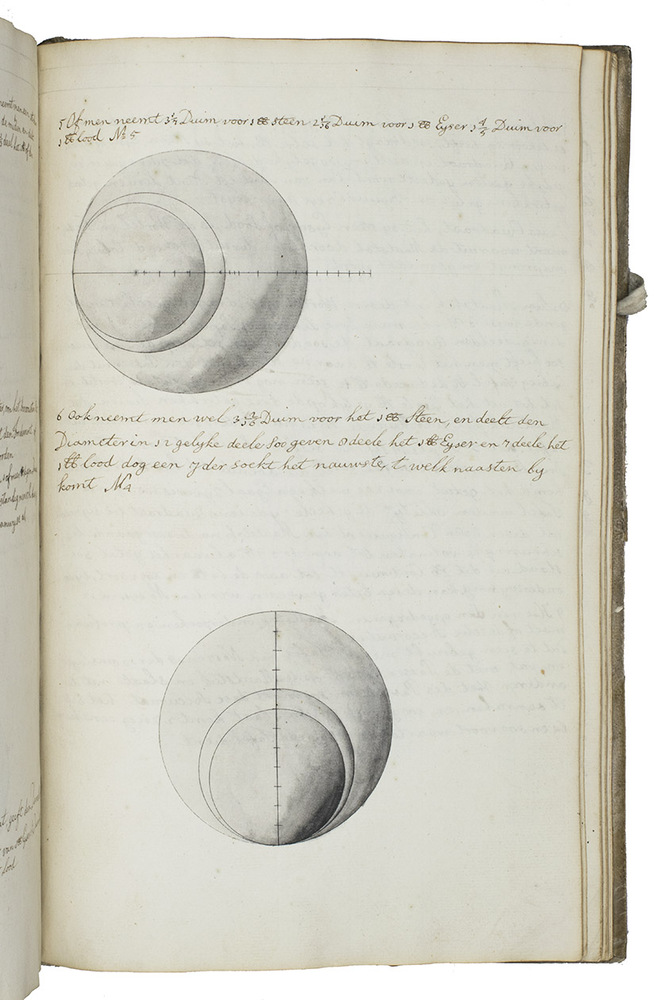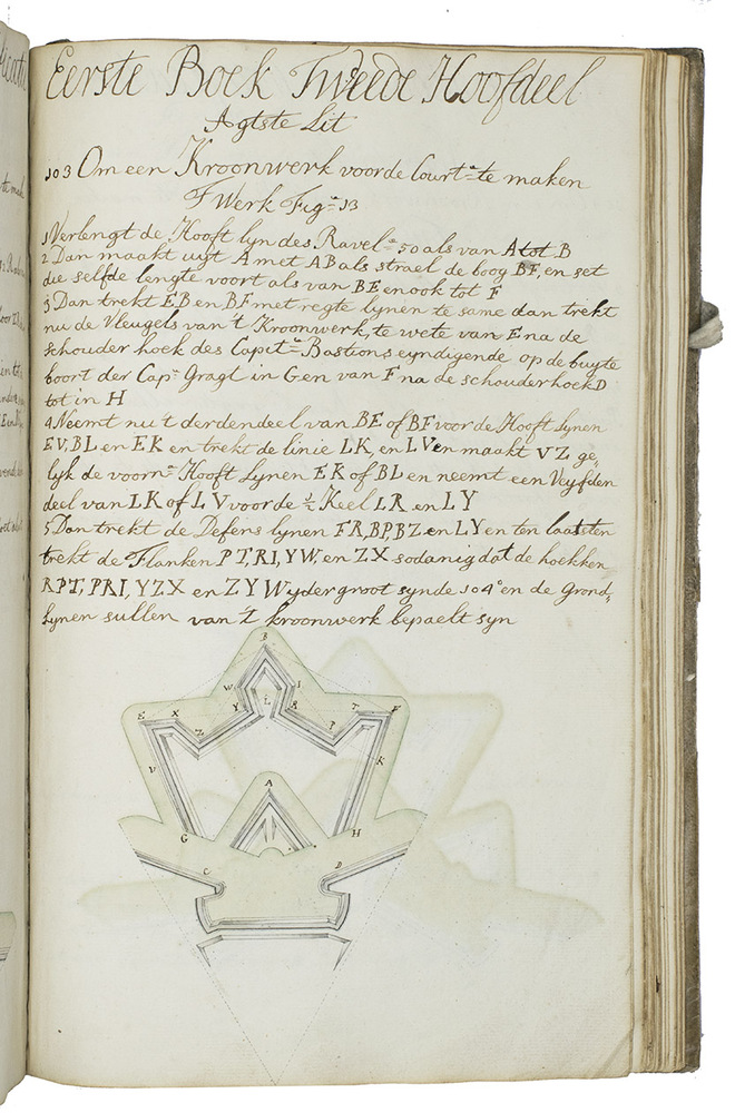 [Netherlands, ca. 1750]. 3 related works in 1 volume. Folio. With numerous mathematical diagrams, fortification plans and measured drawings of artillery and ammunition, including 12 full-page watercolour drawings (3 fortification plans and 9 beautifully rendered canons) and many more watercolour drawings in the text. With a large folding fortification plan tipped in, a large folding artillery drawing loosely inserted, and several smaller drawings tipped in or loosely inserted. Contemporary sheepskin parchment. [2 blank], [40], [12 blank]; [37 (plus a folding plan & other inserts)], [5 blank]; [22] (plus a folding drawing), [16 blank] ll. including the integral paste-downs.