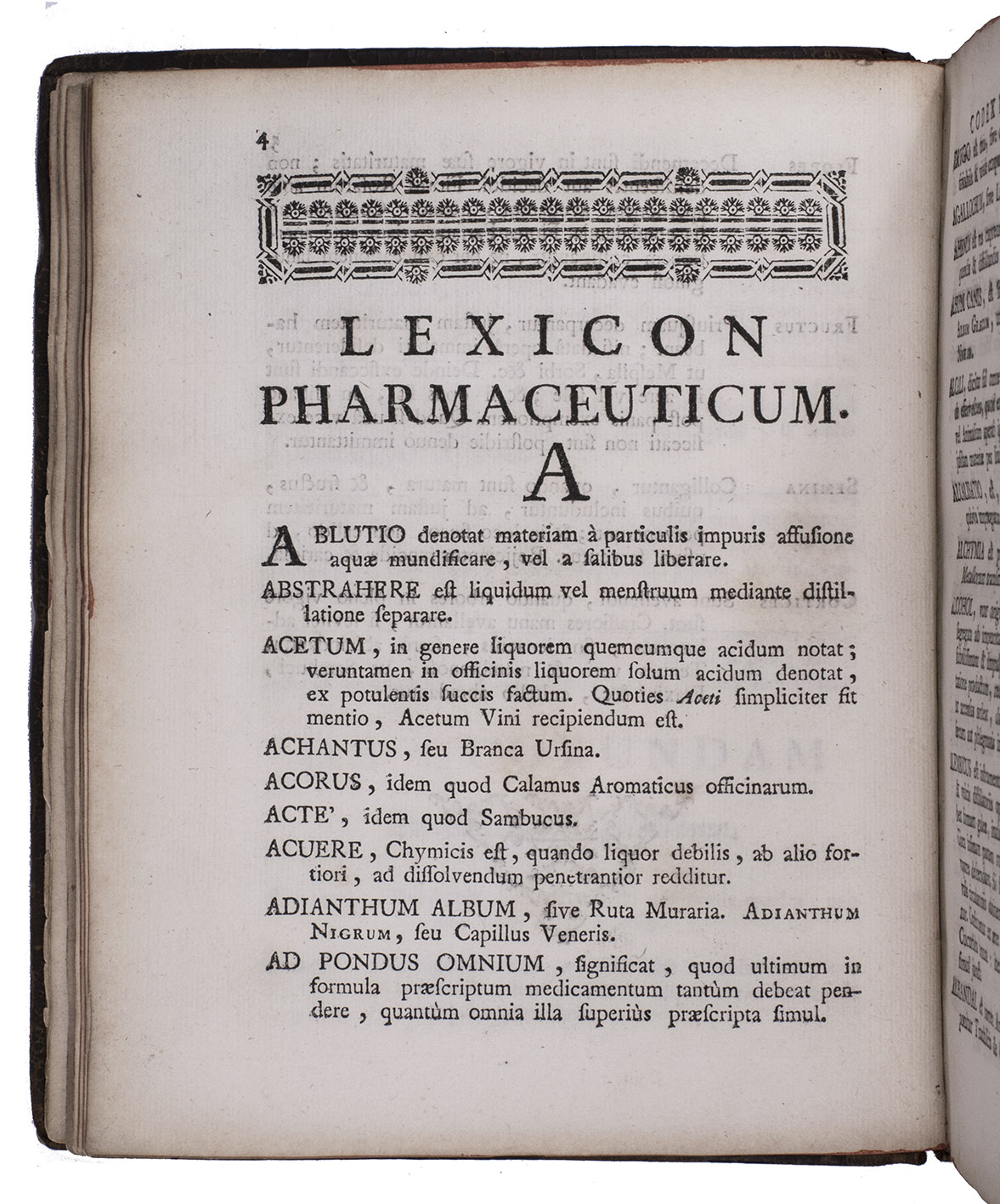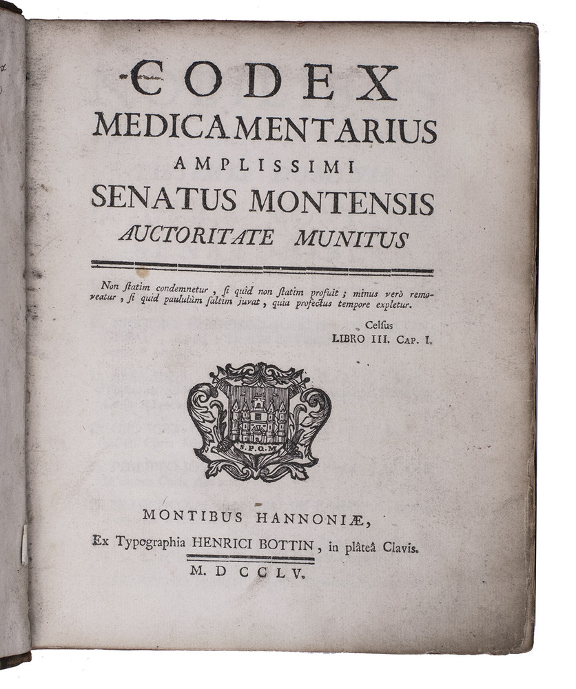 Rare first and only edition of the Mons pharmacopoeia. Although the Vienna pharmacopoeia had been officially designated as the standard for the Austrian Netherlands, the city of Mons published its own pharmacopoeia in 1755, making it the last city in the Low Countries to create a new pharmacopoeia.