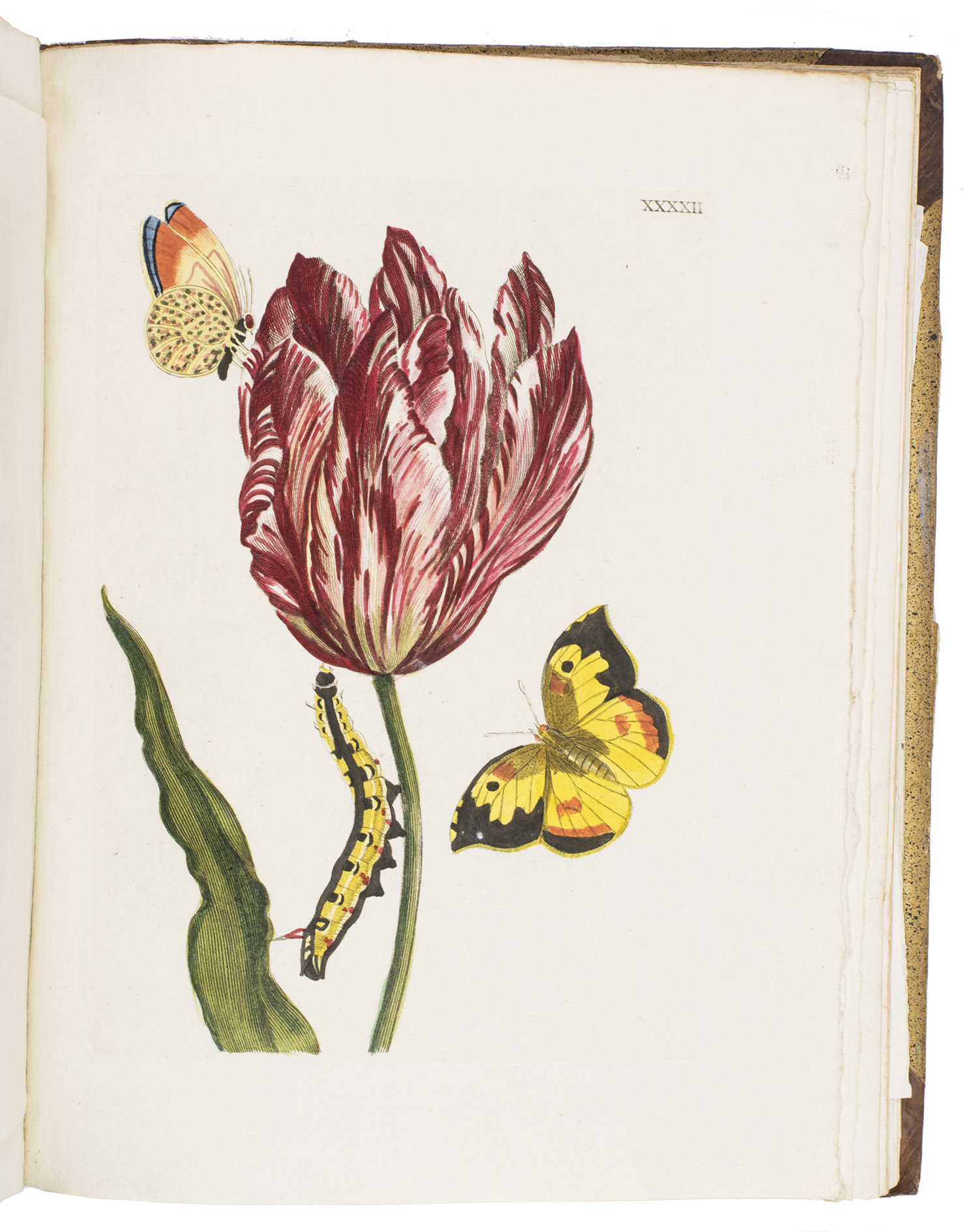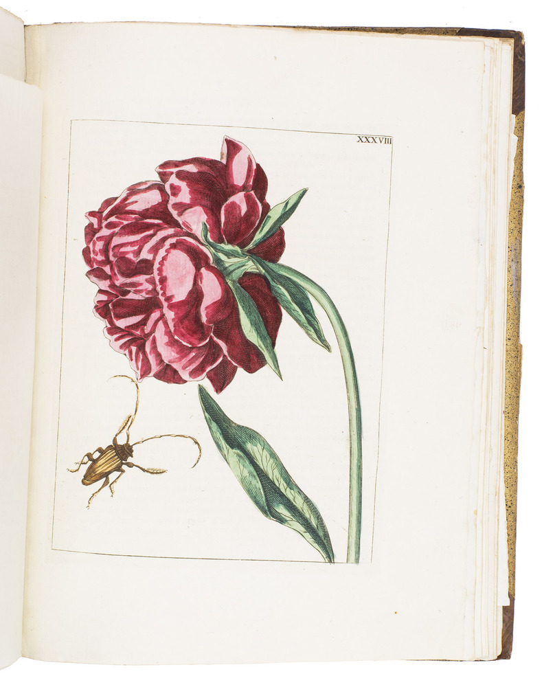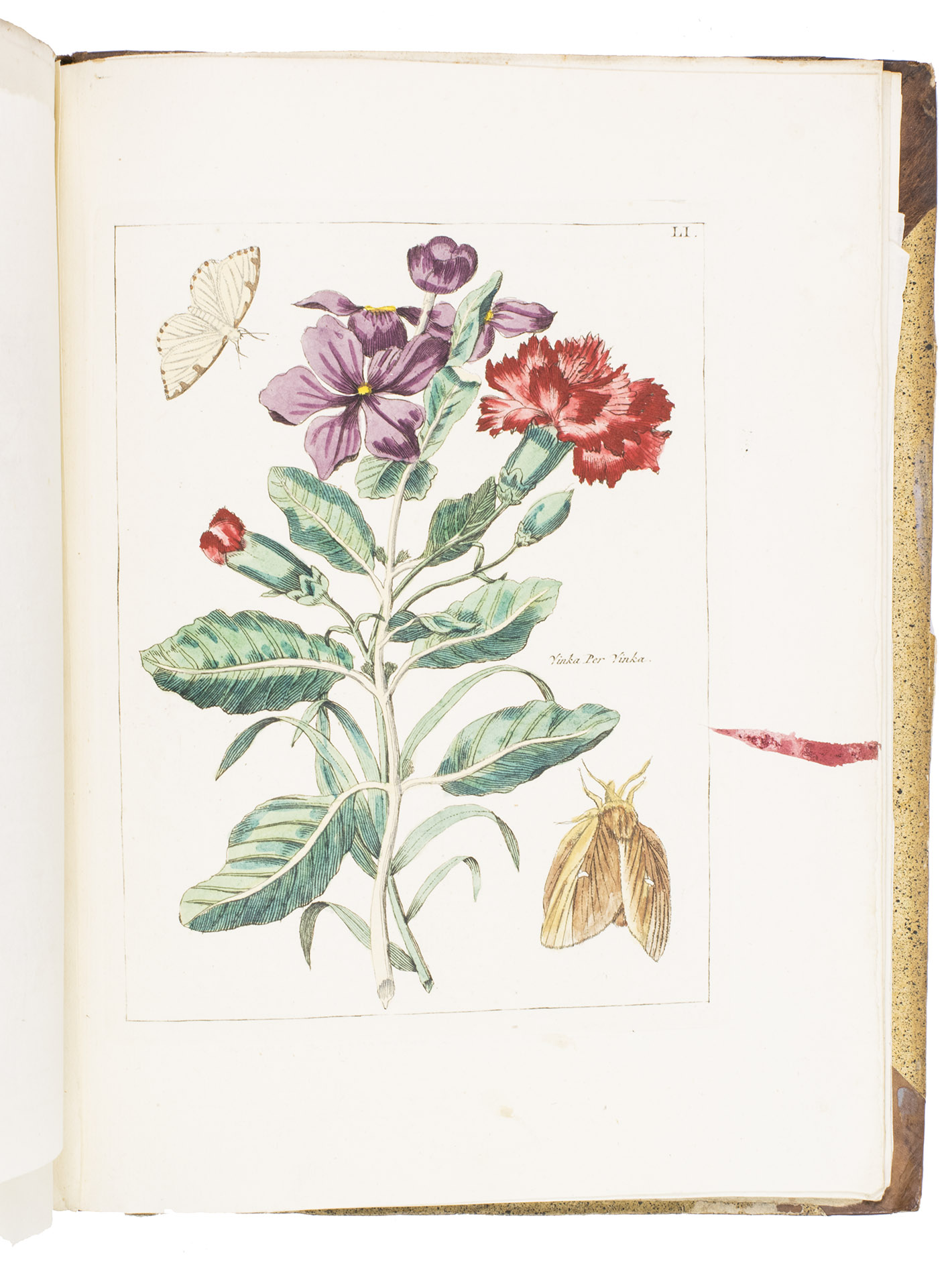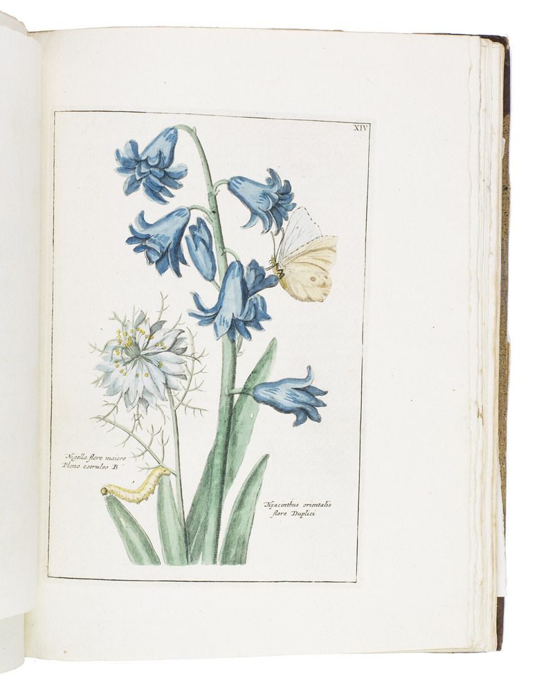 The work was originally published in nine instalments, which were issued to subscribers. The present copy is complete. It's author or authors are unknown; the title-page only mentions a "company of scholars". However, the engraving on the title-page is signed, namely by flower painter Paul Theodor van Brussel (1754-1795) and engraver Hendrik Leffert Myling (1757-1821). The delightful plates, nearly all with butterflies, caterpillars, beetles or insects are partly copies of the plates from Variae ac multiformes florum species (1665) by flower painter Nicolas Robert. The present work is not a Dutch edition of Robert's work, however, as the latter has no text.