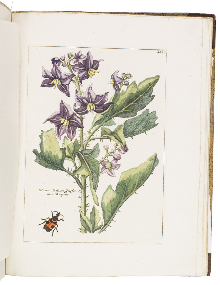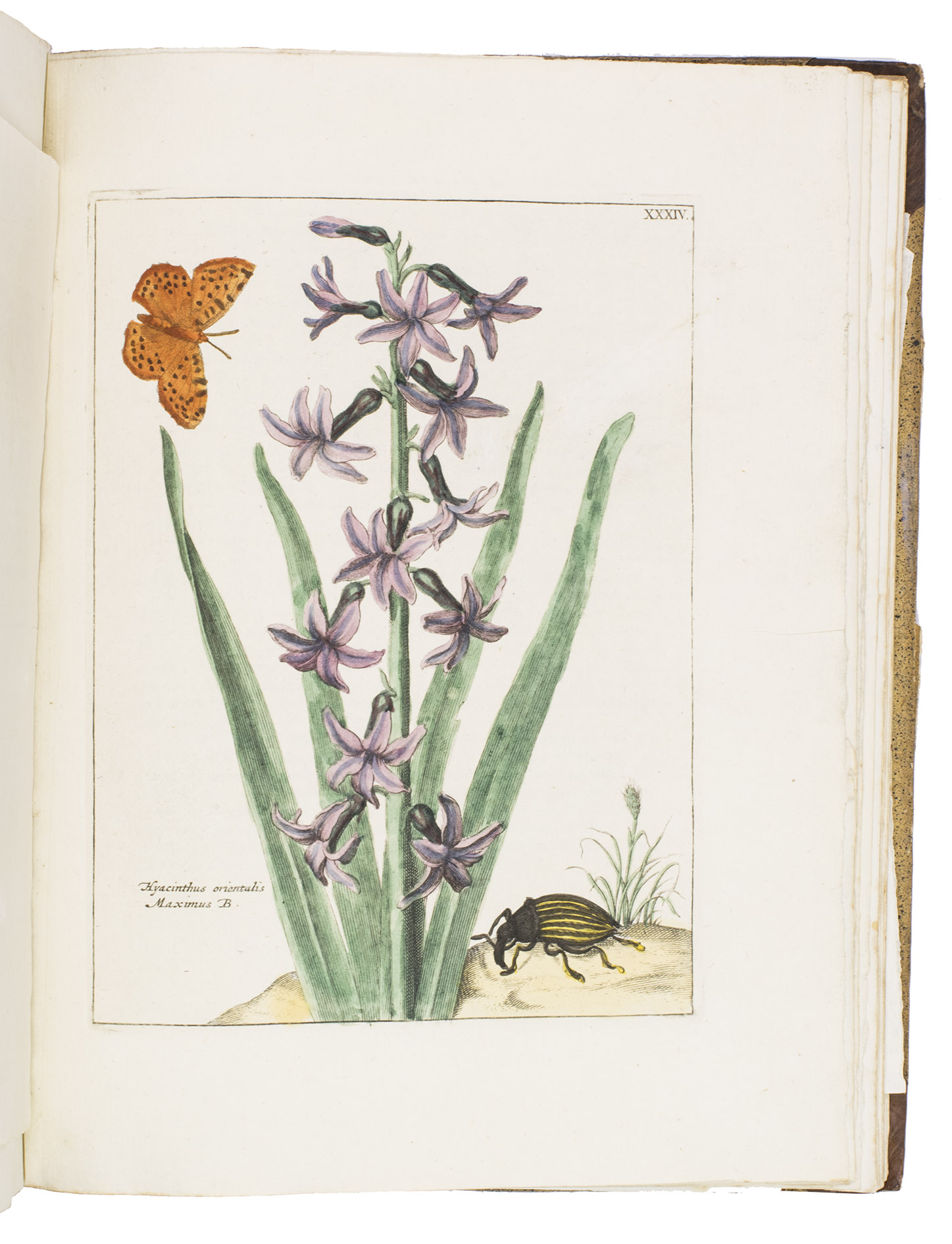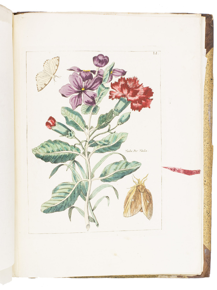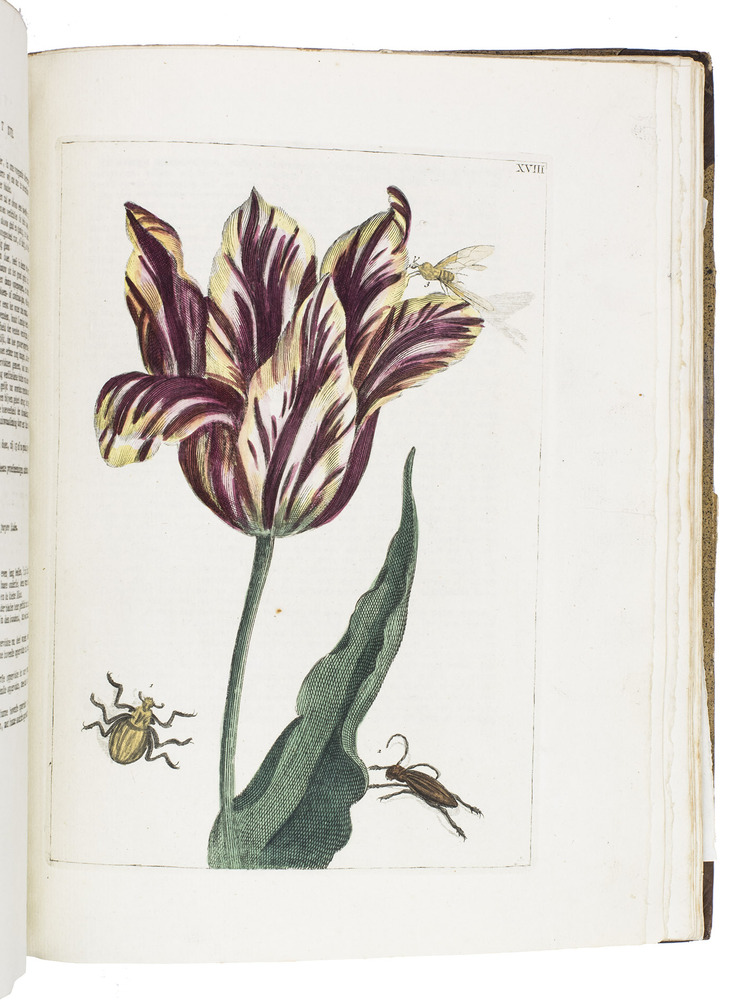 The work was originally published in nine instalments, which were issued to subscribers. The present copy is complete. It's author or authors are unknown; the title-page only mentions a "company of scholars". However, the engraving on the title-page is signed, namely by flower painter Paul Theodor van Brussel (1754-1795) and engraver Hendrik Leffert Myling (1757-1821). The delightful plates, nearly all with butterflies, caterpillars, beetles or insects are partly copies of the plates from Variae ac multiformes florum species (1665) by flower painter Nicolas Robert. The present work is not a Dutch edition of Robert's work, however, as the latter has no text.