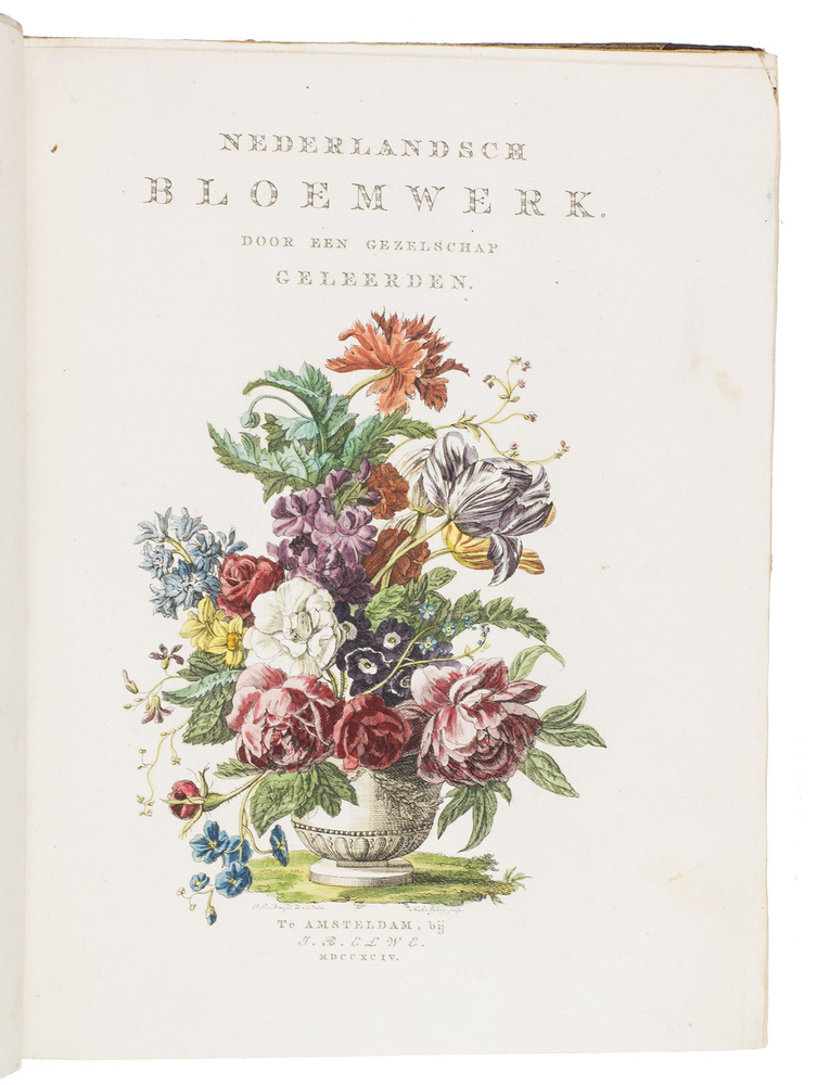 Amsterdam, J.B. Elwe, 1794. 4to. With 54 contemporary hand-coloured engraved plates of flowers, including an engraved title page signed by Paul Theodor van Brussel and Hendrik Leffert Myling. (Near-) contemporary gold-tooled half calf. [2 blank], [6], 128, [3], [1 blank] pp.