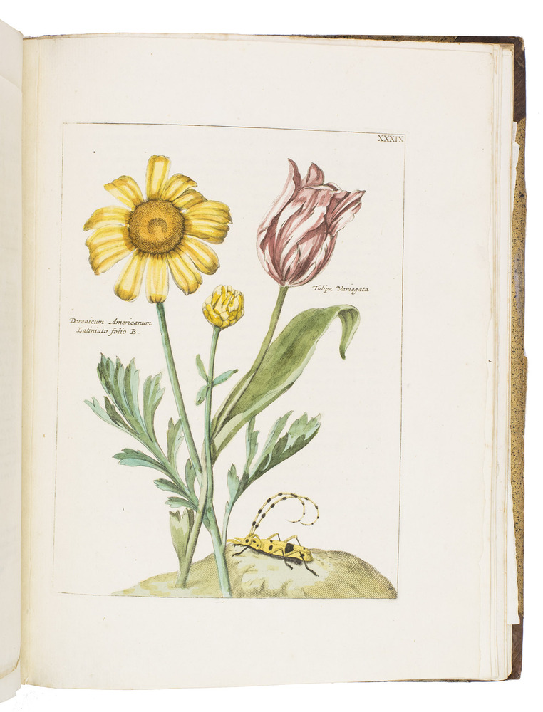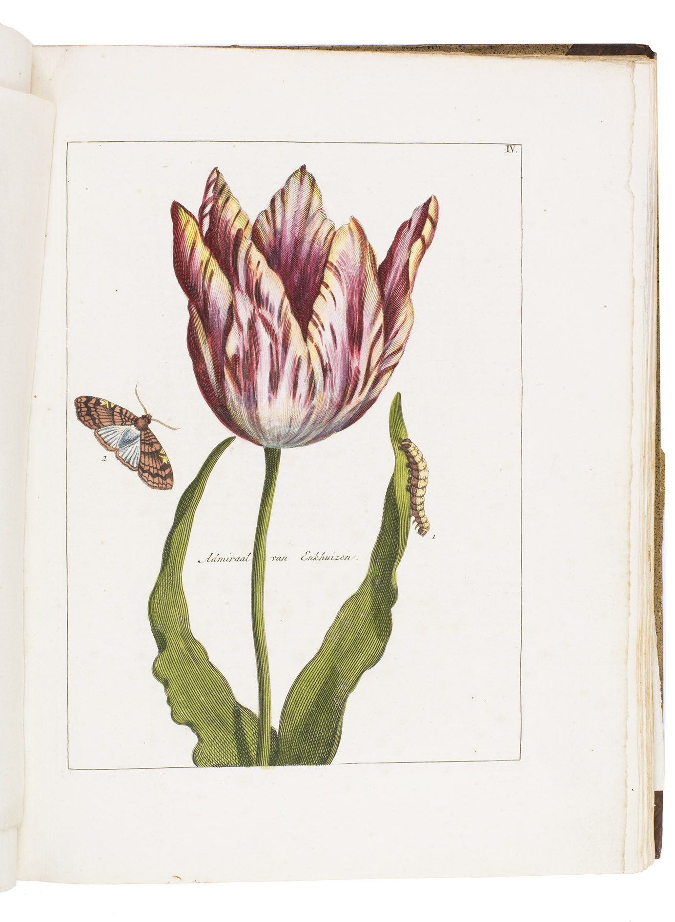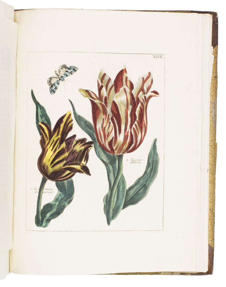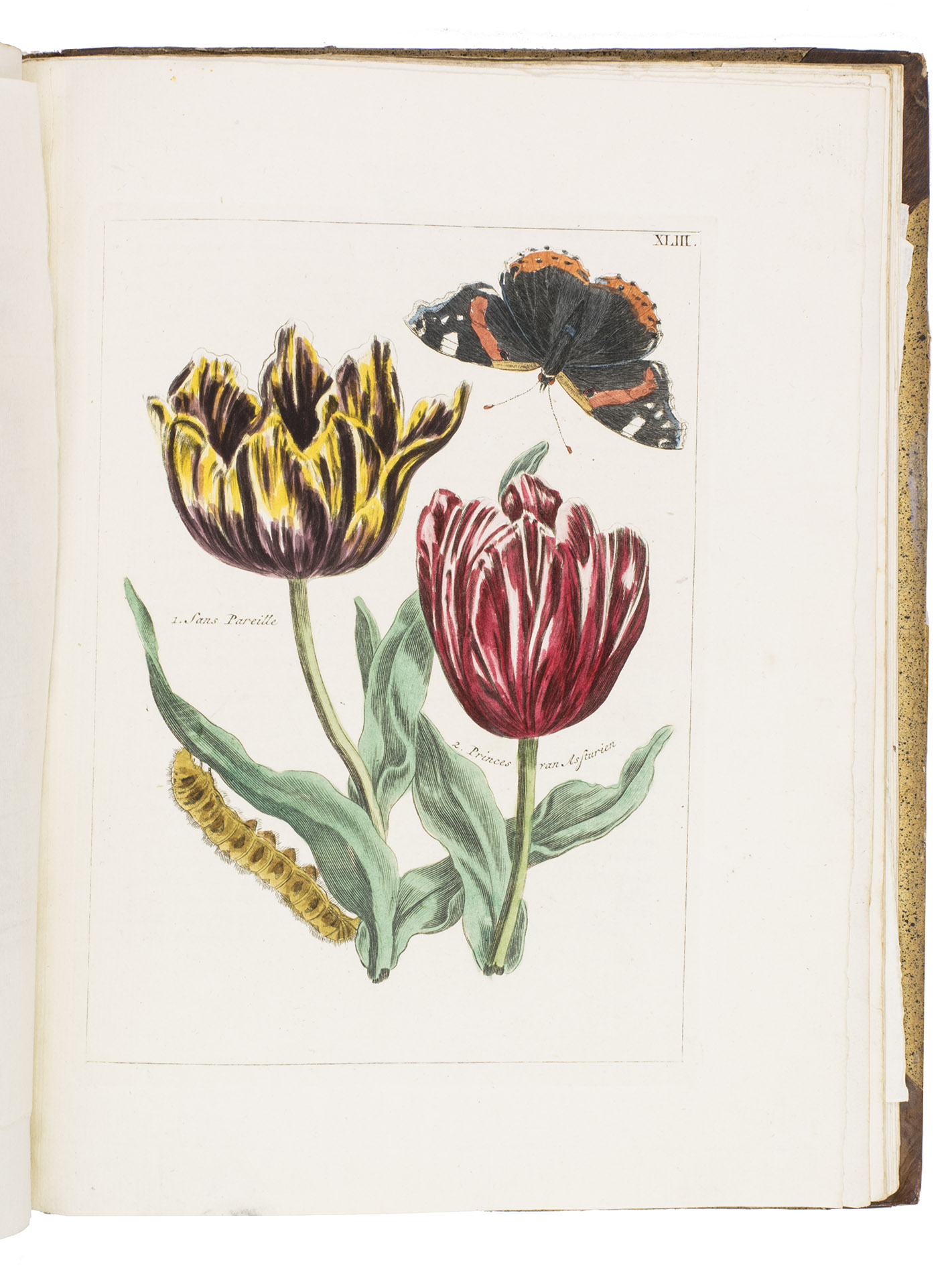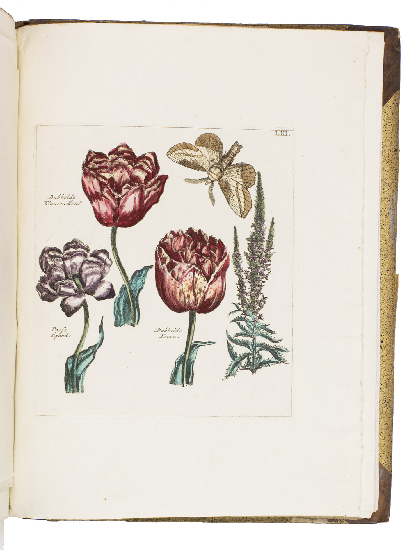 With an official parchment document from 1773 ("Opdragtbrief ten behoeuen van Van Johannes Langelaen, indato den 20e December 1773") and a Dutch fine from 1963 inserted in the front of the work. The edges and corners of the boards are scuffed and the paper on the sides is somewhat rubbed. Plate 48 and 49 are bound in the wrong order. Otherwise in very good condition. Dunthorne 215; Hunt 733; Landwehr, Coloured plates, 29; Lindley, p. 323; Nissen, BBI, 2219; STCN 260360899 (9 copies); Sitwell, GFB, p. 70.