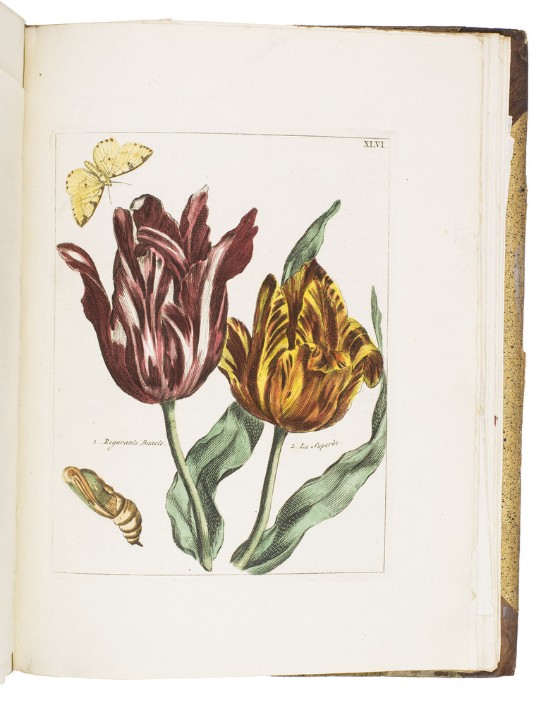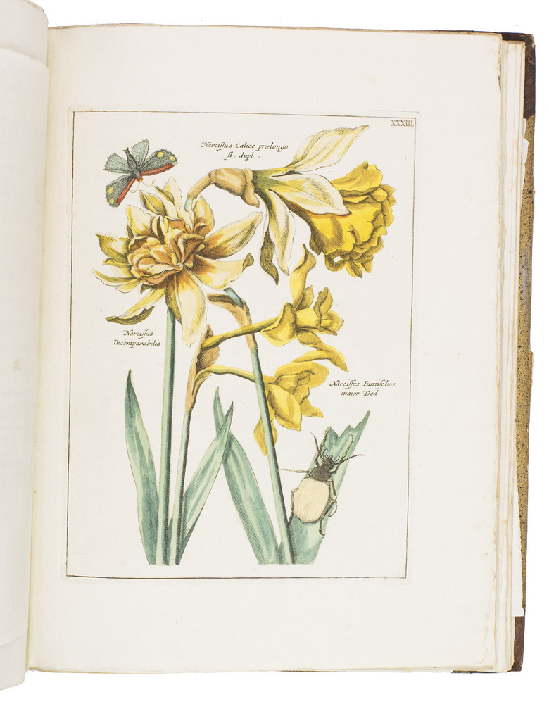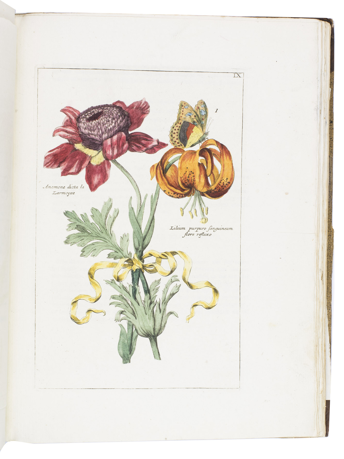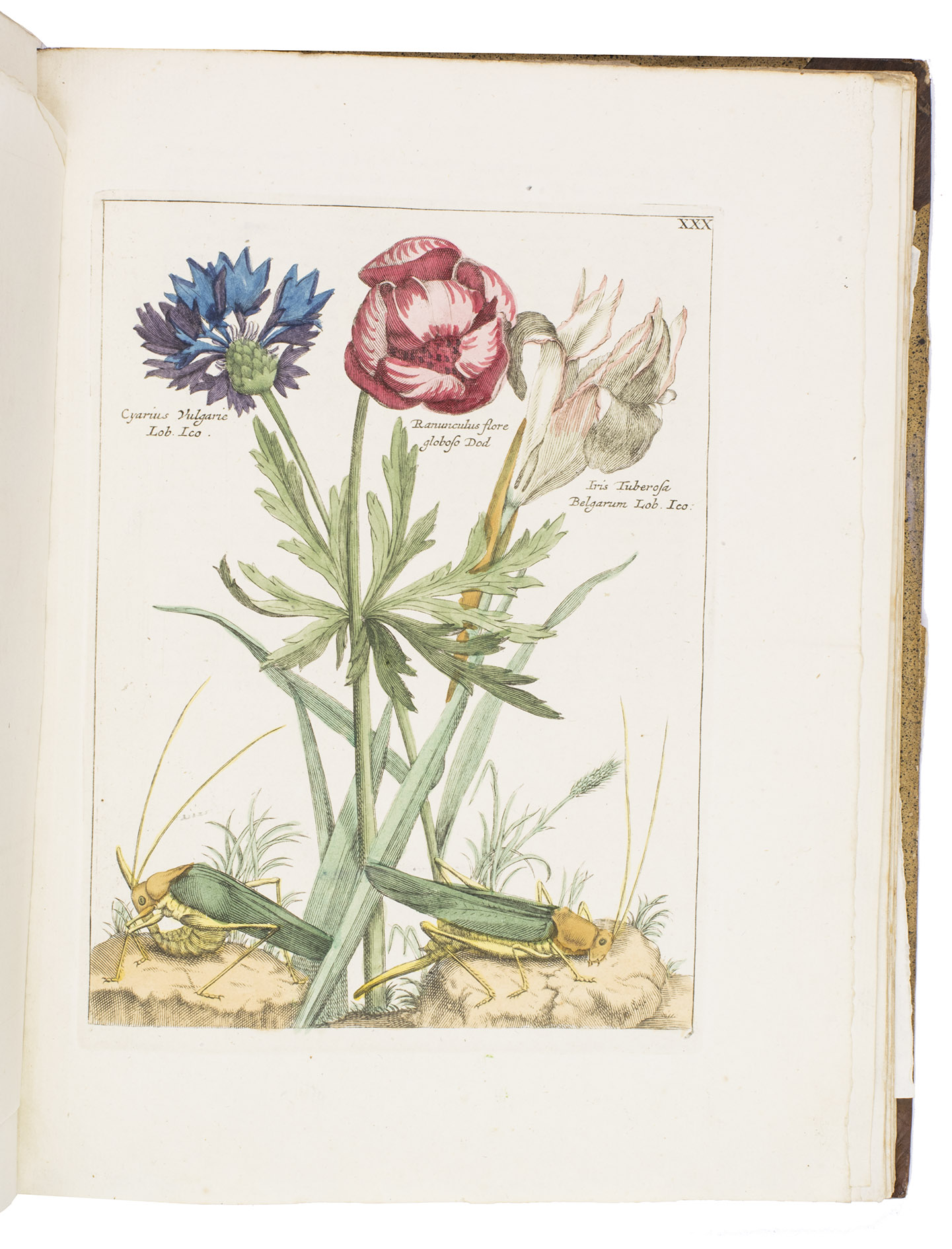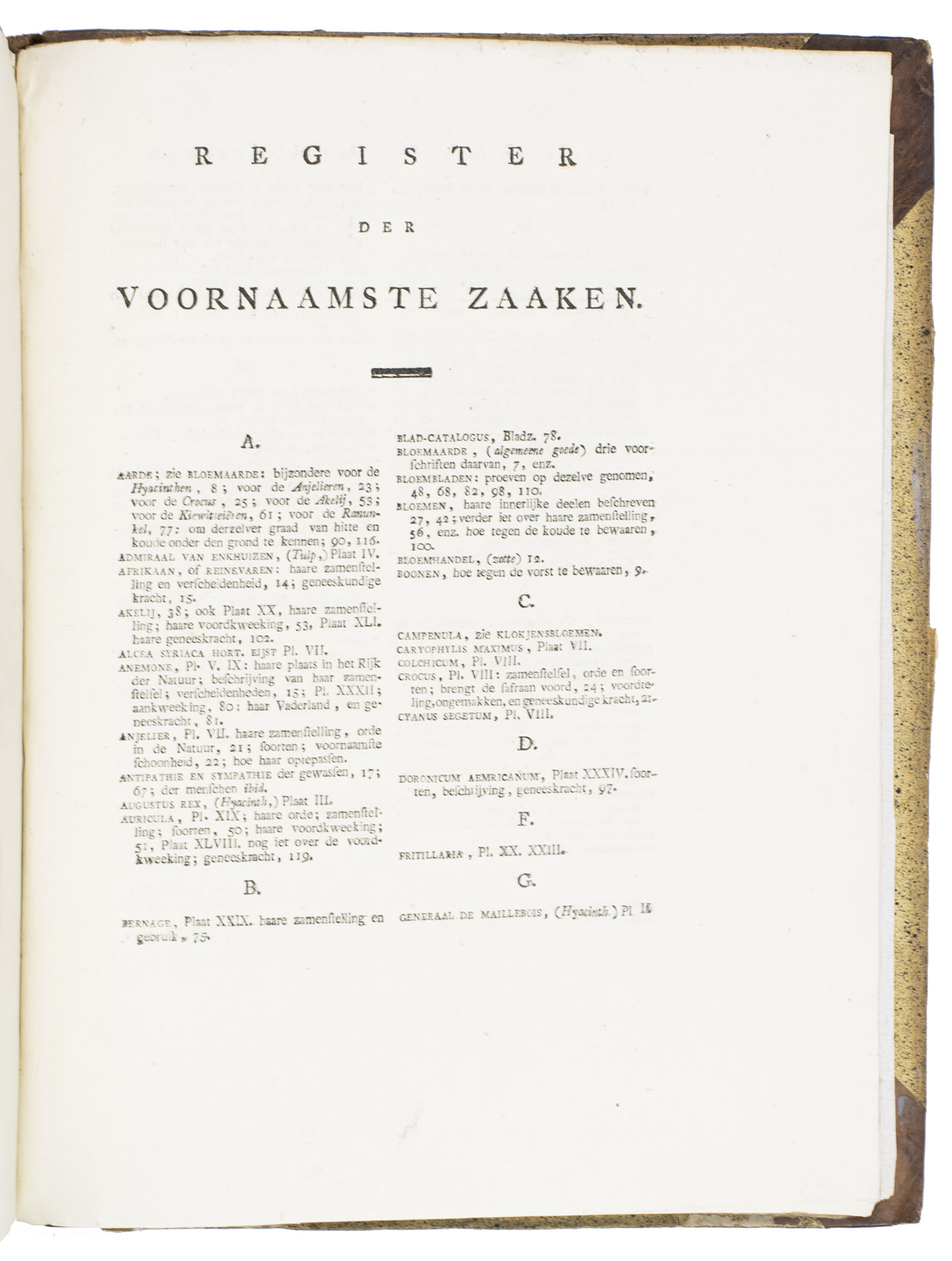 With an official parchment document from 1773 ("Opdragtbrief ten behoeuen van Van Johannes Langelaen, indato den 20e December 1773") and a Dutch fine from 1963 inserted in the front of the work. The edges and corners of the boards are scuffed and the paper on the sides is somewhat rubbed. Plate 48 and 49 are bound in the wrong order. Otherwise in very good condition. Dunthorne 215; Hunt 733; Landwehr, Coloured plates, 29; Lindley, p. 323; Nissen, BBI, 2219; STCN 260360899 (9 copies); Sitwell, GFB, p. 70.