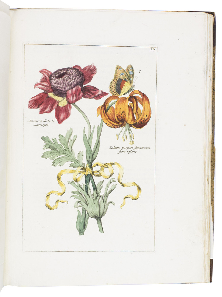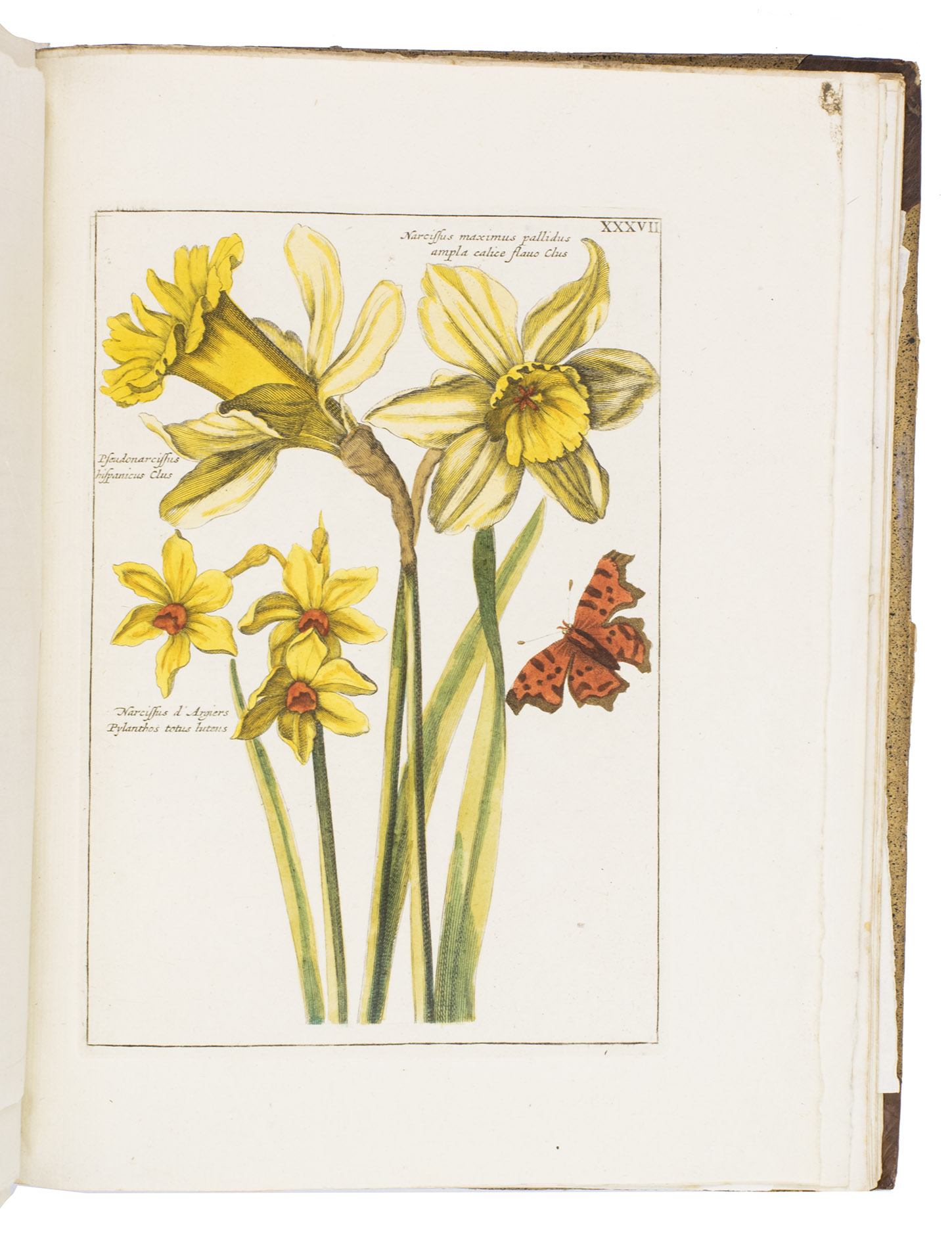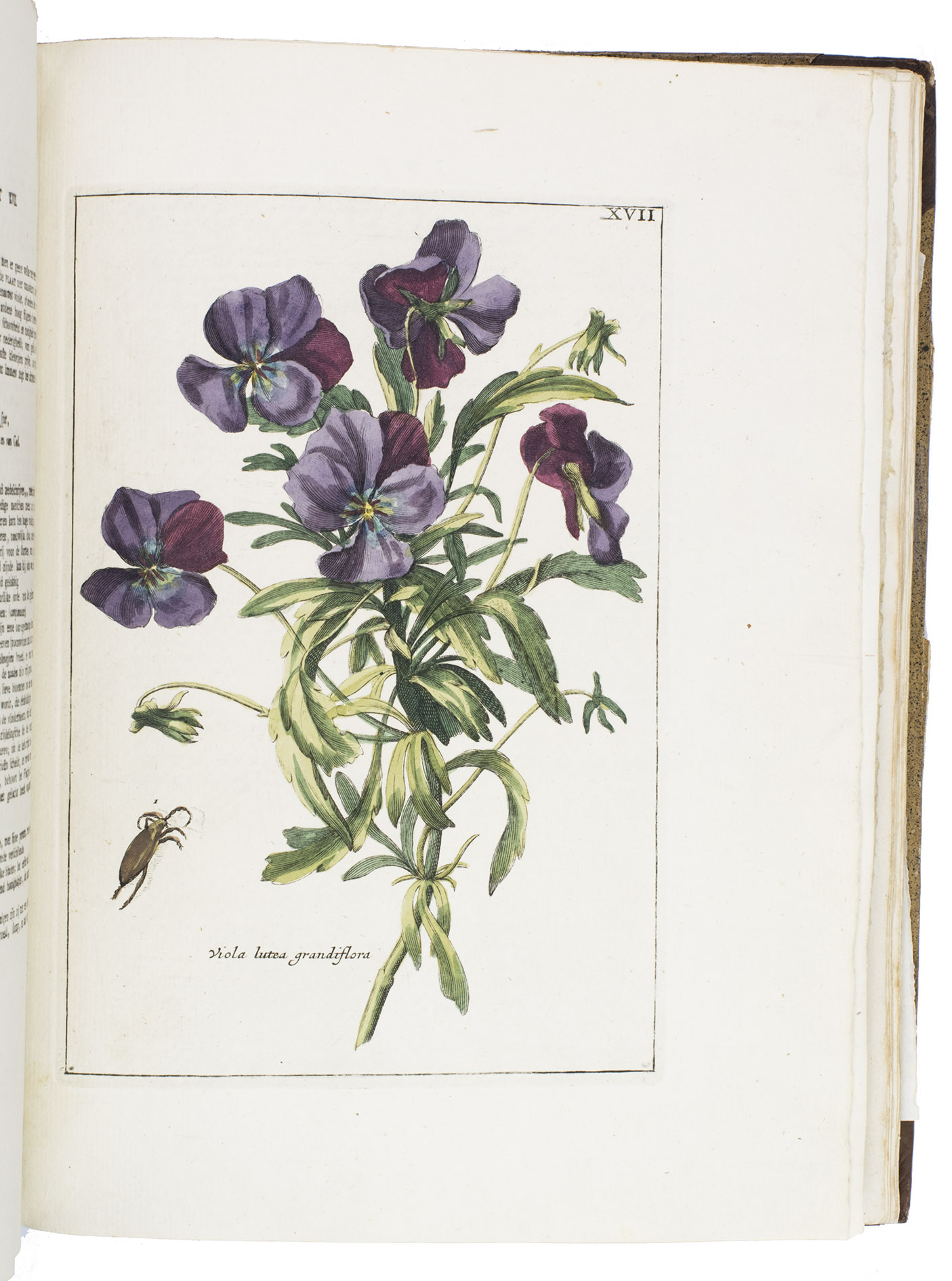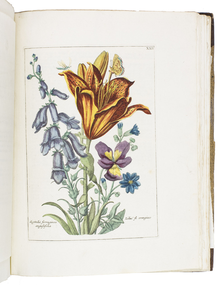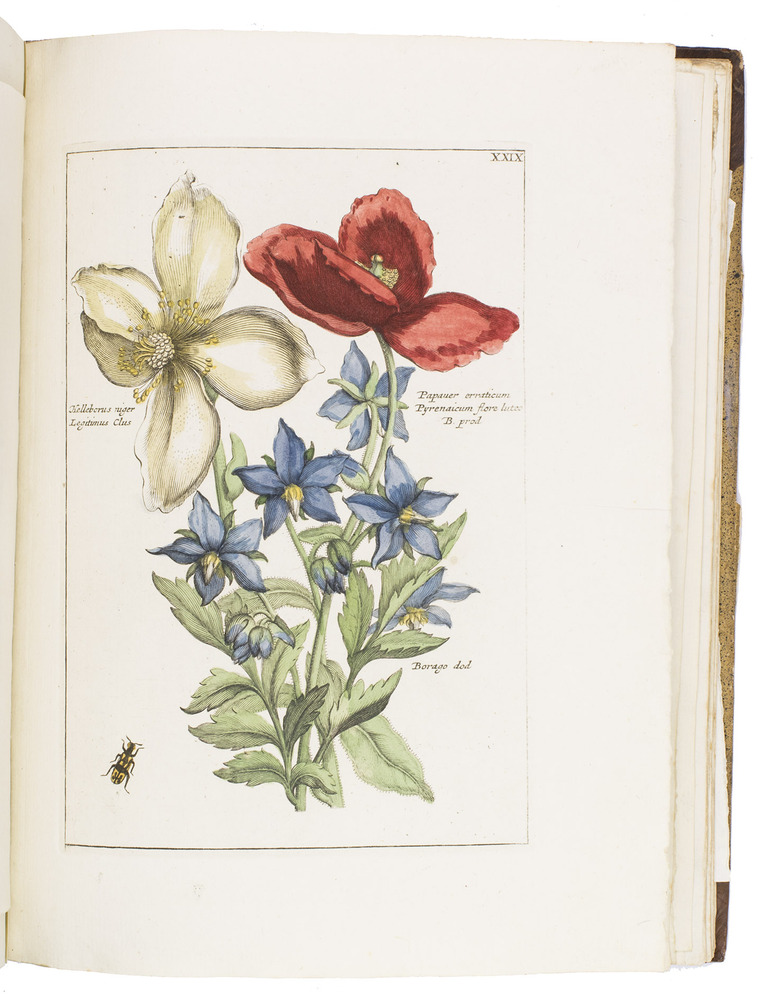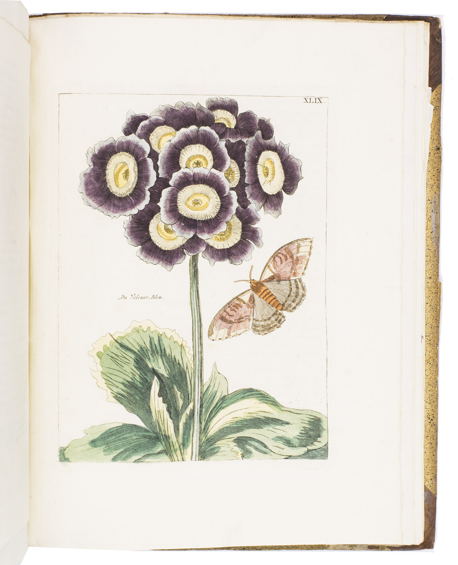 With an official parchment document from 1773 ("Opdragtbrief ten behoeuen van Van Johannes Langelaen, indato den 20e December 1773") and a Dutch fine from 1963 inserted in the front of the work. The edges and corners of the boards are scuffed and the paper on the sides is somewhat rubbed. Plate 48 and 49 are bound in the wrong order. Otherwise in very good condition. Dunthorne 215; Hunt 733; Landwehr, Coloured plates, 29; Lindley, p. 323; Nissen, BBI, 2219; STCN 260360899 (9 copies); Sitwell, GFB, p. 70.