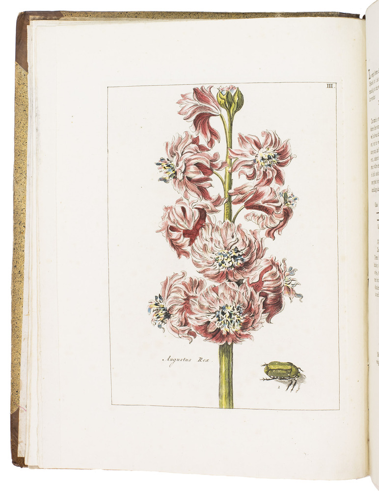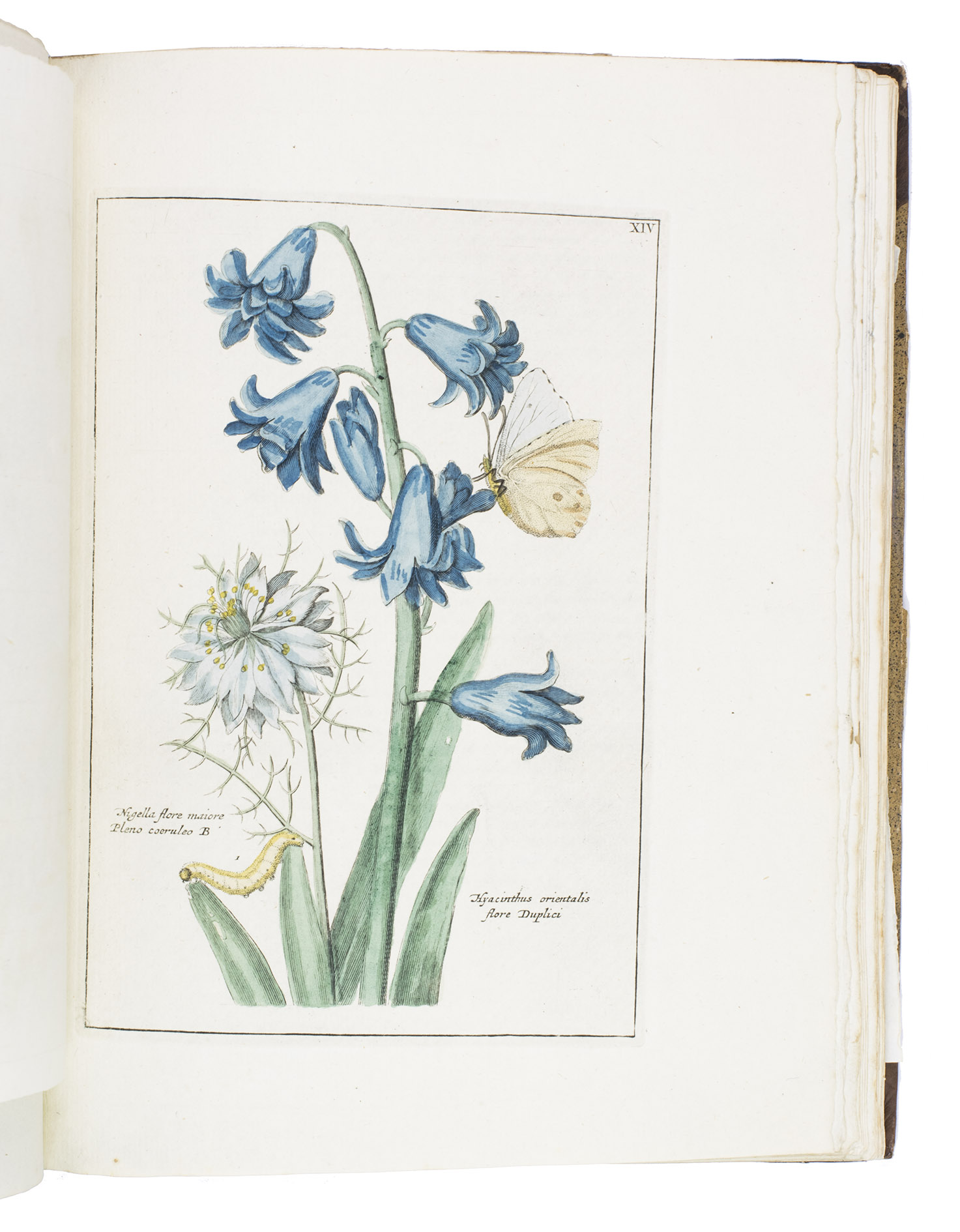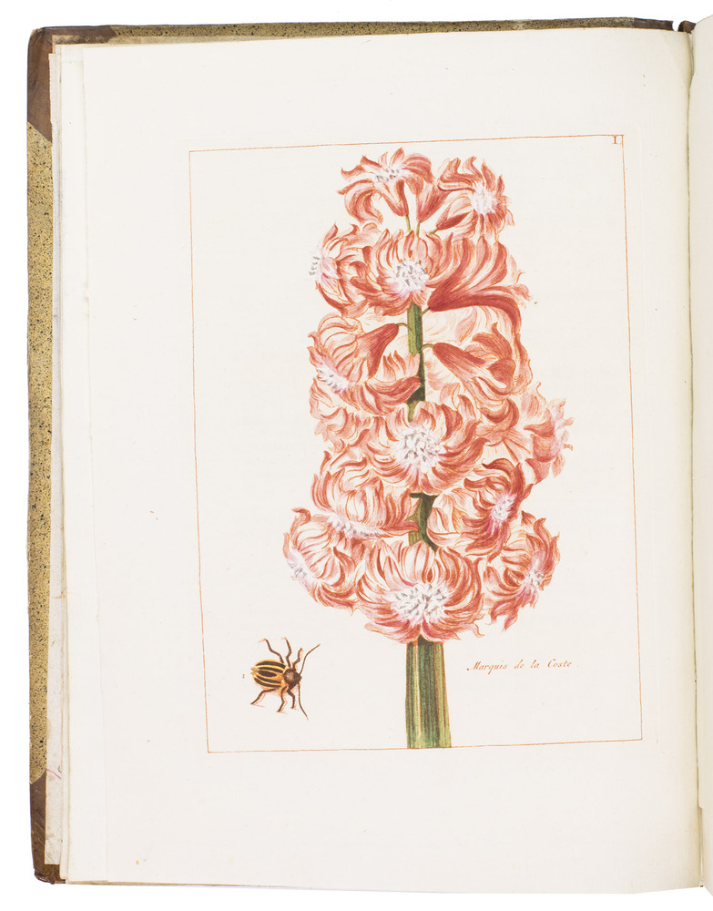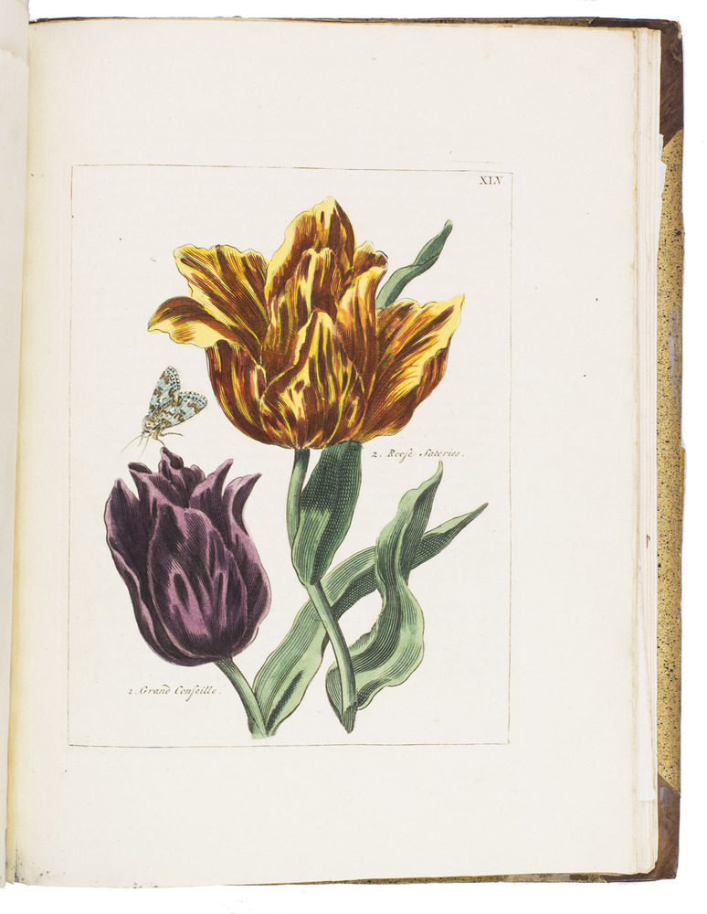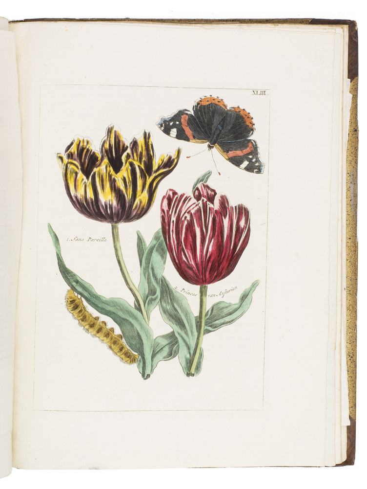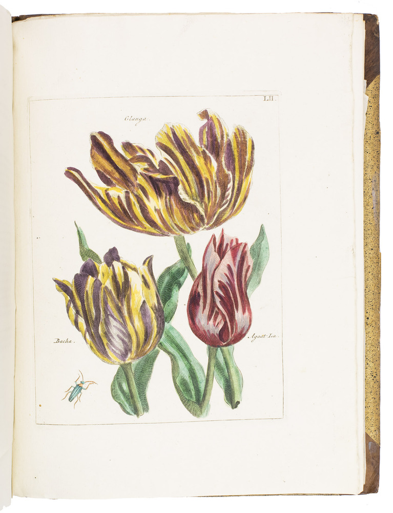 First edition of a splendid Dutch flower book with 54 vividly hand-coloured plates of flowers, which have been very well preserved. The work clearly demonstrates the superiority of Dutch horticulture at the time. According to Hunt, the plates "effectively illustrate both the beginning of tulip culture and the period when the cultivars of the double hyacinth are said to have numbered one thousand. ... The three double hyacinths of plates 1-3 were no doubt recent varieties, for they do not occur in Saint-Simon's list of 1767." Other than tulips and hyacinths, the plates also depict roses, auriculas, lilies, crocuses, and many others. The plates are accompanied by detailed botanical descriptions, with notes on classification, breeding and distribution.