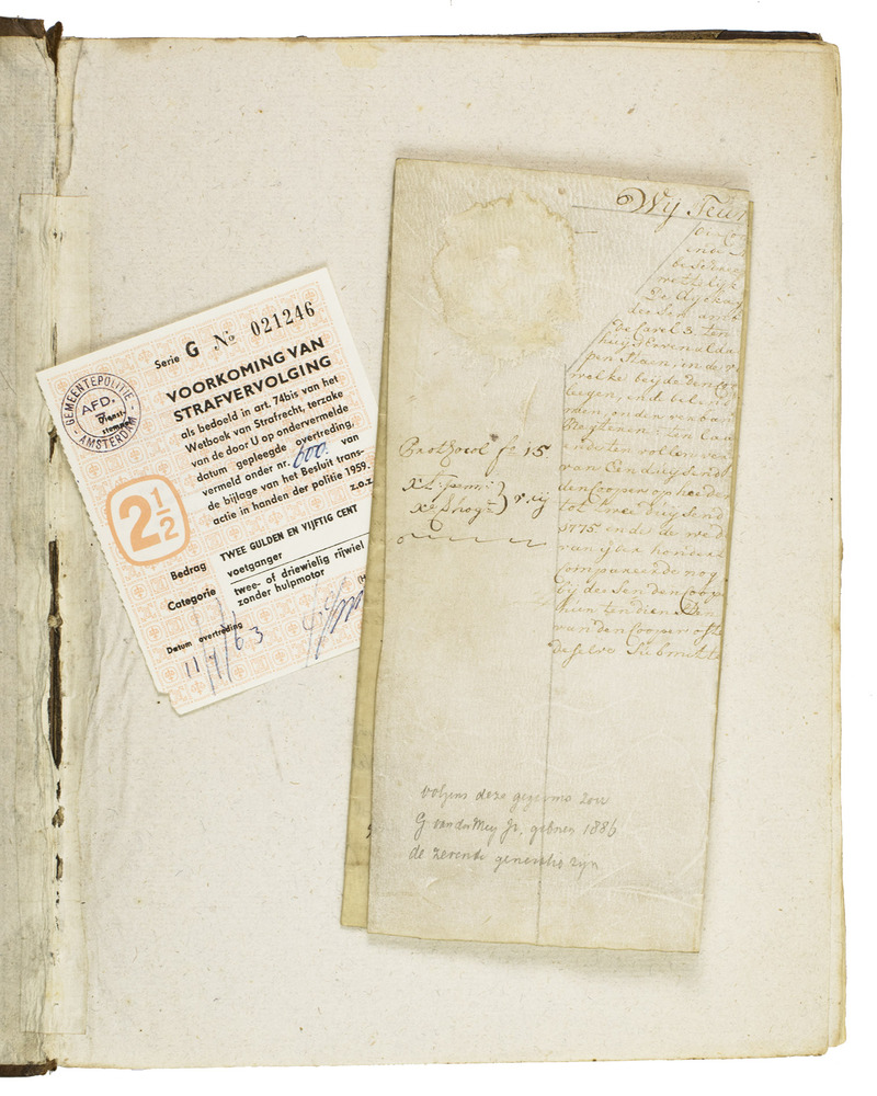 The present copy contains an official parchment document from 1773, which has been loosely inserted. The document details the sale of a portion of land in the village of Stompwijk, near Leiden, the Netherlands. The meeting took place in the presence of Teunis Visser and Dirck van Leeuwen, schepenen (municipal executives) of the Banne of Stompwijk. Although the archives of Stompwijk have been transferred to the city archives of Leidschendam and Leiden, the present document apparently was not a part of it. It is possible that the first owner of the present work was one of the men involved in this sale.