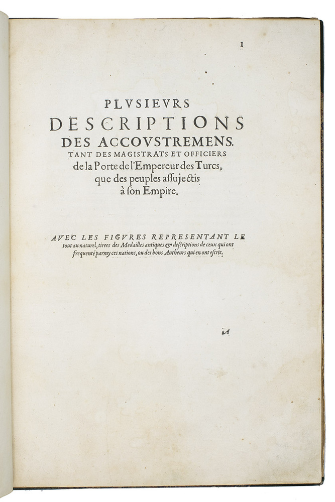 Plusieurs descriptions des accoustremens, tant des magistrats et officiers de la Porte de l' Empereur des Turcs, que des peuples assujectis à son Empire. Avec les figurs des representant le tout au naturel, tirees des medailles antiques & descriptions de ceux qui ont frequenté parmy ces nations, ou des bons autheurs qui en ont escrit.