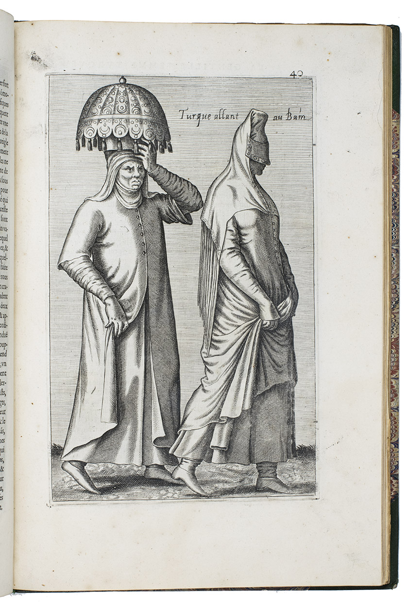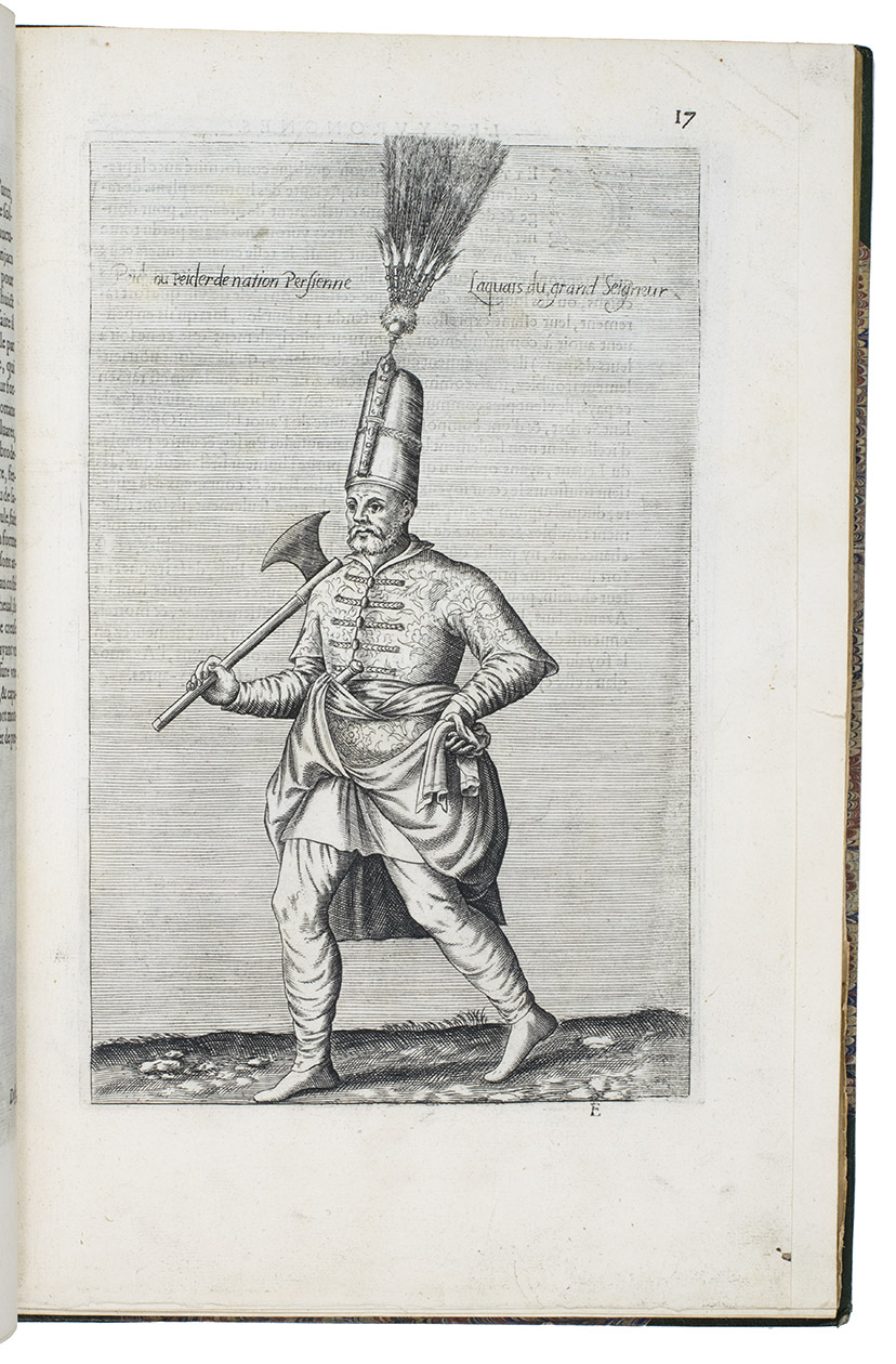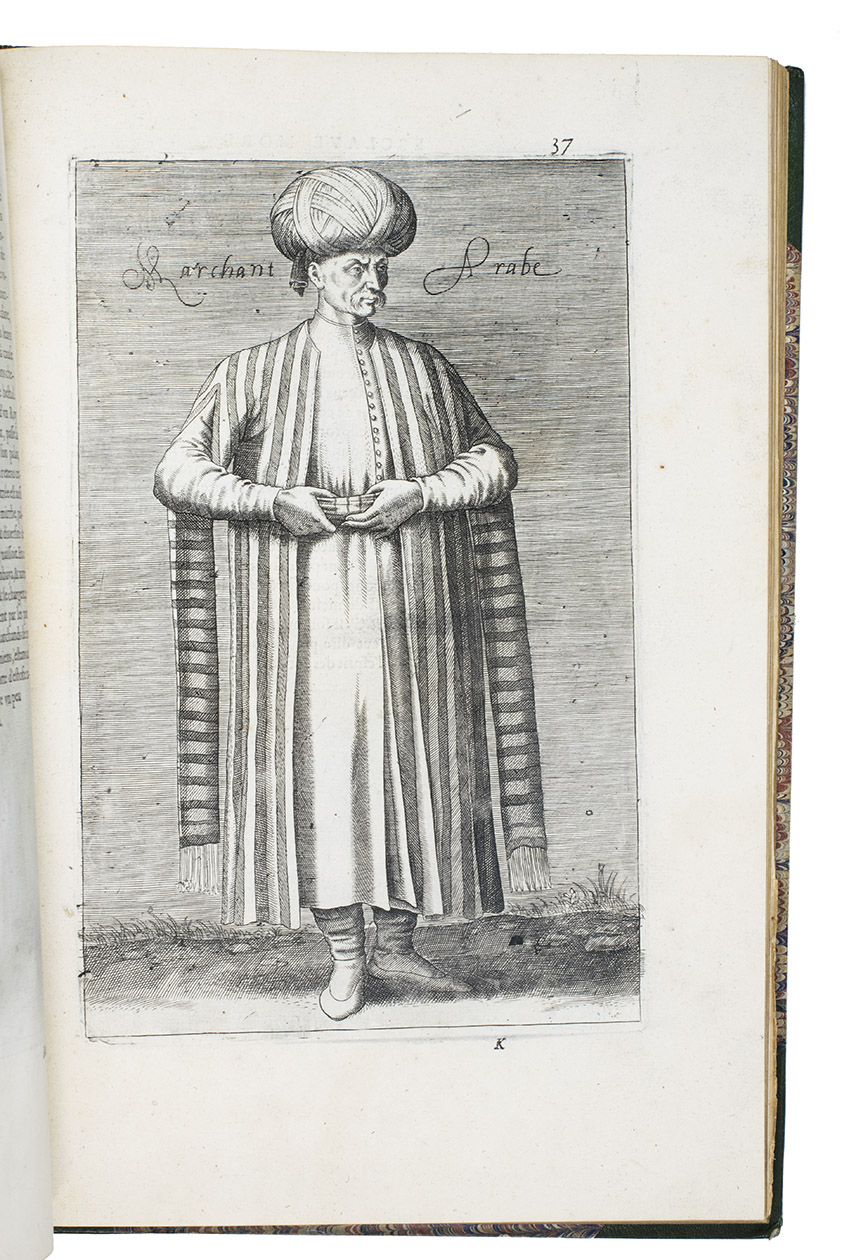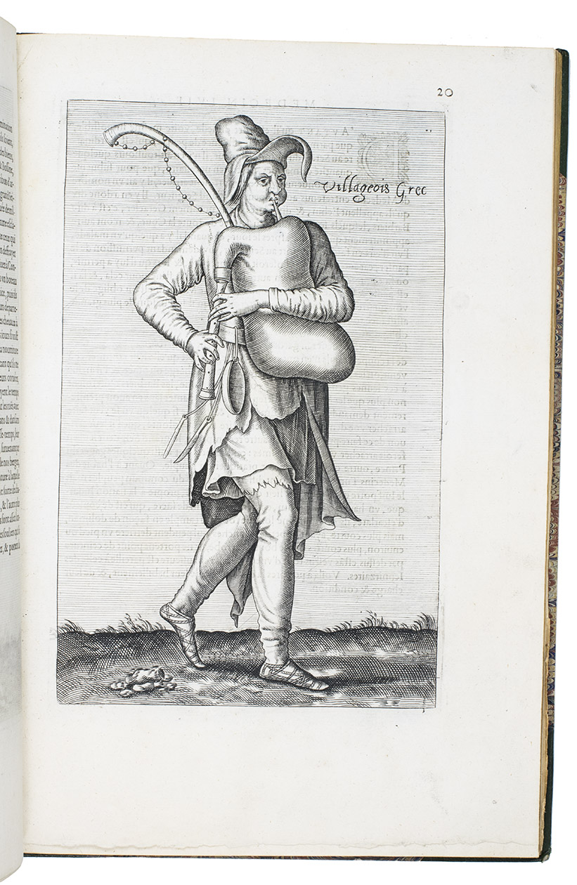 [Paris, widow of Abel L'Angelier, 1620]. 2 parts in 1 volume. Folio. With 79 engraved plates, including 62 costume plates (ca. 27.5 x 17.5 cm) after Nicolas Nicolay. With an additional loosely inserted engraving of a "Marchant Juif". All the plates have explanatory texts on the versos of the preceding plates. 19th-century green half morocco. "64" [=65] ll., 65-114, [3], [1 blank] pp.
