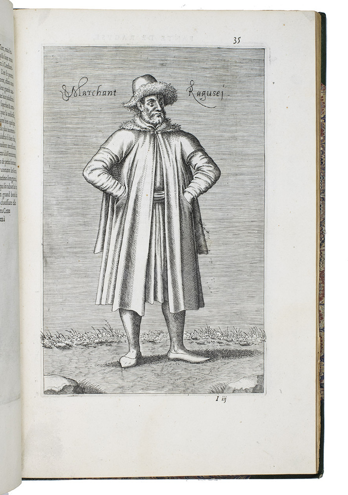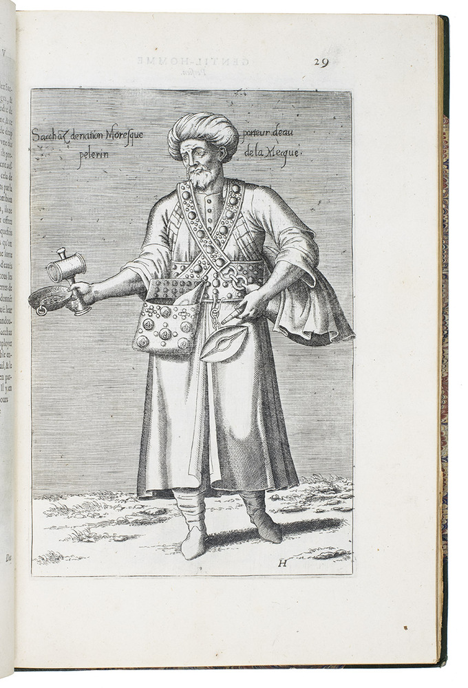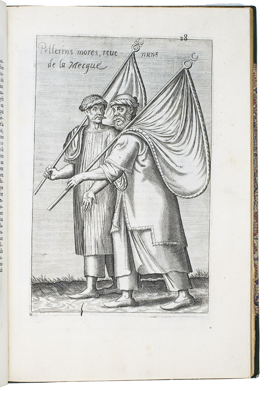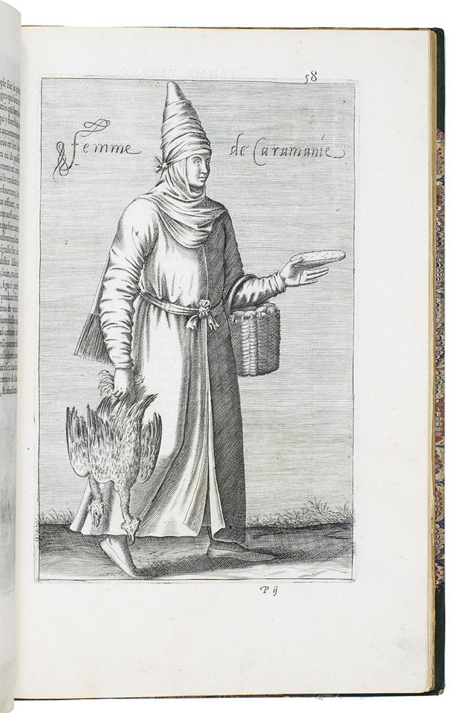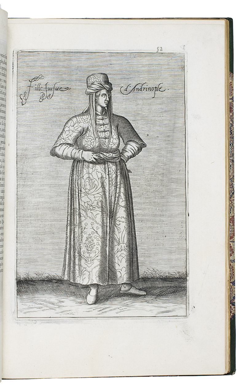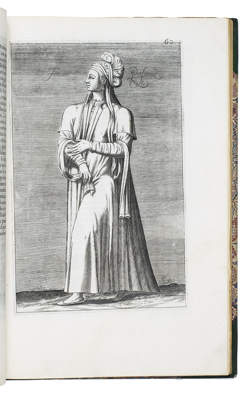 [Paris, widow of Abel L'Angelier, 1620]. 2 parts in 1 volume. Folio. With 79 engraved plates, including 62 costume plates (ca. 27.5 x 17.5 cm) after Nicolas Nicolay. With an additional loosely inserted engraving of a "Marchant Juif". All the plates have explanatory texts on the versos of the preceding plates. 19th-century green half morocco. "64" [=65] ll., 65-114, [3], [1 blank] pp.